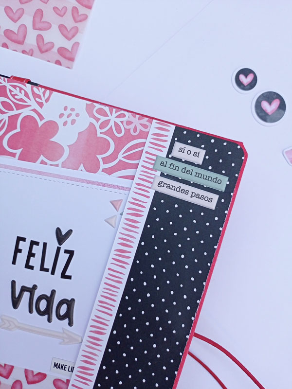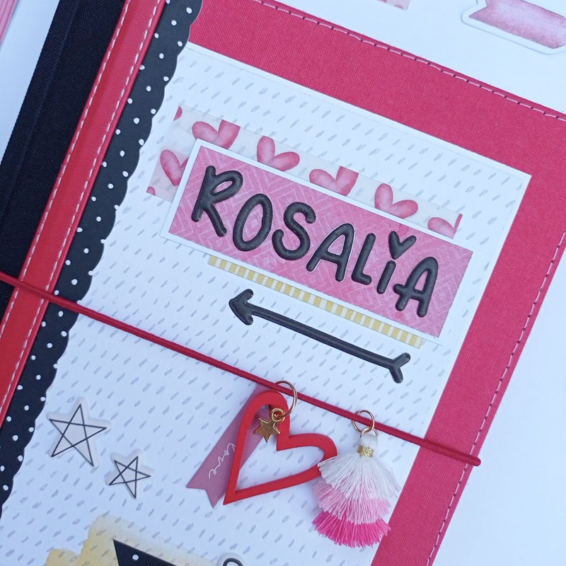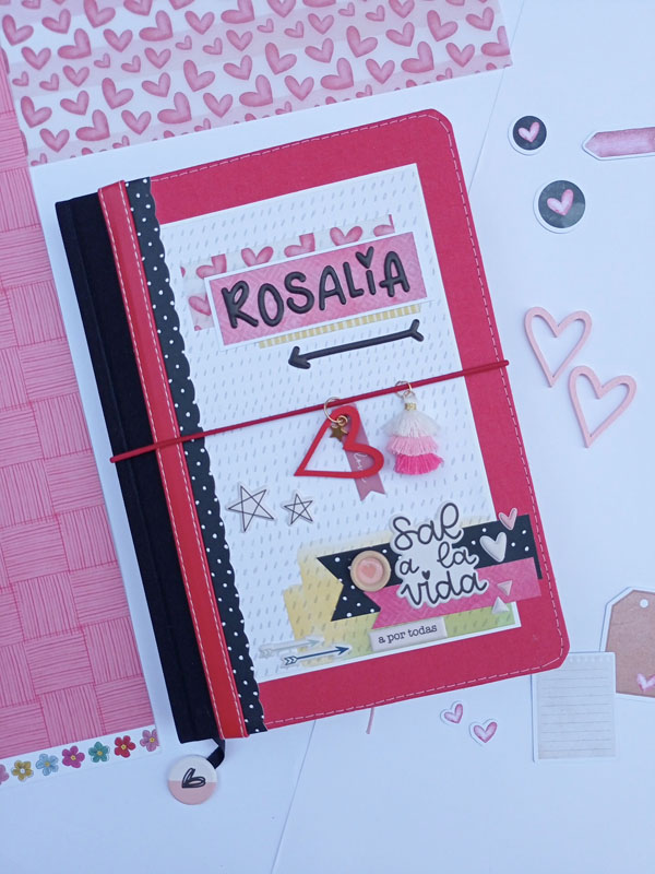 Es una libreta decorada forrada y cosida con tela roja. El lomo con tela negra y con una tira de ecopiel roja cosida en el lateral. He utilizado la colección «Better Together» de Amy Tangerine y un papel velum de Amelie. Las frases y detalles en puffy son de Duna y las frases impresas de The Mint Feather. De cierre una goma con cositas colgadas: Un Tassel de tres colores, un corazón de madera, una estrellita dorada… Su nombre, el título «Sal a la Vida, a por todas» y unos recortes de papel completan la decoración de la portada.