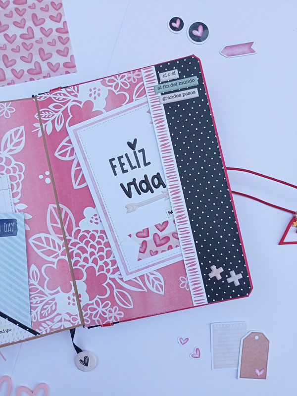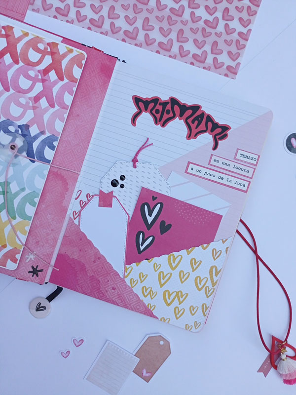 Por dentro también va forrada con papeles de la colección. En el interior de la portada lleva un desplegable con un brad a modo de cierre con un cordón, que al abrirlo muestra una solapa de velum con la frase «Recorrer el mundo» y un bolsillo. En la primera página «Motomami» que es el título de su último álbum troquelado en negro con un fondo rojo y unas frases: «Temazo», «Es una locura» y «A un paso de la luna»… En todos los bolsillos tarjetitas para escribir, decoradas con recortes de papel decorado. En la parte de detrás también papel decorado y más bolsillos con otros tags y una tarjeta que dice: «Feliz Vida»…