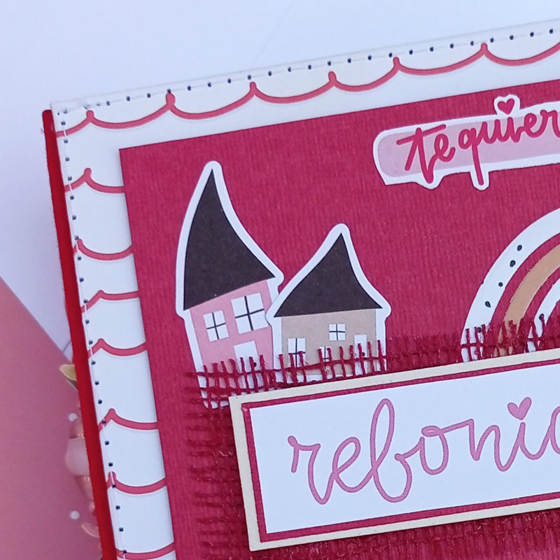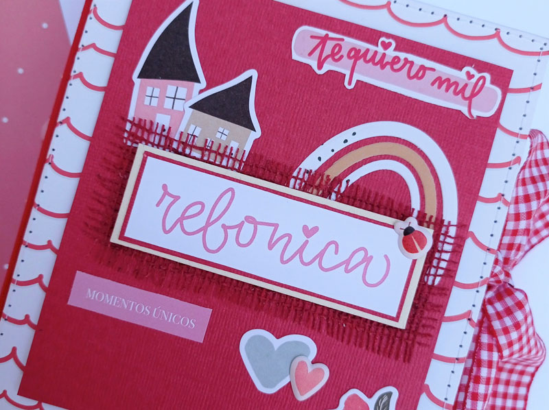 Es un álbum en tonos rojos súper alegre, como Pitiminí… En la portada he combinado el papel de ondas de la colección con cartulina roja texturizada, un lazo vichy de cierre, y la portada decorada con die cuts y troqueles de la colección. De título «Rebonica» con un trozo de tela de arpillera debajo. La estructura cosida. El lomo forrado en tela y decorado con bolitas y lentejuelas atadas a un cordón y cogidas al lomo con unos eyelets…