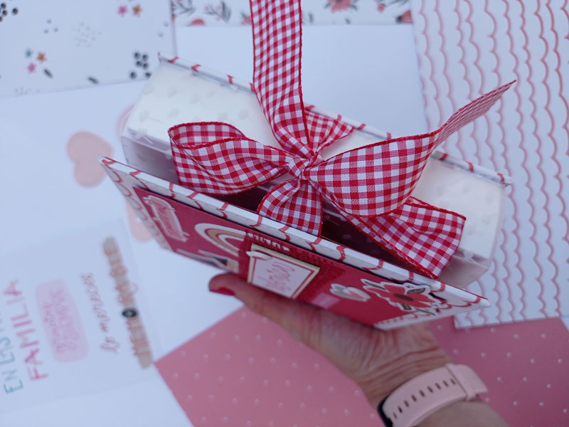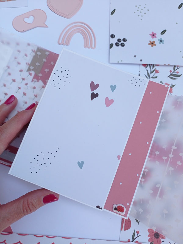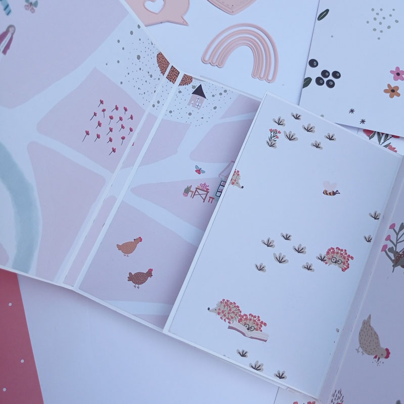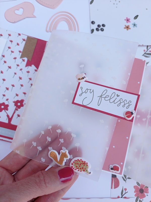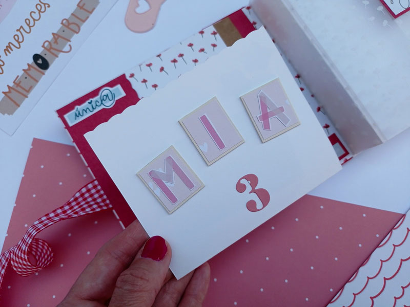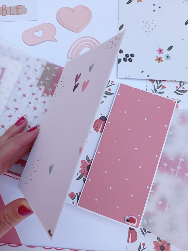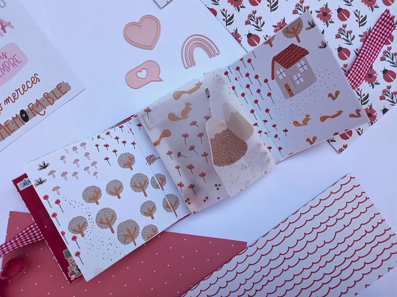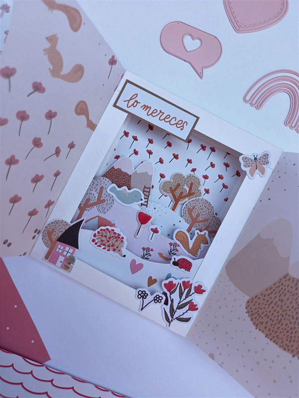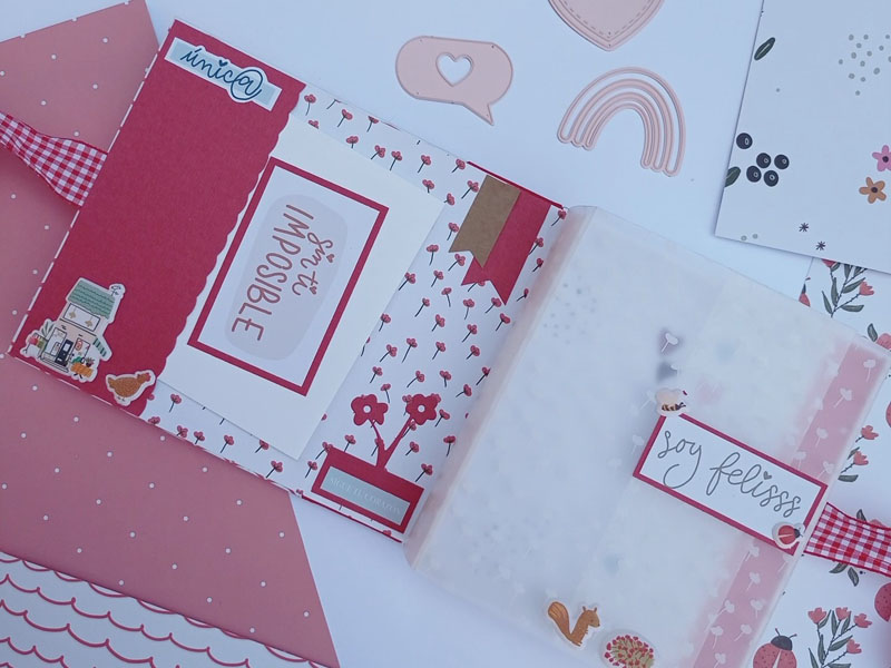El interior con una estructura diferente a lo habitual. Las hojas interiores se abren hacia la derecha y hacia la izquierda y lleva un acetato en el lomo interior, de manera que por fuera parece una caja. Y una vez has abierto todas las hojas del mini, hay un escenario hecho con el troquel 3d de la línea de básicos My Sweet… Con este troquel podéis hacer un marco a diferentes alturas, una tarjeta pop up, una portada de un álbum, o ponerlo en el interior de un mini como he hecho yo en esta ocasión… Lo podéis usar con cualquier colección y queda super cuki no os parece??!😋