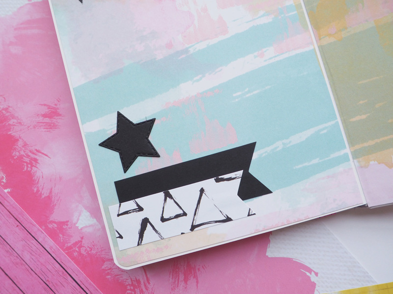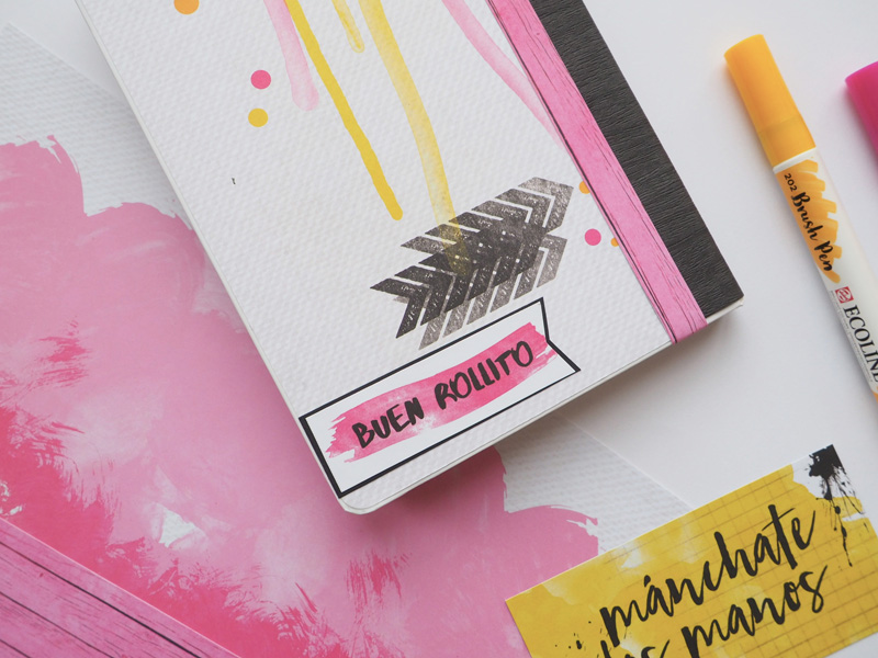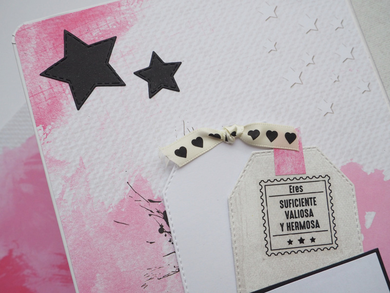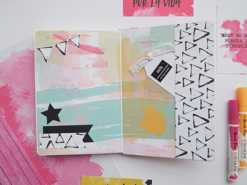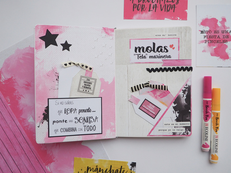 Para decorar la libreta he utilizado la colección Milk media de Paperinki. Una colección muy extremada y atrevida, con manchas de acuarela fucsia y amarillo con detalles en negro. He forrado el lomo con ecopiel negra y le he puesto el nombre también en negro, así como un trozo de lazo de picconela y un par de corazones troquelados. Y poca cosa más porque el papel ya es bastante colorido.