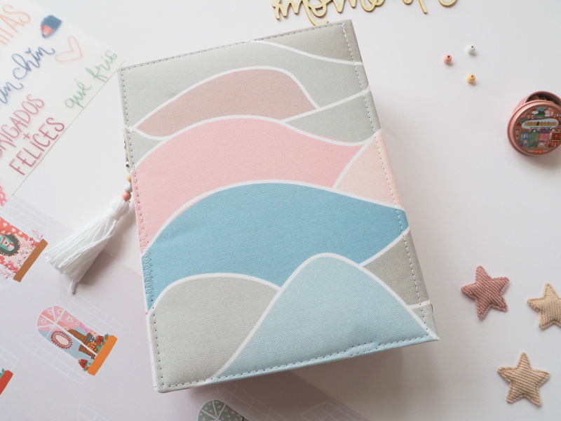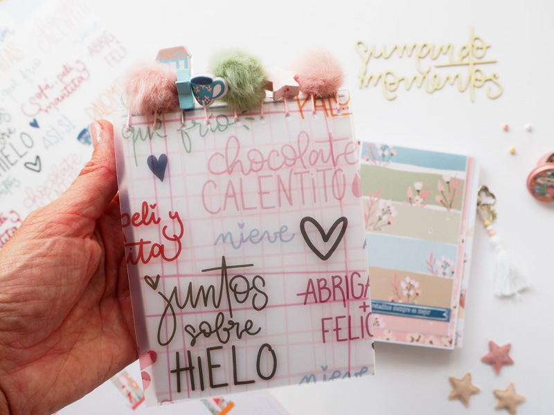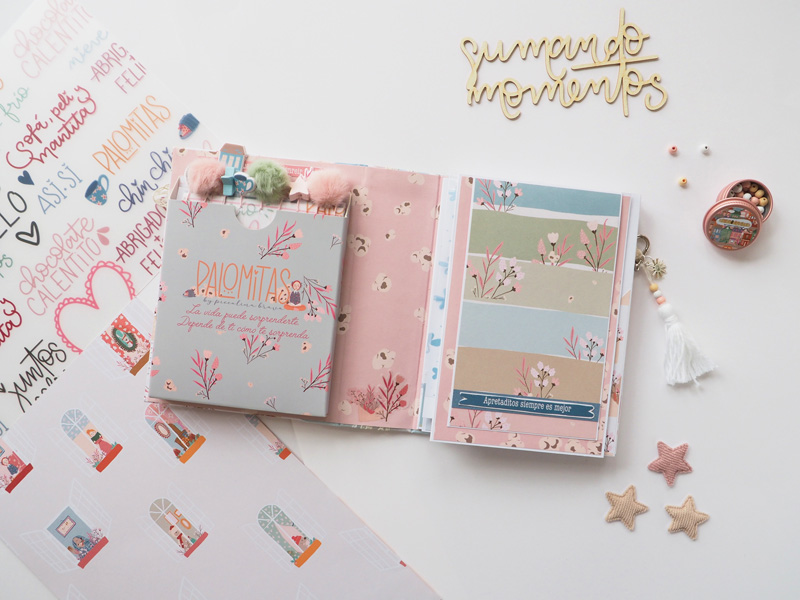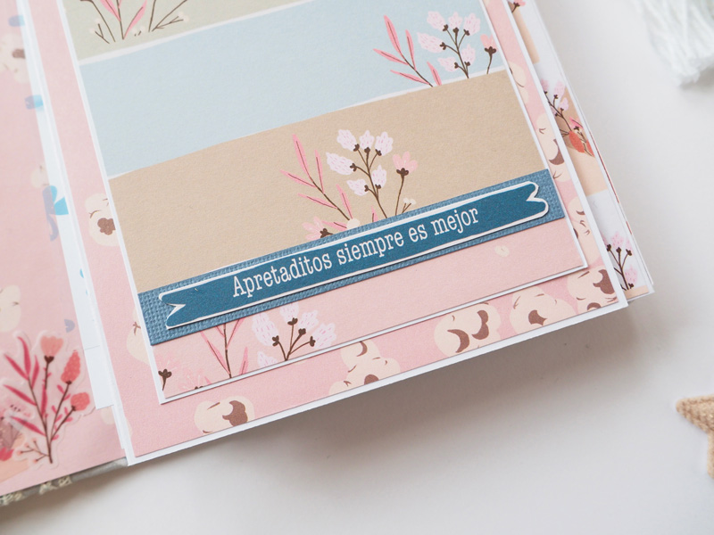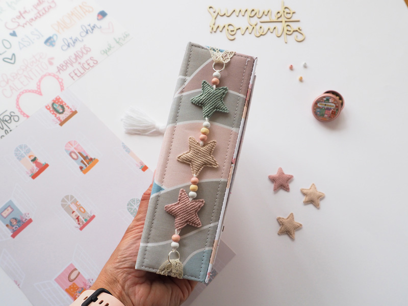 En este mini he usado la tela de encuadernar que trae la colección para forrar el lomo y la parte trasera del álbum. He cosido toda la estructura y en la portada le he puesto un cartón forrado y decorado con algunos die cuts, maderitas y la frase Juntos, Sumando momentos . En el lomo he puesto una tira de estrellas de tela combinada con bolitas de bisutería que trae la colección sujetada arriba y abajo con un trocito de lazo. El cierre un mosquetón con forma de corazón con un tassel colgado.