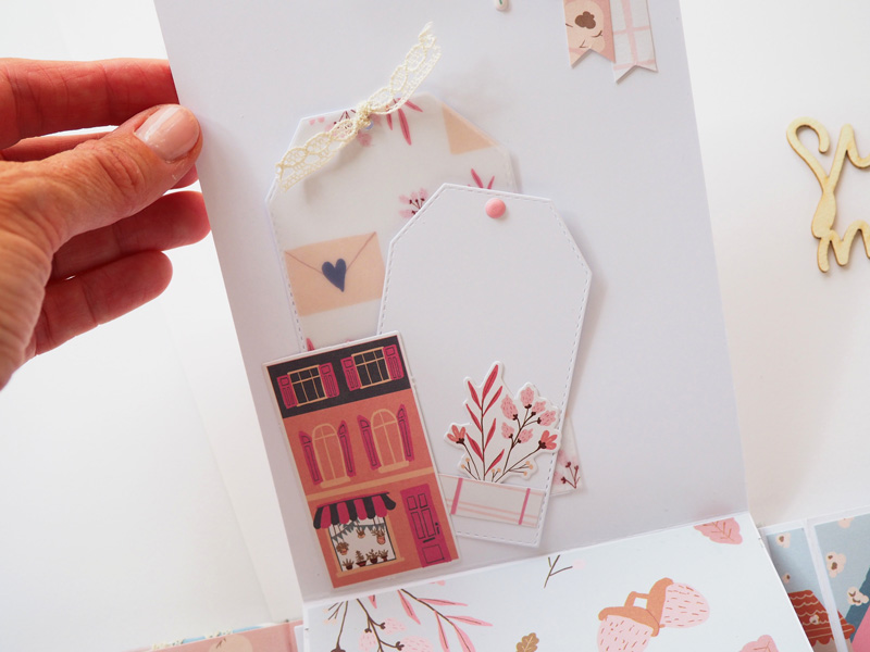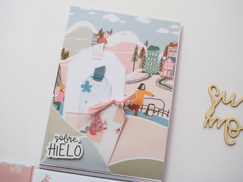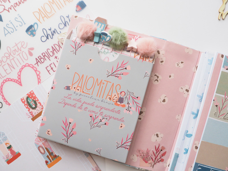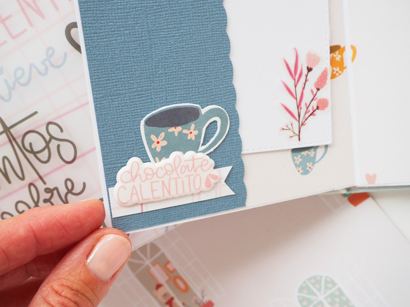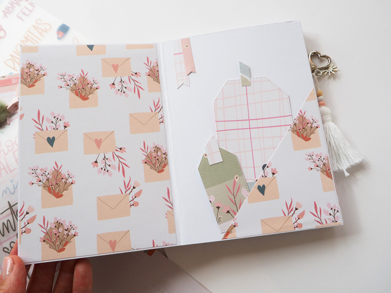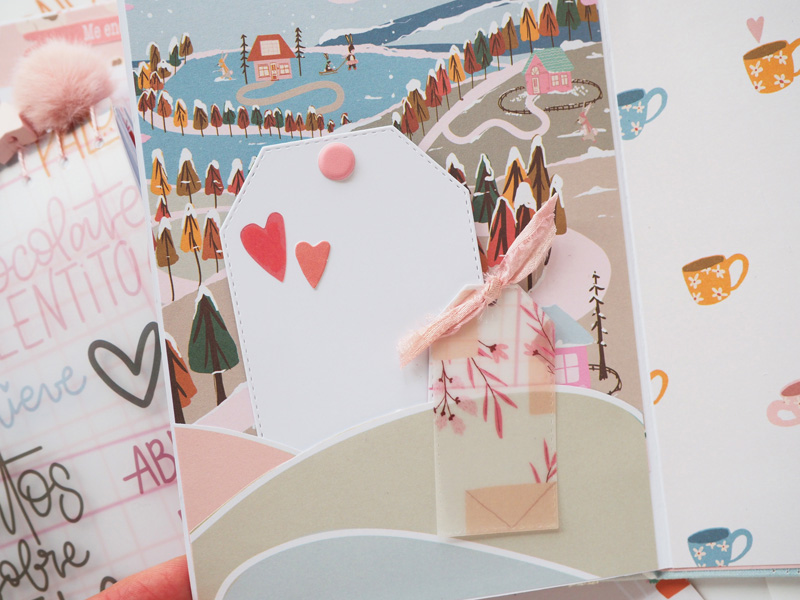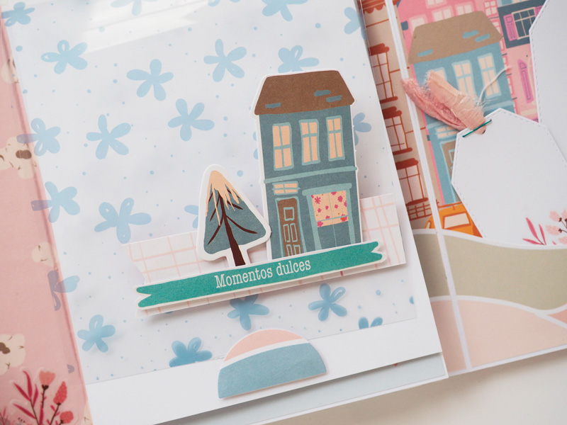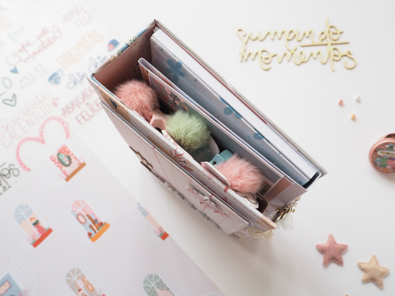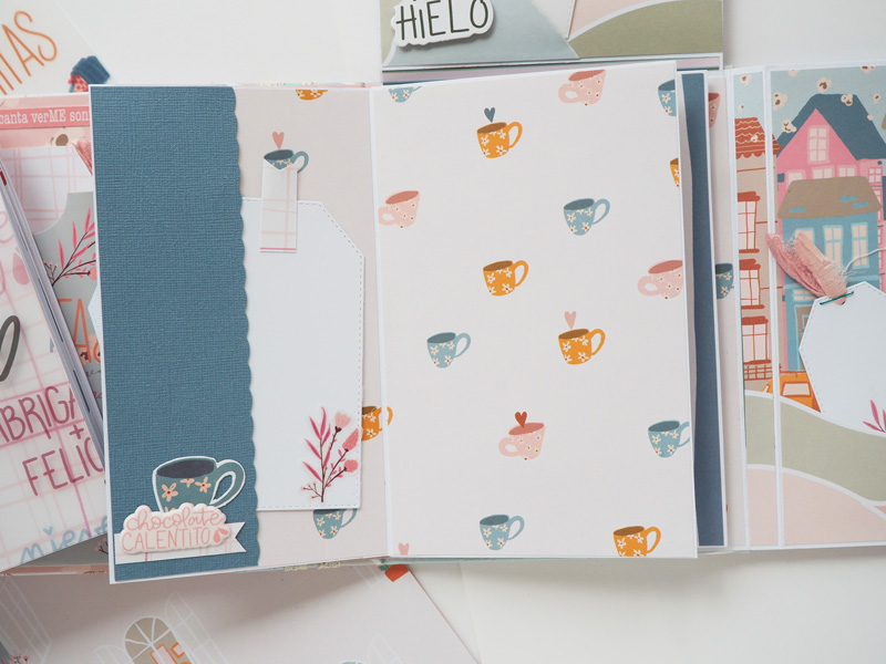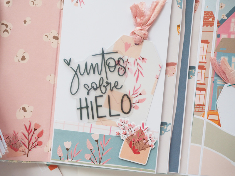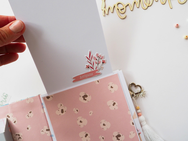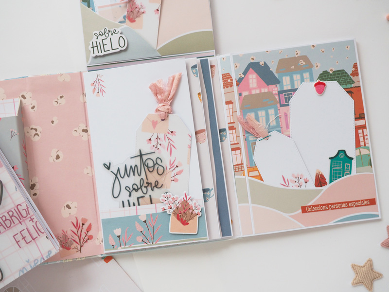 En el interior he hecho dos partes. En la guarda o contraportada izquierda he utilizado la caja de la coleccion que lleva los die cuts, rubbon y demás y dentro he puesto una libreta copta con cositas colgadas en la parte de arriba. En la parte derecha desplegables que abren en diferentes direcciones, decorados con papeles y diecuts, velum y acetato…. pero eso lo veréis mejor en este vídeo que os dejo aquí enlazado. Y por aquí tenéis todas las fotos del álbum, espero que os guste y os sirva de inspiración!