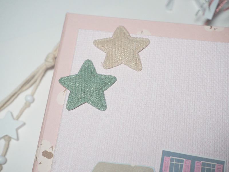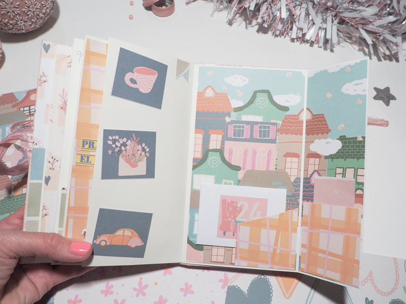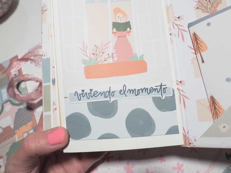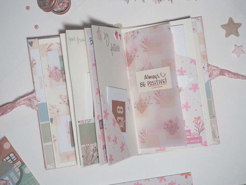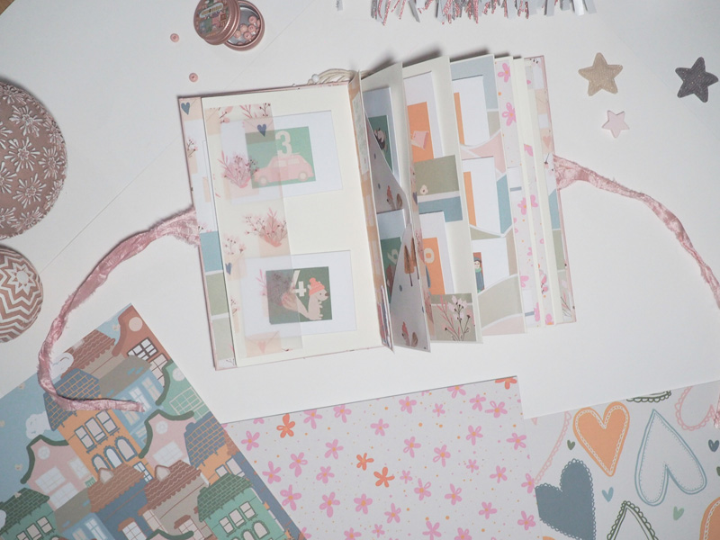 El que os enseño hoy es un mini álbum vertical con bolsillos y en cada bolsillo he puesto un sobre hecho con el troquel de Sami Garra… la estructura va forrada con el papel de palomitas, y un cartón sobrepuesto forrado con papel tepper y decorado con unos edificios recortados, un par de estrellas y la frases «Juntos en familia es mejor». De cierre un lazo y en el lomo he colgado una cuerda con una estrella de madera, un corazón y unas bolitas de las que trae la colección. Por dentro las hojas decoradas con trocitos de papel de la colección y los sobres llevan los números de uno de los papeles que sirve para hacer el calendario.