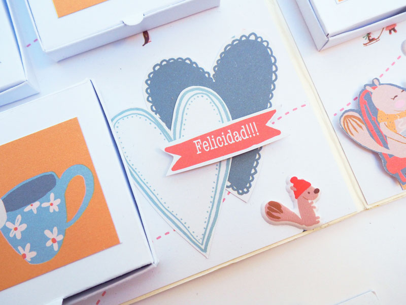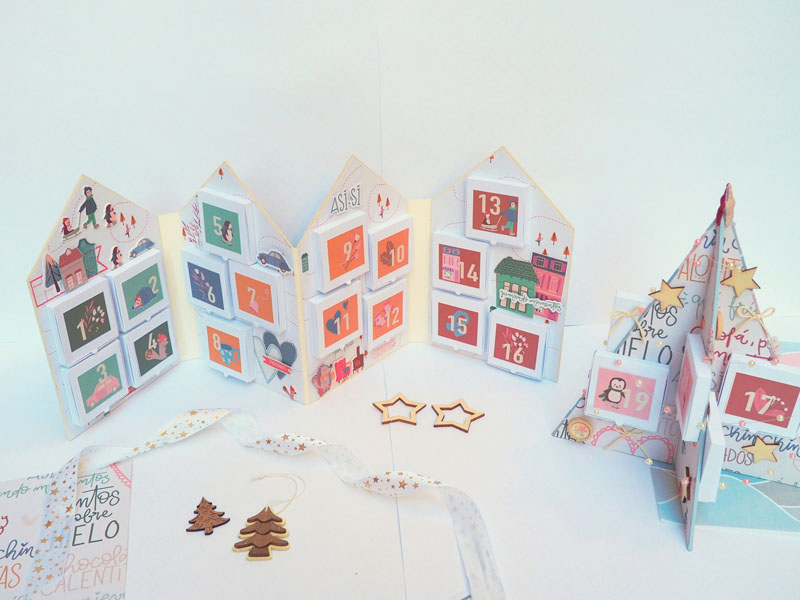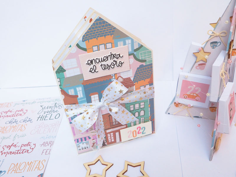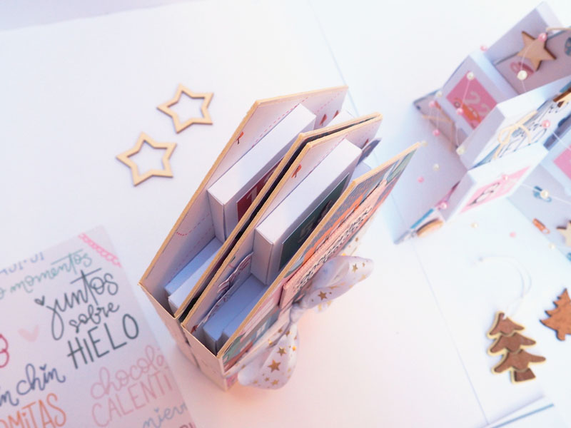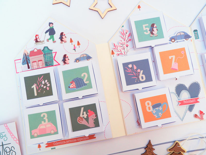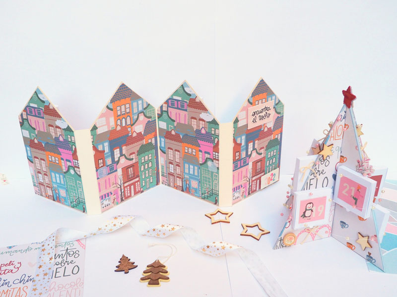 Un árbol y un desplegable con forma de casa lleno de cajitas hechas con el troquel de My Sweet Valentine y también decorado con la colección Palomitas de My Sweet. Una colección de invierno que sirve para cualquier ocasión :-). y un desplegable de la casa es súper fácil de hacer, porque tan solo recorté cartón con forma de casa, lo forré y uní las páginas con un lomo de 2’5 cm que es el grosor de dos cajas de pizza.