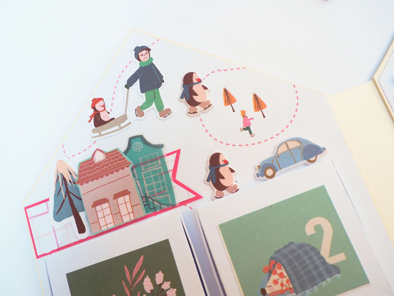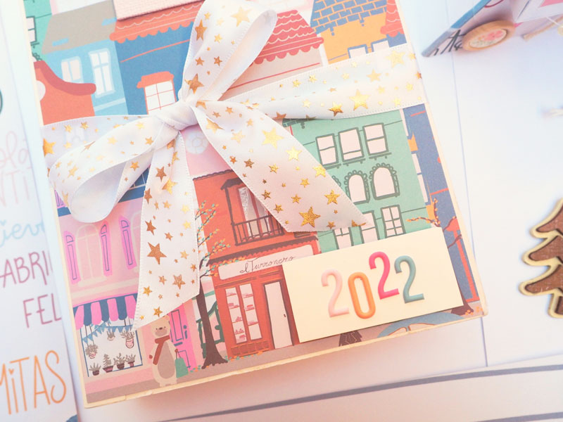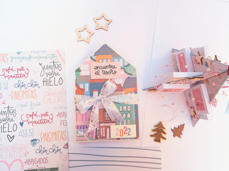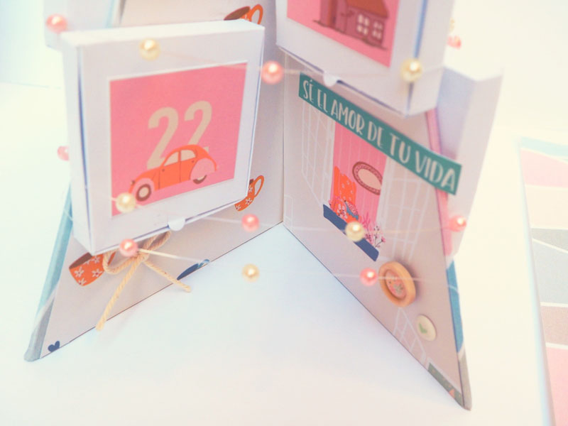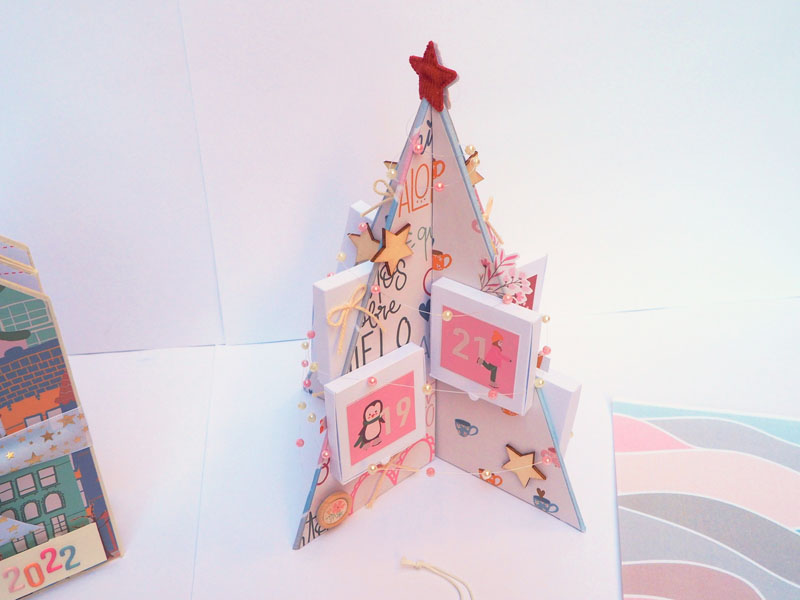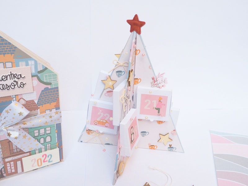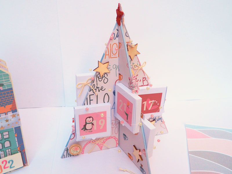 Un árbol y un desplegable con forma de casa lleno de cajitas hechas con el troquel de My Sweet Valentine y también decorado con la colección Palomitas de My Sweet. Una colección de invierno que sirve para cualquier ocasión :-). y un desplegable de la casa es súper fácil de hacer, porque tan solo recorté cartón con forma de casa, lo forré y uní las páginas con un lomo de 2’5 cm que es el grosor de dos cajas de pizza.