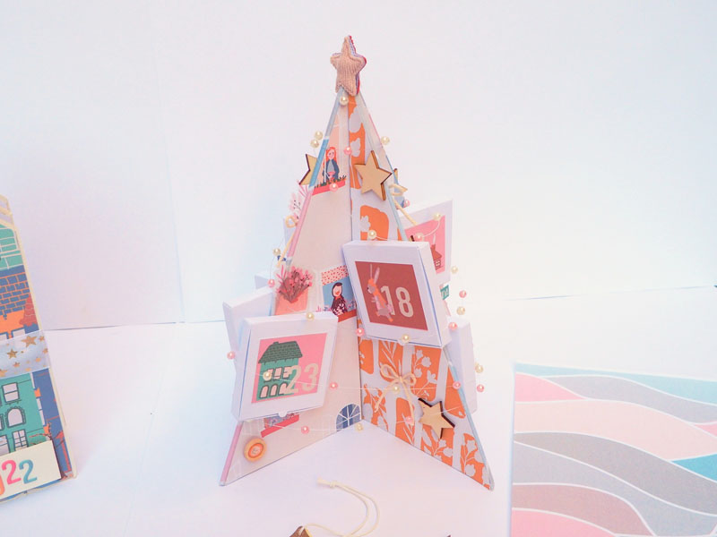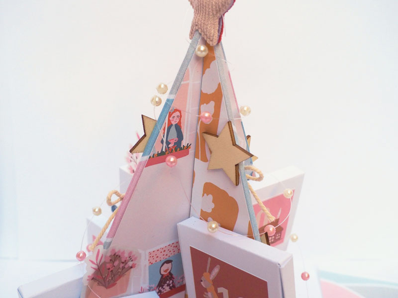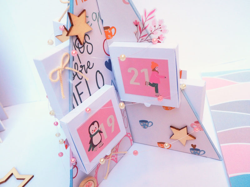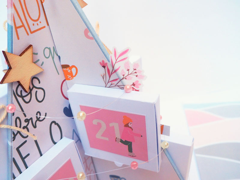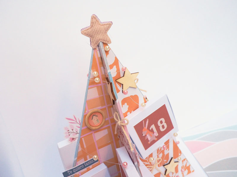 Y el arbolito también es sencillo, recorté dos triángulos en cartón, y a uno le hice una raja del grosor del cartón por la parte de debajo del árbol y al otro por la parte de arriba. Los forré con papel y los encajé de manera que se quedan de pie. Luego les pegué las cajas de pizza y lo decoré con hilo de pescar y dots como si fuera una guirnalda con las bolitas de navidad, y decoré con diecuts, estrellas, y alguna frase. Algo sencillo pero muy resultón, no os parece?