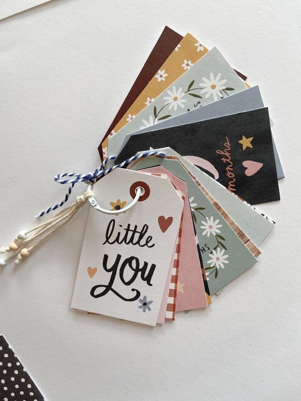 Esta colección lleva una hoja de tags con los 12 meses, para hacer fotos con el bebé o para utilizar en un álbum. Yo las he recortado y las he puesto con una anilla para que la mami de Oak las utilice como quiera 🙂