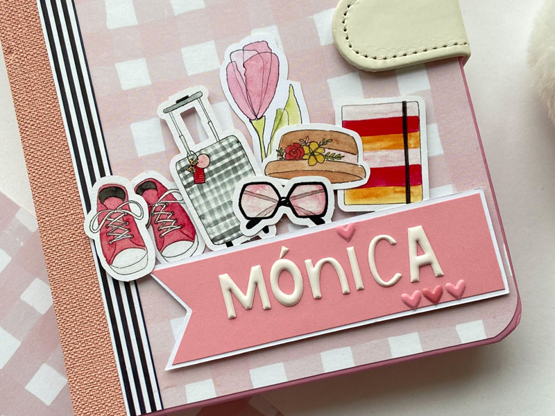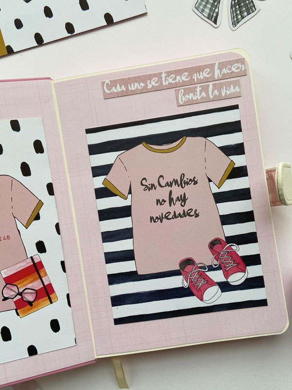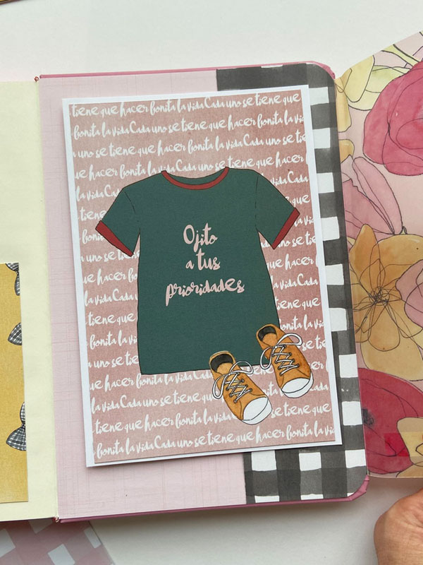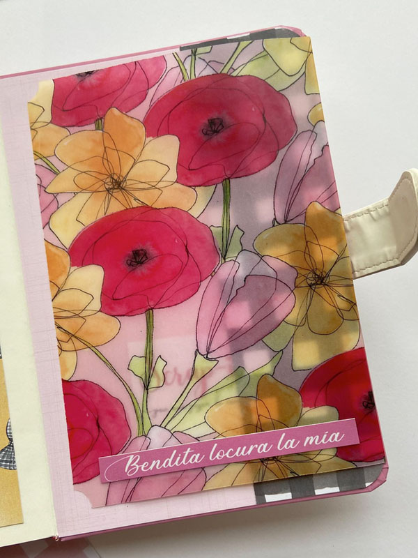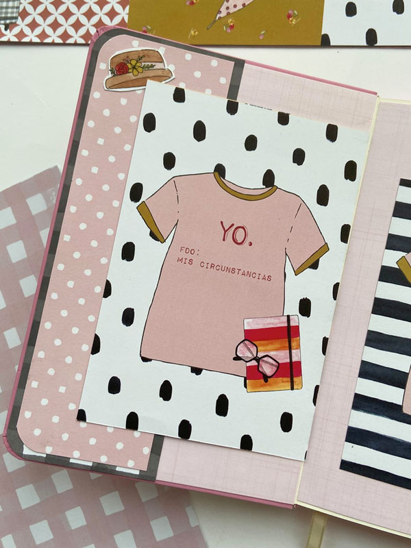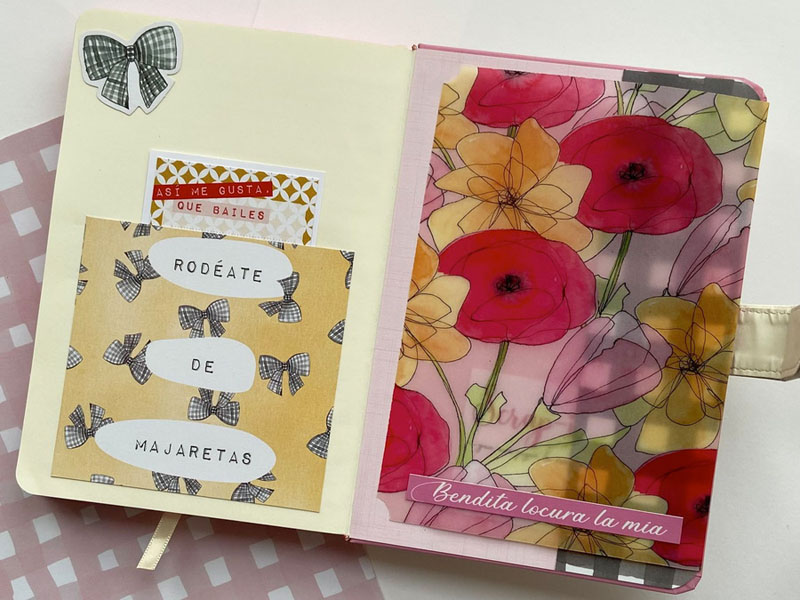 La portada forrada con el papel vichy en rosa, el lomo con papel tepper y una tira de rayas para tapar la unión y que sirva de decoración. En la parte de arriba un círculo con Piccolina y en la parte de abajo un banderín con el nombre y unos diecuts de decoración pegados con foam para darles relieve. Por dentro bolsillos y tarjetones con frases de la colección: » Casa uno se tiene que hacer bonita la vida», Sin cambios no hay novedades» o «Yo, firmado: Mis circunstancias»… en la parte de detrás un desplegable con velum y más bolsillos con más frases: «Rodéate de Majaretas» , «Así me gusta, que bailes», «Bendita locura la mía» y «Ojito a tus prioridades». En la parte de atrás el papel de corazones que es de la colección «Culo inquieto» pero que combina con la primera colección…