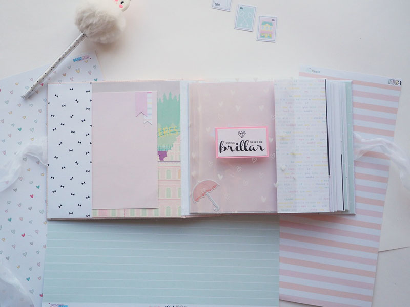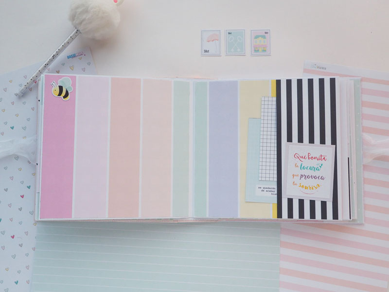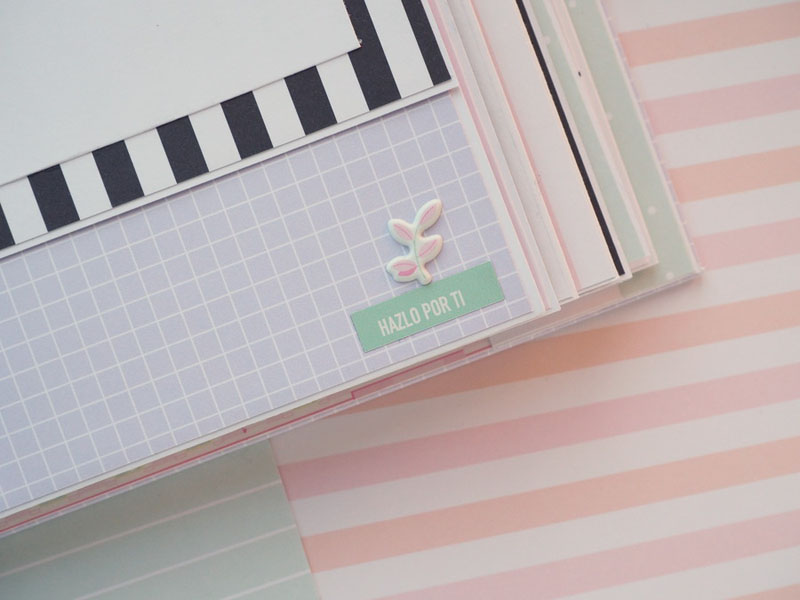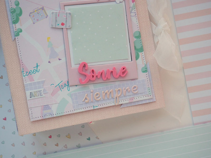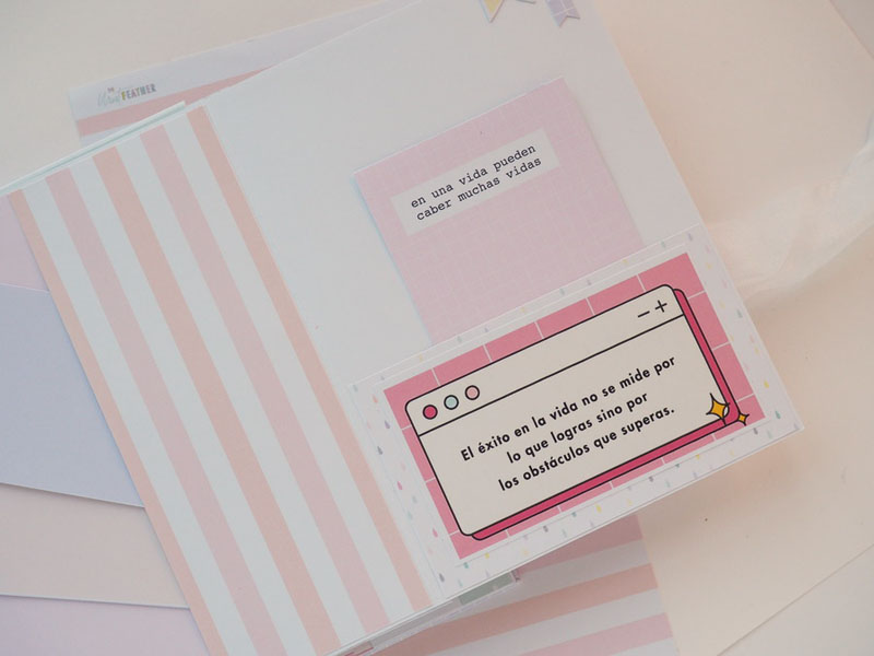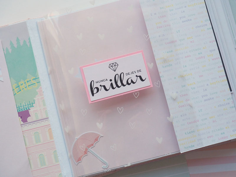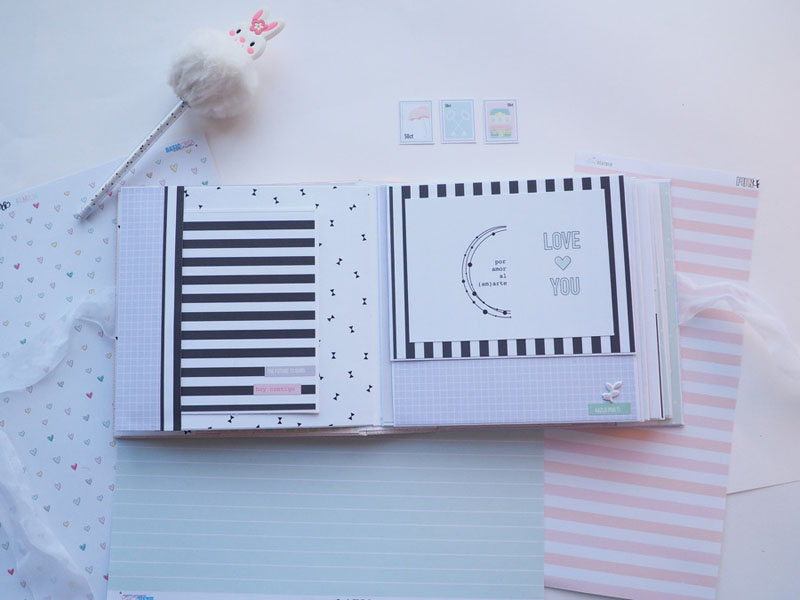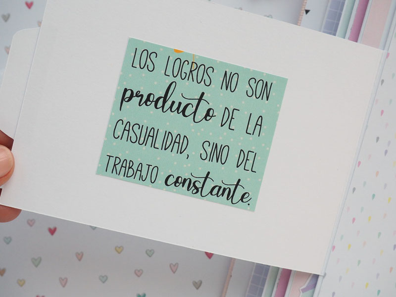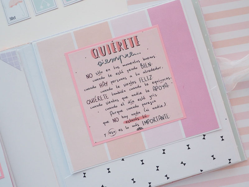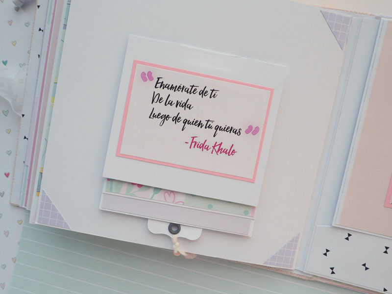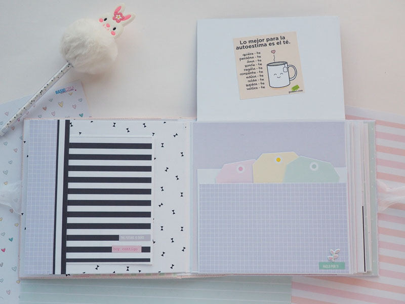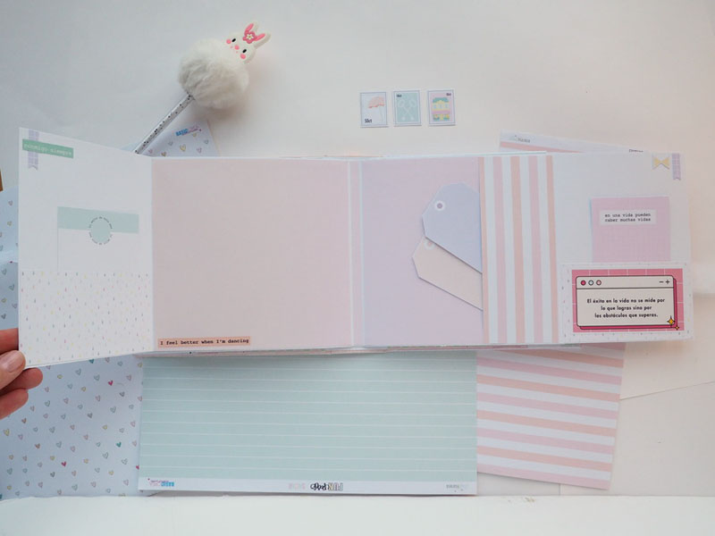 Es un álbum hecho con la colección Eres Arte de Adela de The Mint Feather que es una maravilla, en tonos pastel, muy dulce… un álbum con la portada forrada con papel tepper y cartones encima a modo de decoración, cosidos a máquina. Por dentro lleno de desplegables y bolsillos, llenos de tags con frases positivas y mensajitos de los que a mí me gustan. Lleva un par de hojas de acetato, una cascada que abre hacia arriba y decorado con los die cuts de la colección. Aquí tenéis un reels que colgué en instagram para que veáis el interior y ahora os dejo fotos: