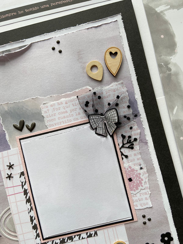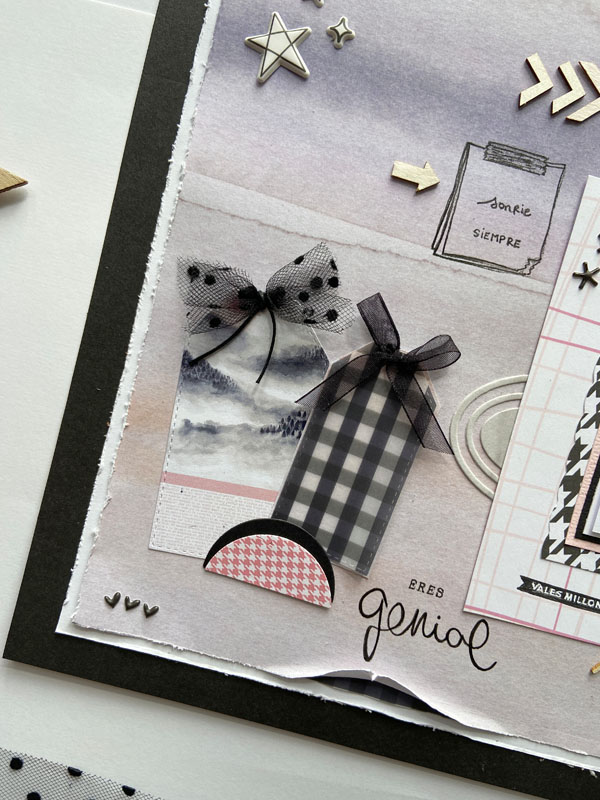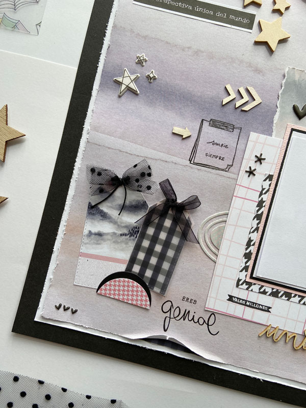 Una base negra, un papel blanco encima y otro decorado con acuarela… recortes de varios papeles de la colección, unos tags con lazos de tul, algún troquel, una frase de la colección: «siempre he tenido una perspectiva única del mundo», unas estrellas y flechas de madera, pegatinas de foam, unos sellos estampados, unos troqueles… es parecido al que le hice a mi peque hace unas semanas con esta misma colección… a ver que os parece: