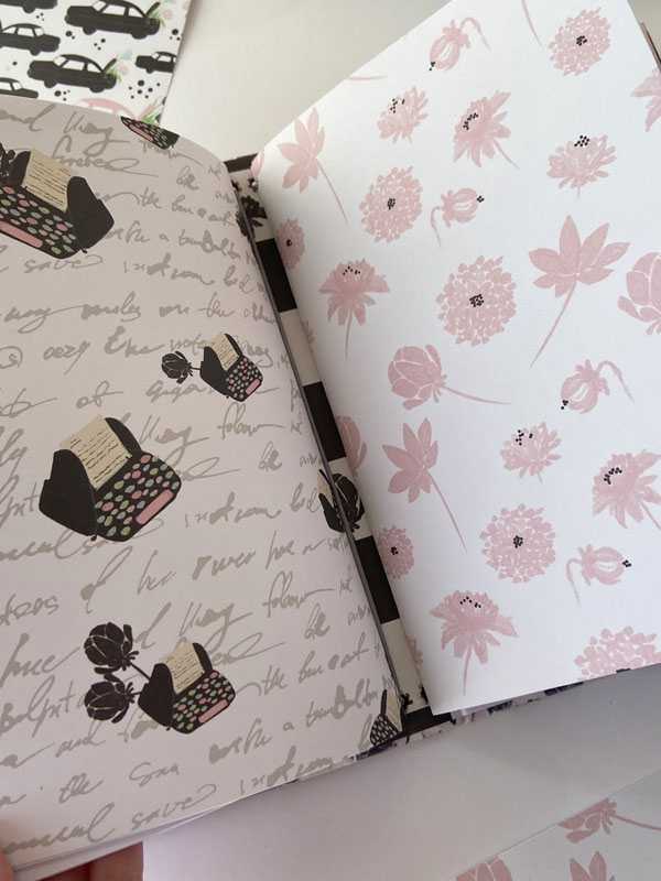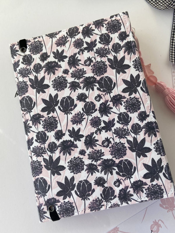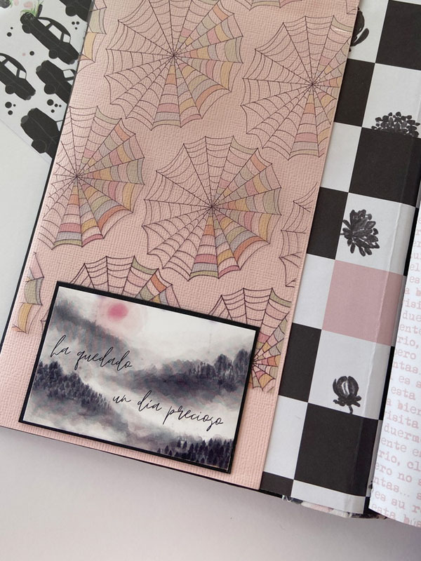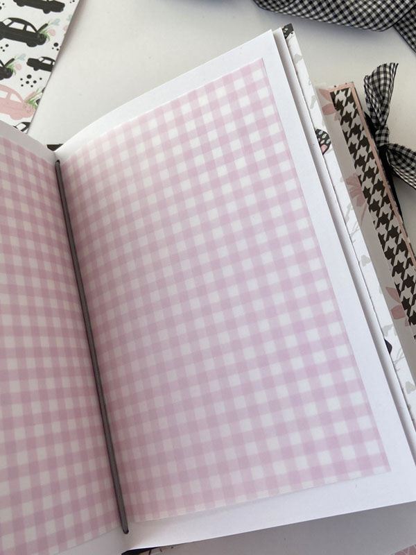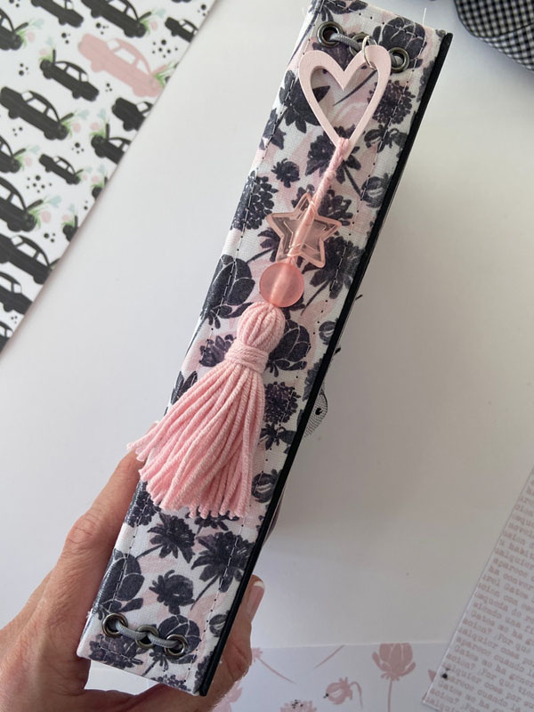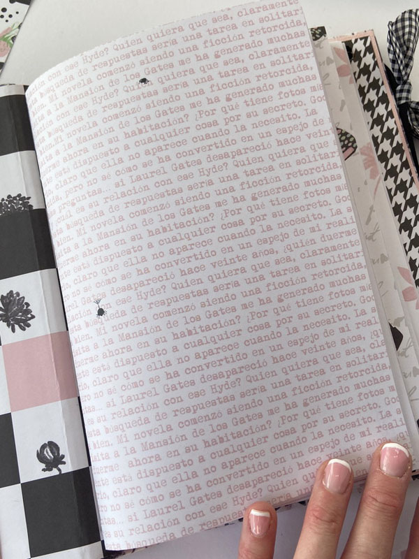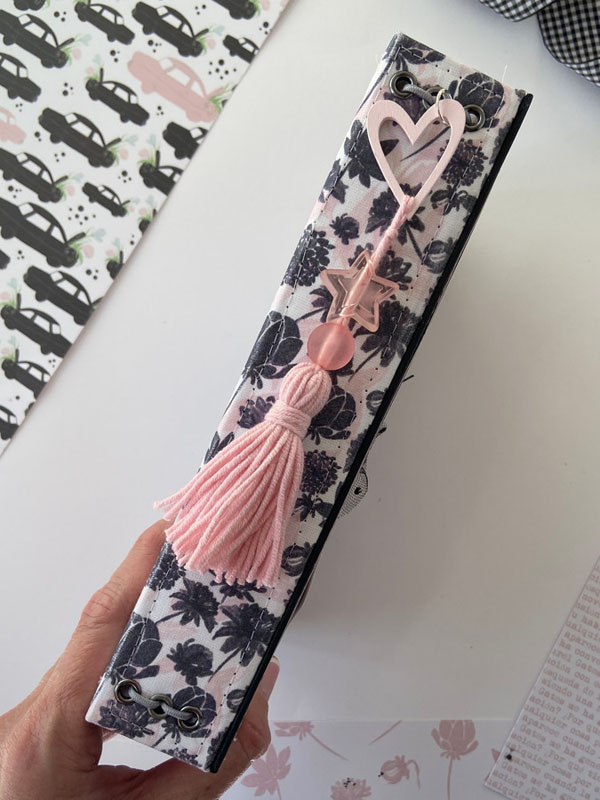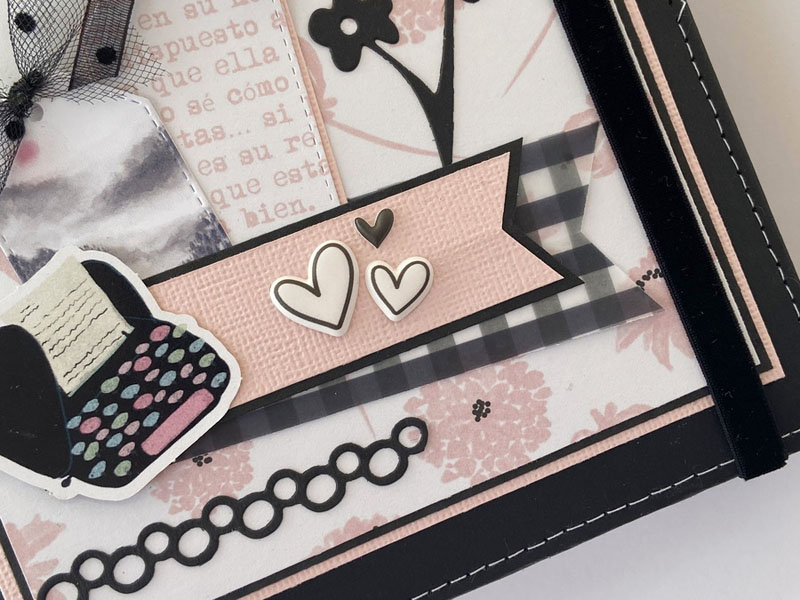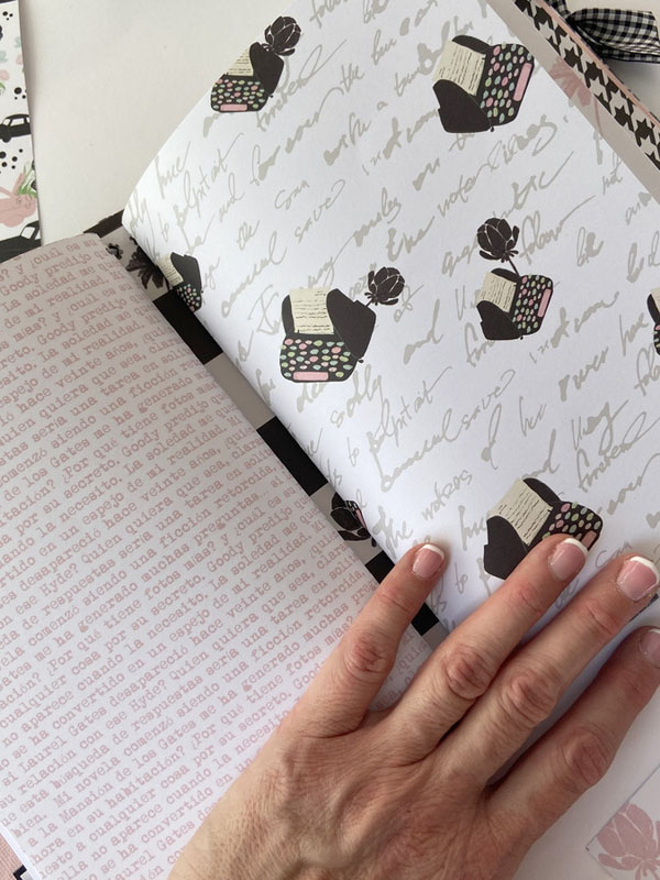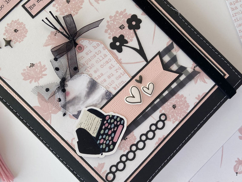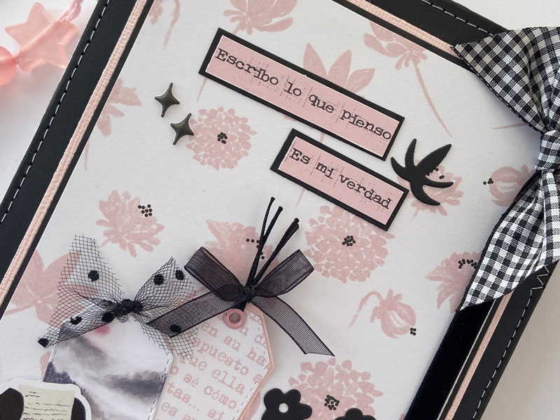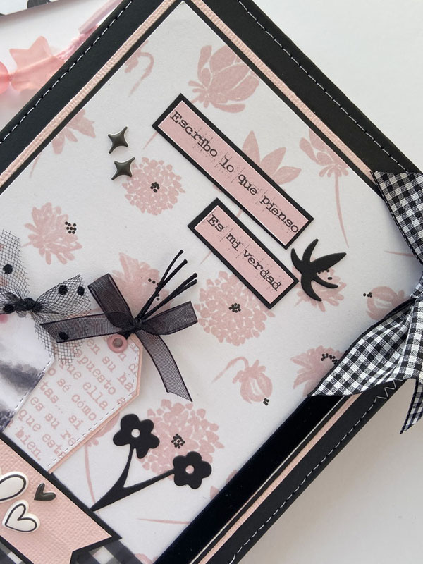 Es un midori para que mi niña lo use como diario, con hojas blancas en su interior sujetadas con gomas, para que pueda ir cambiándolas cuando las haya escrito… con una estructura como si fuera un álbum con la parte de delante en negro y la de detrás forrada con la tela de encuadernar de dalias. Un poco de guata para que quede acolchadito y cosido a máquina para darle un mejor acabado. La portada lleva cartulina rosa de base, negra encima y el papel de dalias rosas. De cierre una goma de terciopelo con un lazo de vichy. Decorada con la frase : «Escribo lo que pienso, es mi verdad» que le queda muy bien al ser un diario. Un par de banderines con tags y lazos, unos troqueles y algunos corazones de foam.