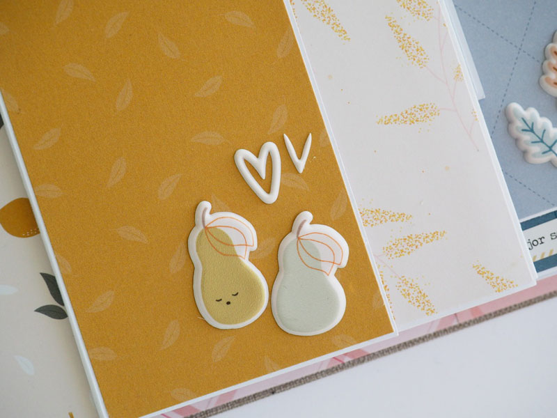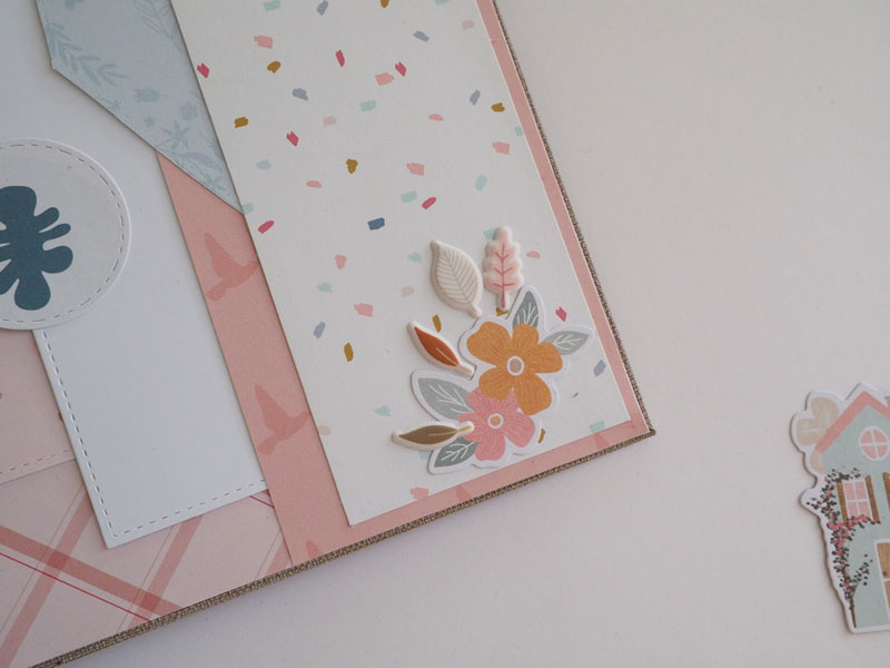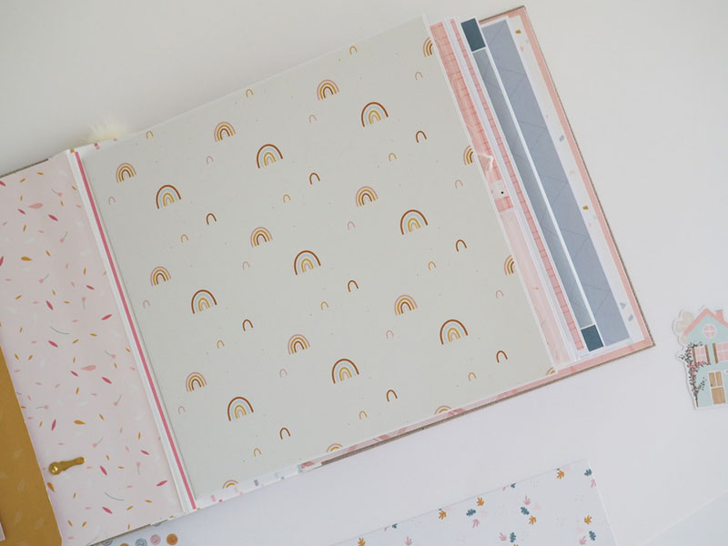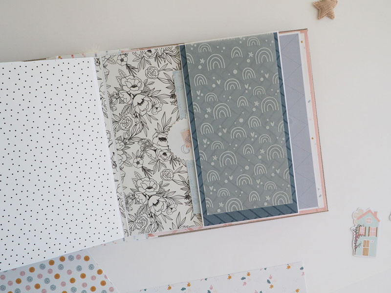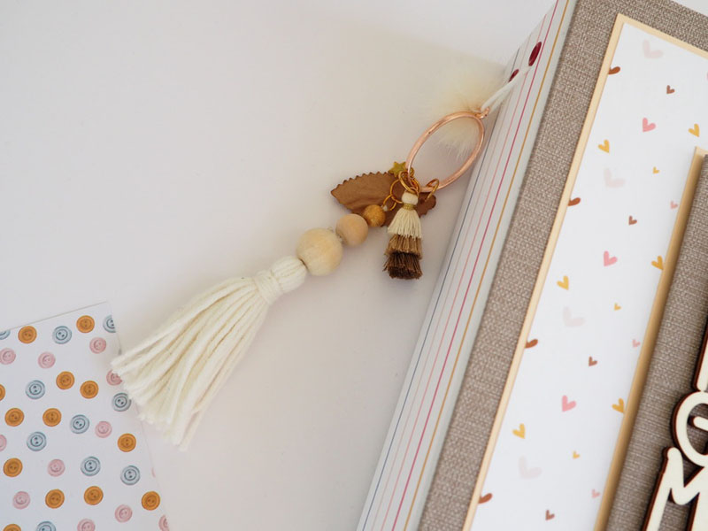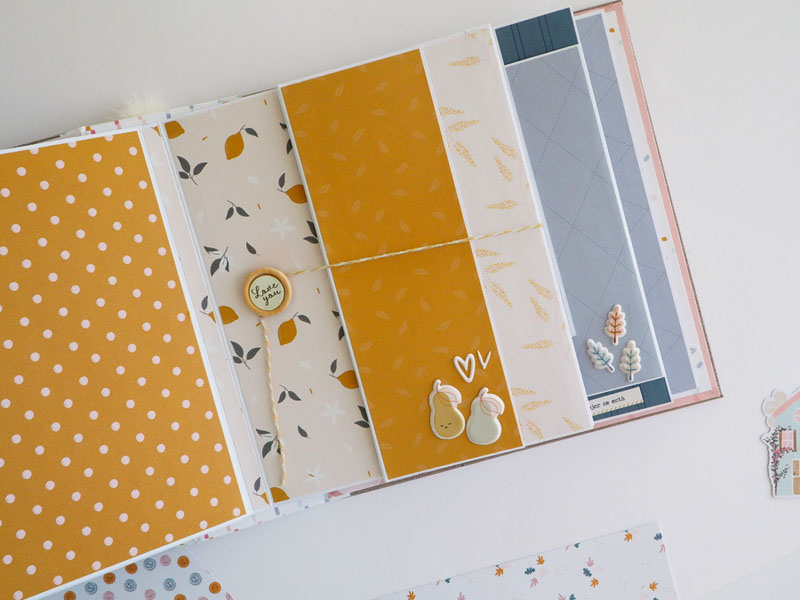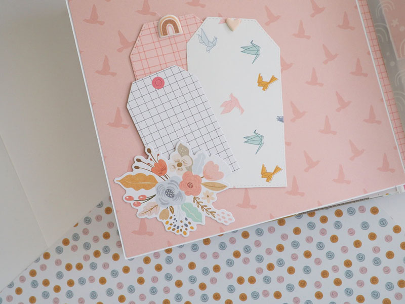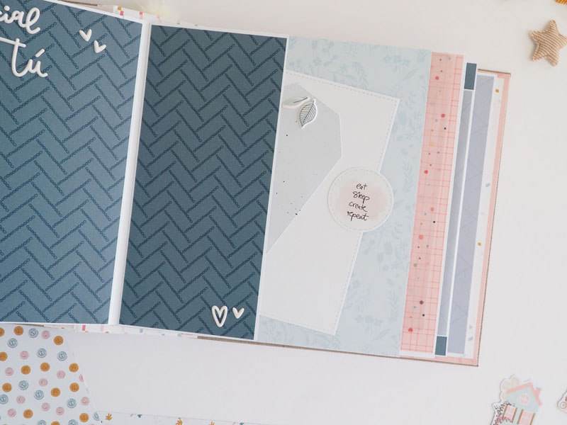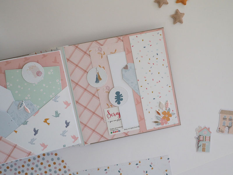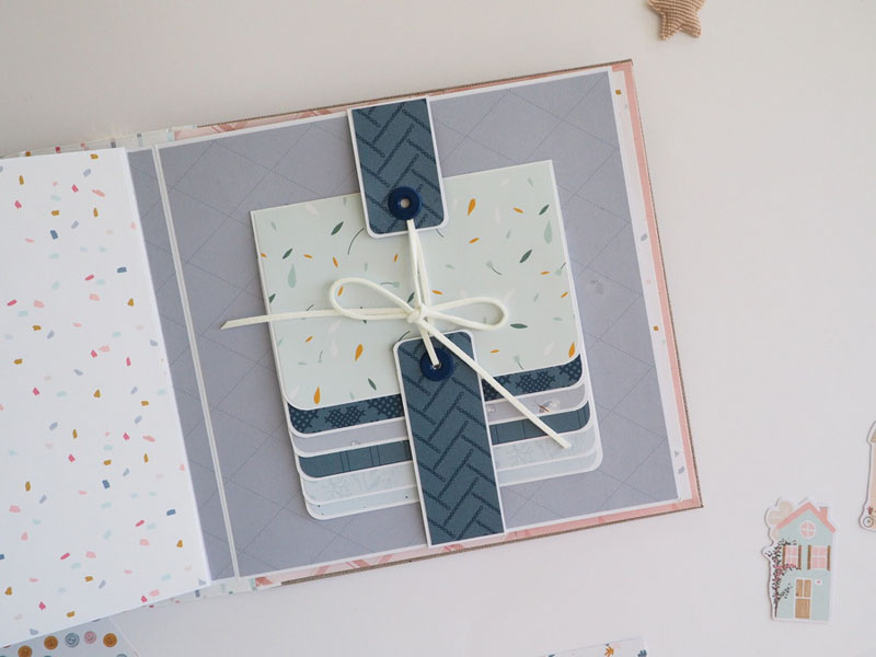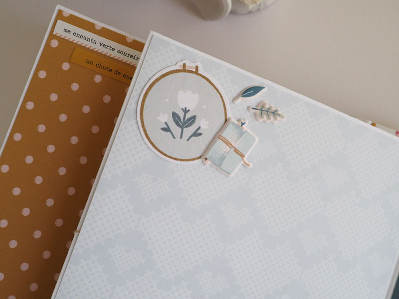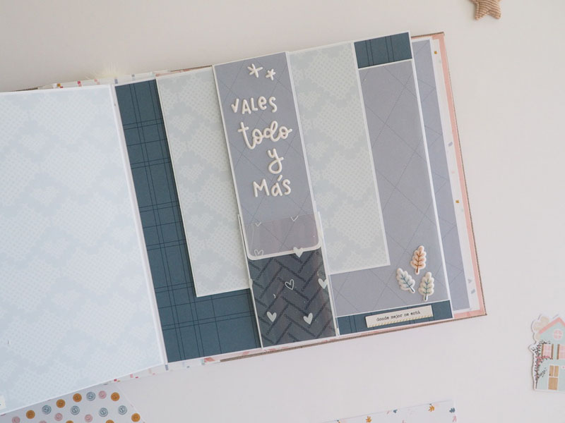 La estructura forrada con papel tepper y luego decorada con papeles de la colección… en el lomo un tassel colgado con un aro y varios pompones… La frase del título en madera es de Stampam una tienda que tiene monerías de madera y que me encantan… Por dentro estructura de espina con diferentes desplegables y bolsillos, lleno de tags decorados con los die cuts de la colección… Papel velum, alguna frase en puffys de Duna y mucho espacio para poner fotos.