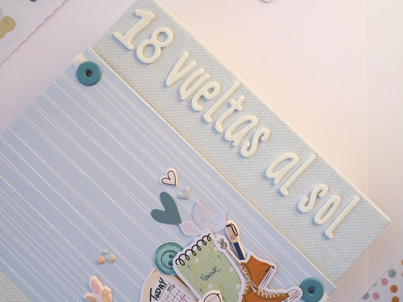 Lleva la portada combinando papel tepper y papel decorado y de cierre una goma que cierra hacia atrás. El título con goma eva blanca: 18 vueltas al sol, que son los años que ha cumplido mi sobri…