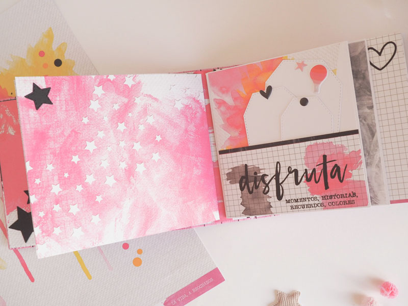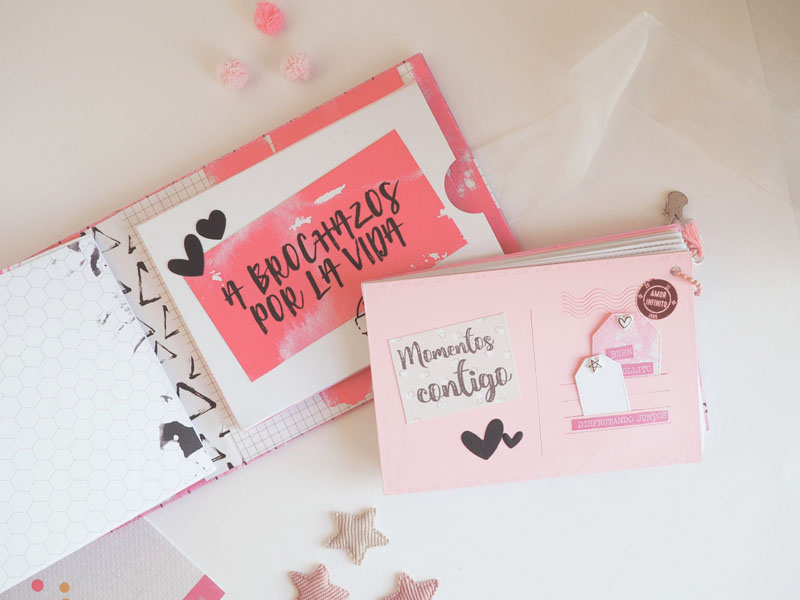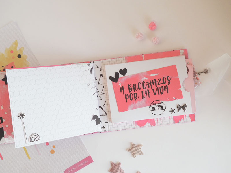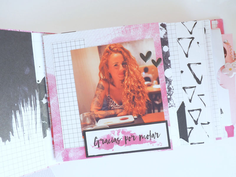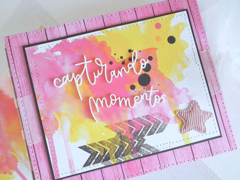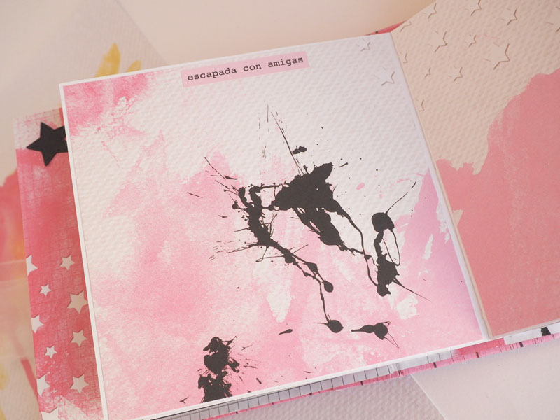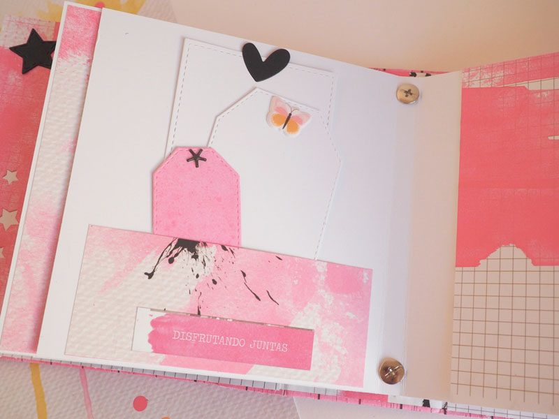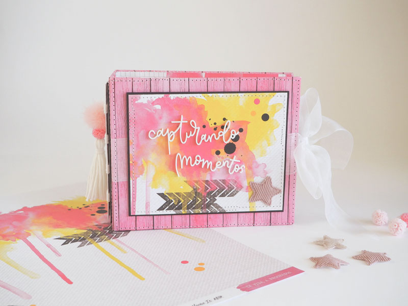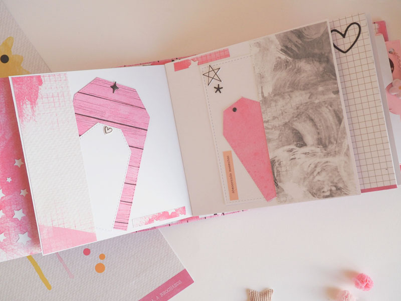 Este mini está hecho con la colección Milk Media de Paperinky, y es una colección que me encanta porque soy una negada con el mix media, así que esta cole me chifla. Además a Cris le pega y es muy de su estilo. La portada va forrada con papel madera en fucsia y de título «Capturando momentos» en metacrilato. Por dentro no tiene nada especial, tan solo los papeles a doble cara y algunos desplegables y bolsillos con tags para que pueda llenar de frases y recuerdos. Pero es que la colección es tan cañera que no necesita mucha historia… Pero mirad las fotos y ya me decís que os parece: