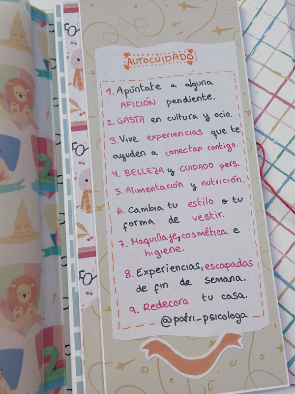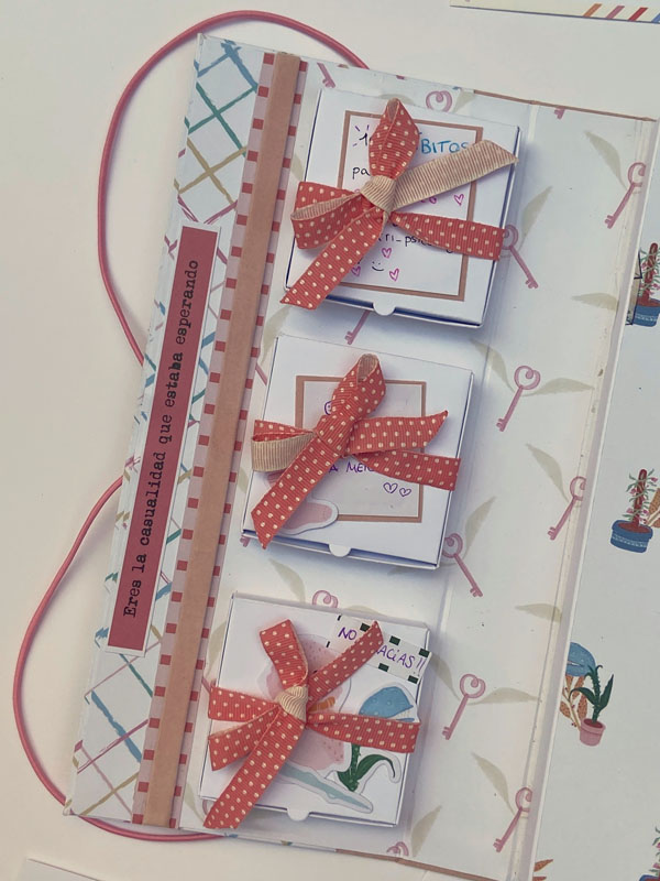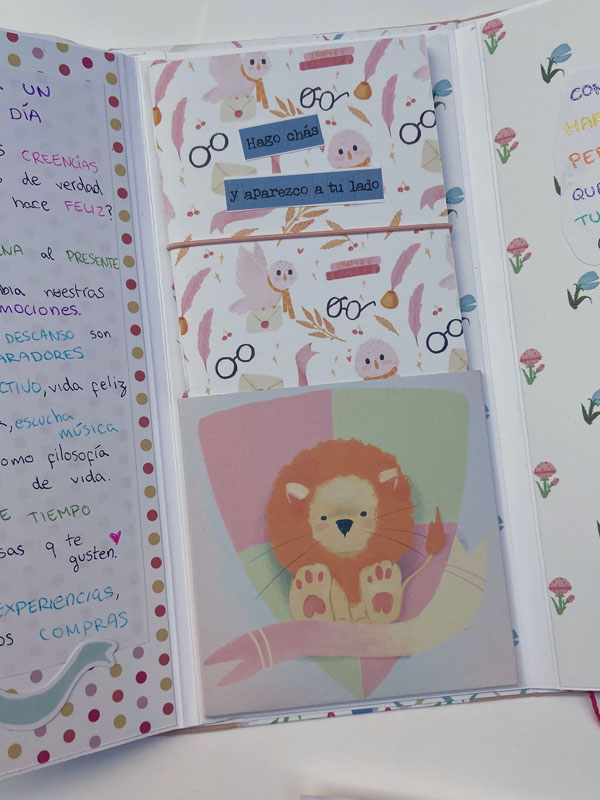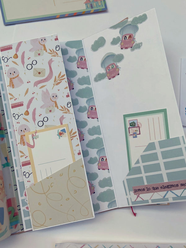 Es un proyecto estilo midori con tres mini álbums en su interior que van dentro de tres cajitas hechas con el troquel de pizza de My Sweet y con una libreta para escribir. Se cierra con unas gomas como una carpeta de colegio y dentro verás que lleva un montón de frases chulas y consejos que deberíamos estudiar, igual que estudiamos cualquier otra asignatura. Para conocernos a nosotros mismos y encontrar lo que realmente nos hace felices. Aprender a ser buenas personas y a cuidar de los demás. En definitiva a crecer como personas.