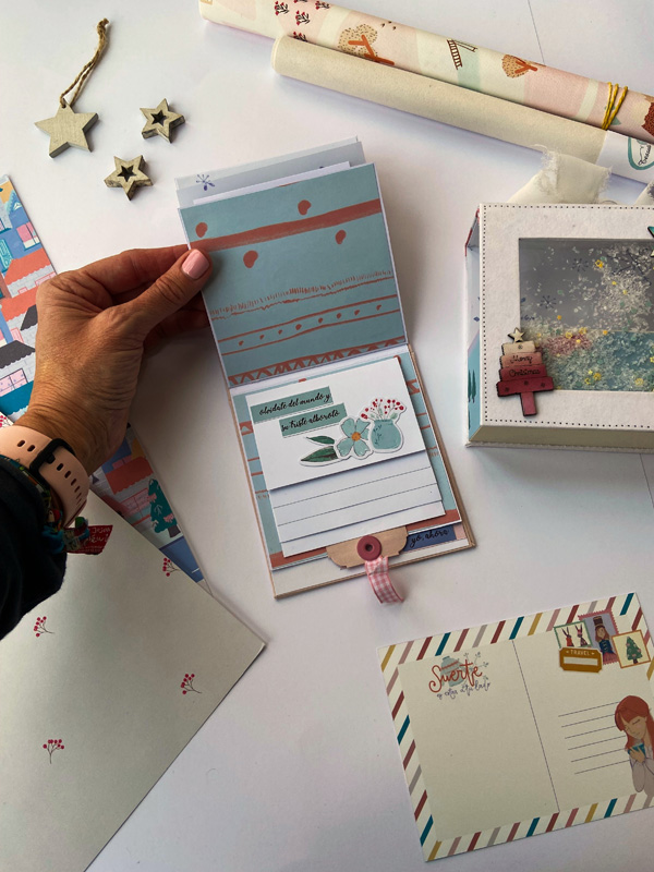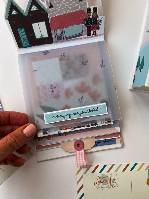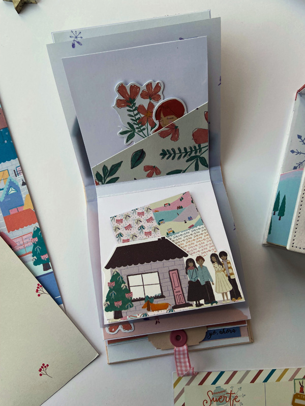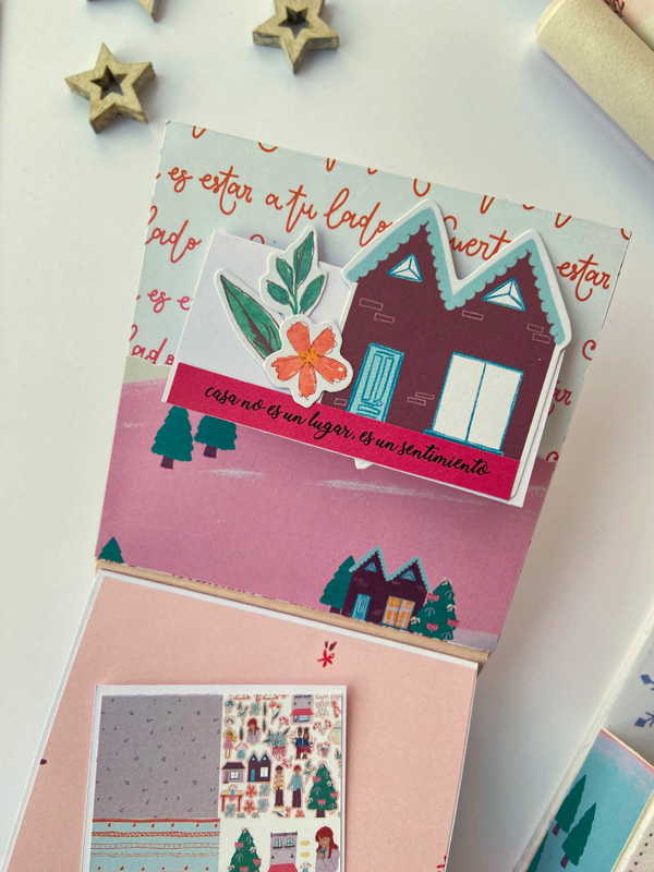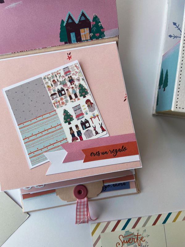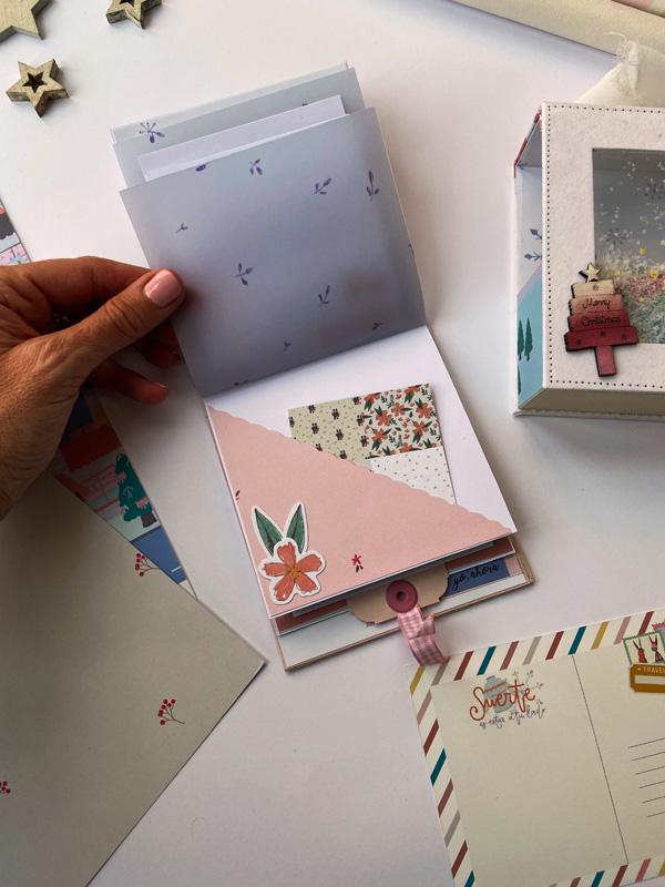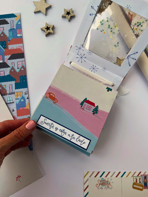 El mini álbum está contenido en una estructura a modo de caja, la cual he forrado con suave terciopelo blanco, lo que le da un toque elegante y sofisticado. La tapa lleva una ventana con un shaker, relleno de nieve artificial que adorna la tapa, creando un efecto mágico y festivo. El mini álbum en su interior está decorado con papeles de la colección. Para la tapa he escogido un papel que simula un paisaje y se ve a través de la portada shaker de la caja, dándole un efecto muy chulo.