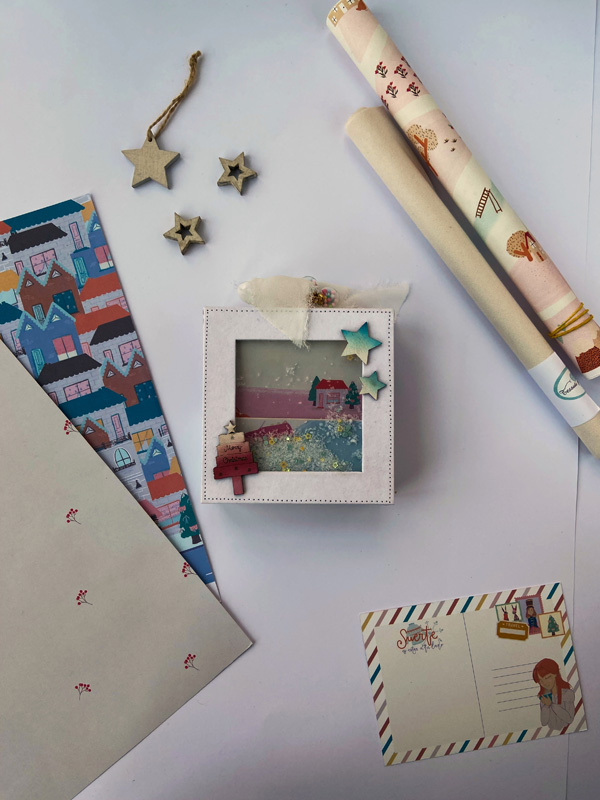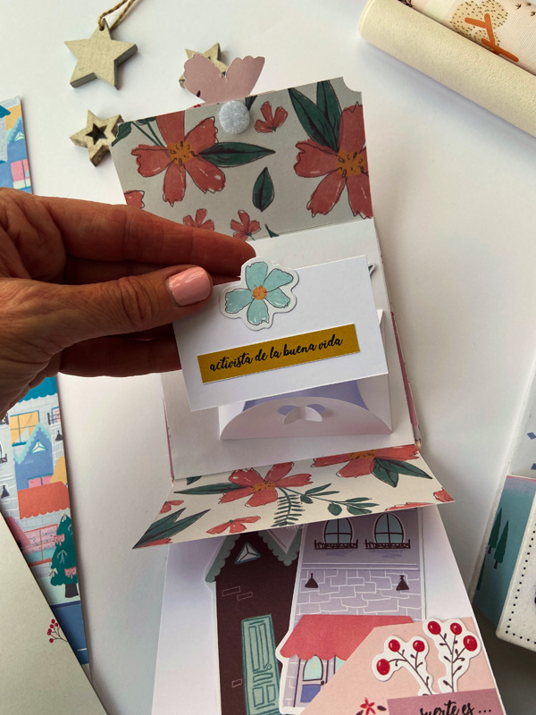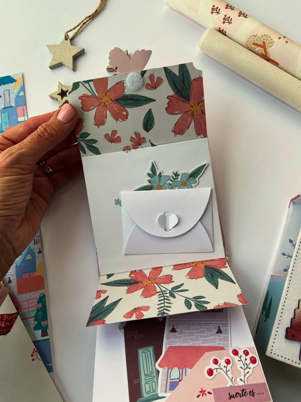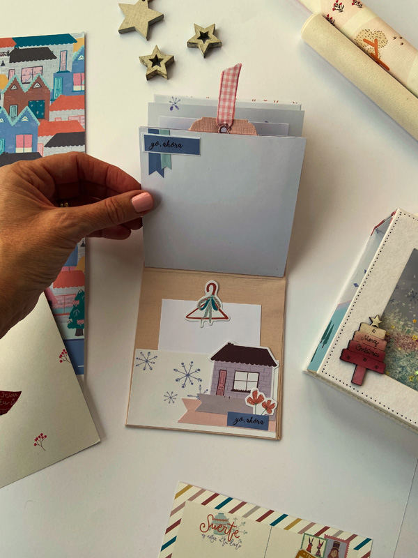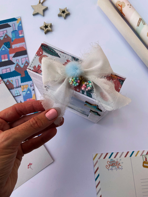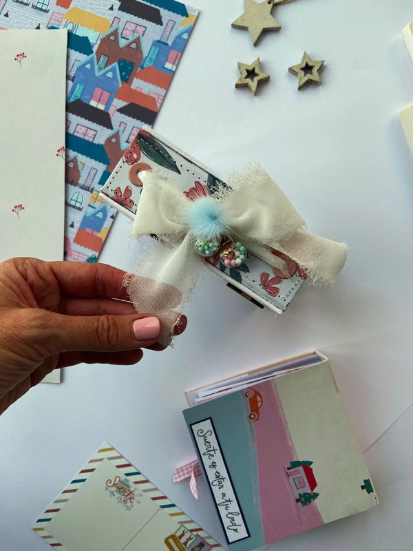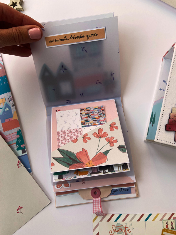 El mini álbum está contenido en una estructura a modo de caja, la cual he forrado con suave terciopelo blanco, lo que le da un toque elegante y sofisticado. La tapa lleva una ventana con un shaker, relleno de nieve artificial que adorna la tapa, creando un efecto mágico y festivo. El mini álbum en su interior está decorado con papeles de la colección. Para la tapa he escogido un papel que simula un paisaje y se ve a través de la portada shaker de la caja, dándole un efecto muy chulo.