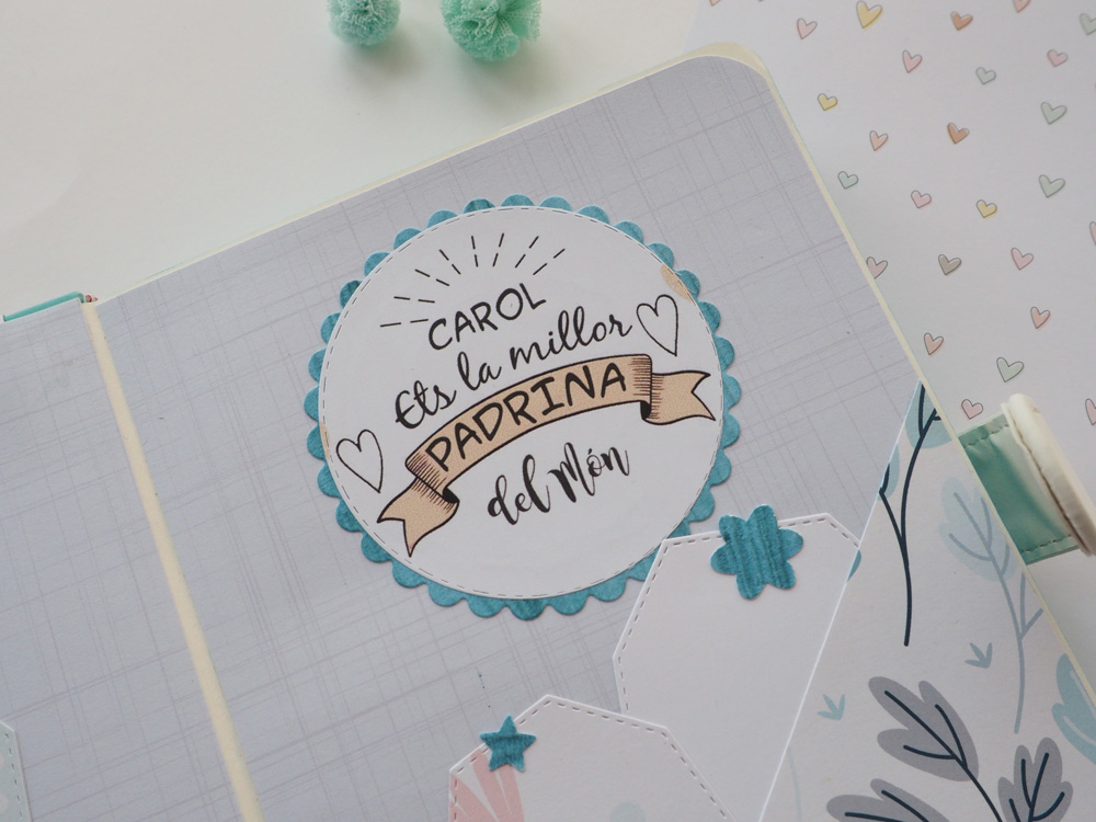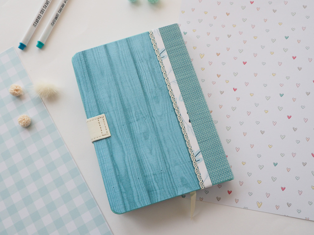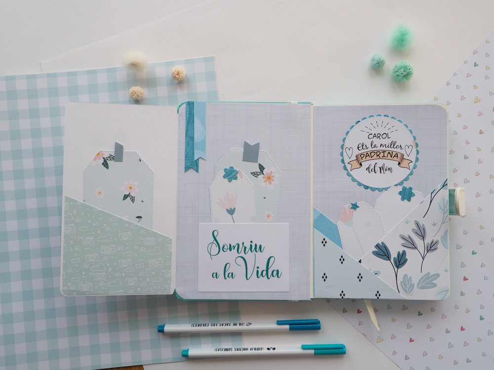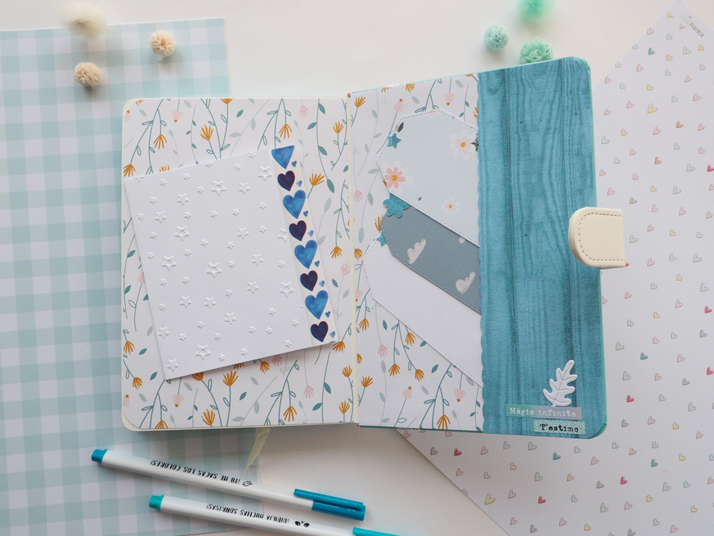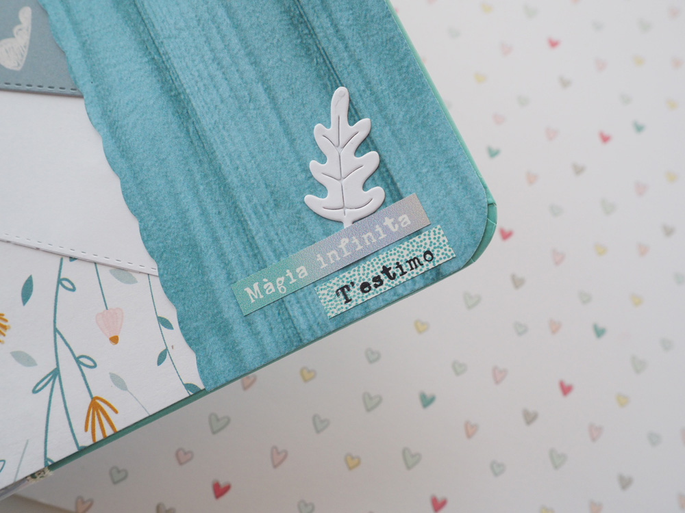 La portada forrada con un papel madera en tonos turquesa y decorada con die cuts y recortes de la colección plántate de Dunaon. Siempre lo digo pero es verdad, Dunaon tiene papeles tan versátiles que pegan para cualquier ocasión, ya sea un álbum, una caja o una libreta como ésta.