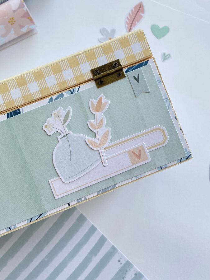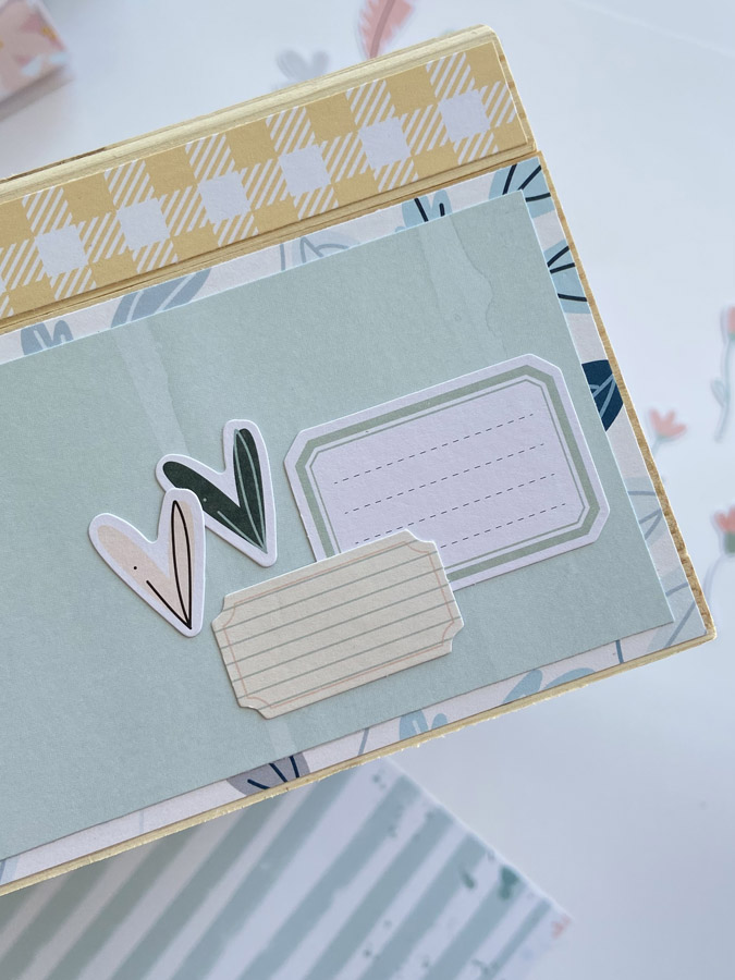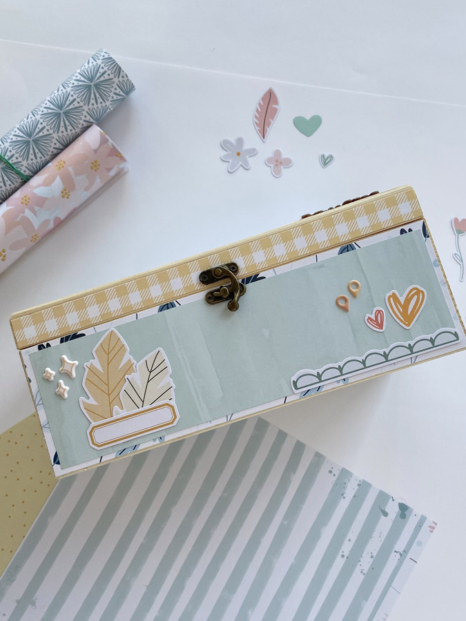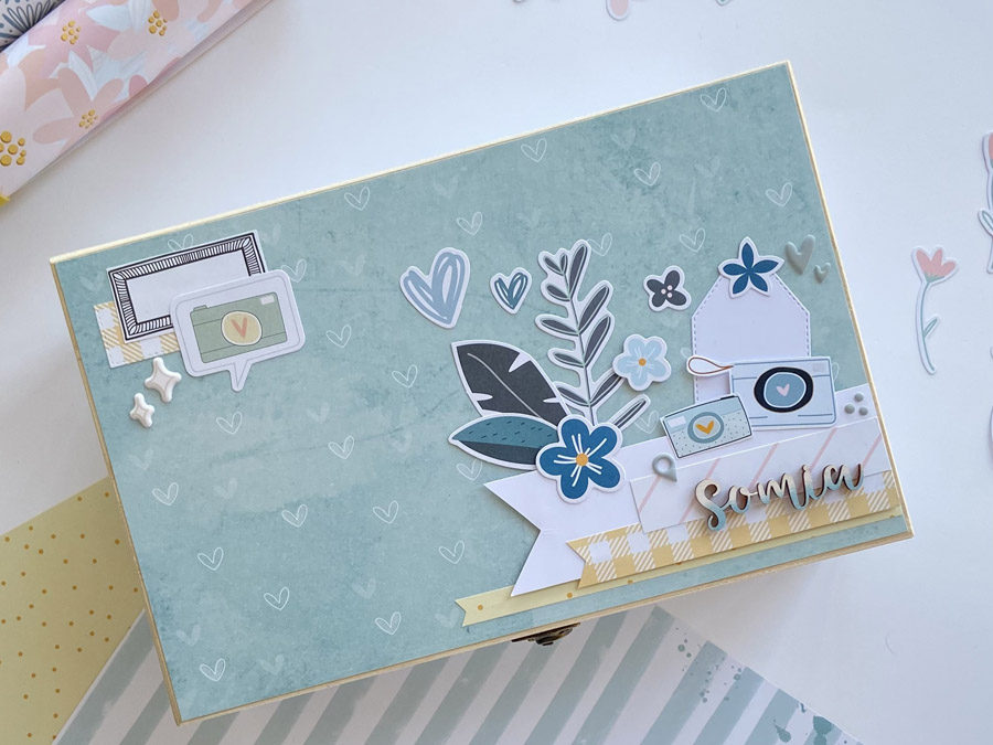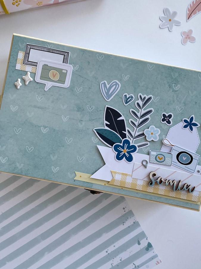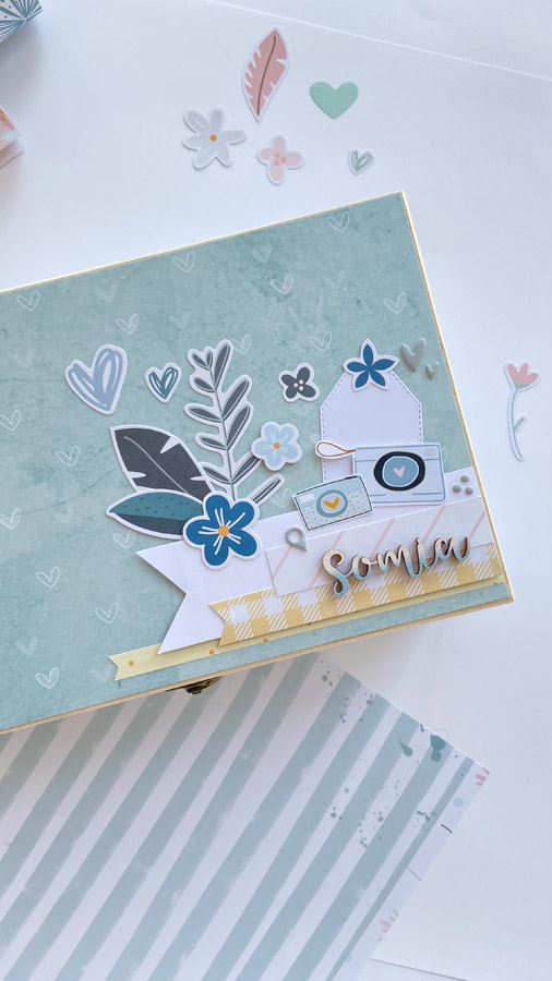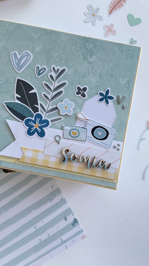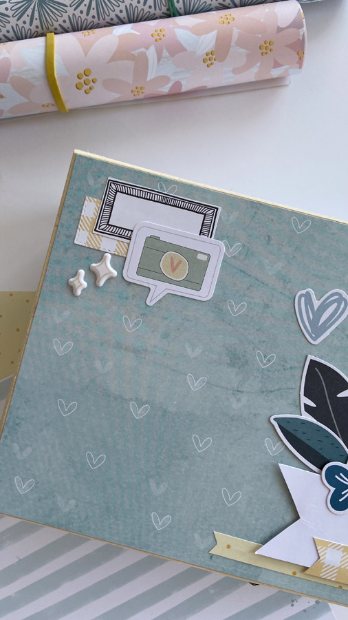 La caja va toda forrada con papeles de la colección Plántate de Dunaon y la portada con muchos diecuts que le dan un toque muy elegante… y es que no todo van a ser álbums de fotos, con el papel de scrapbooking podemos decorar cualquier cosa y el resultado es así de bonito…. solo hay que echarle un poco de imaginación!