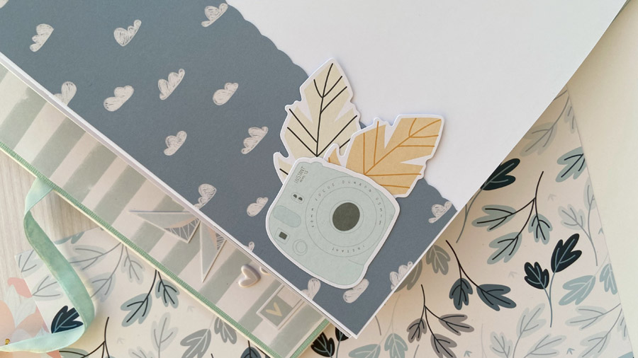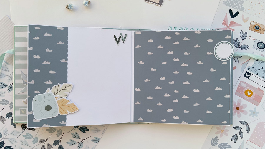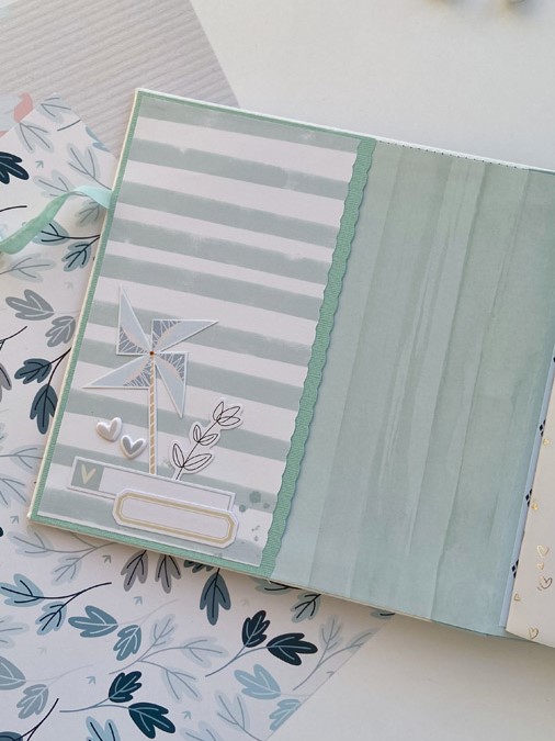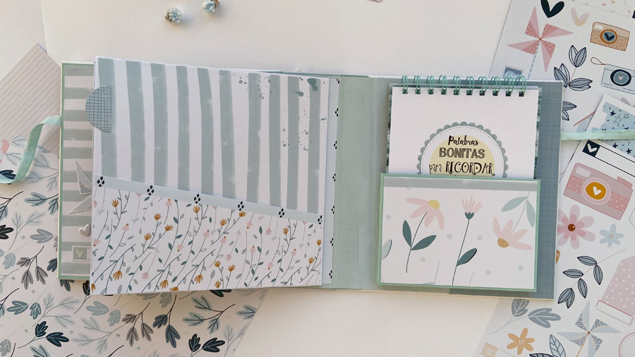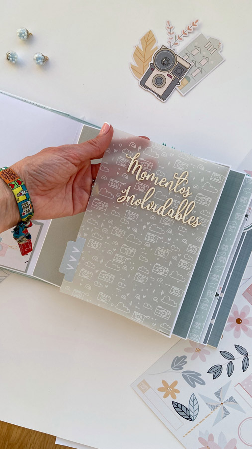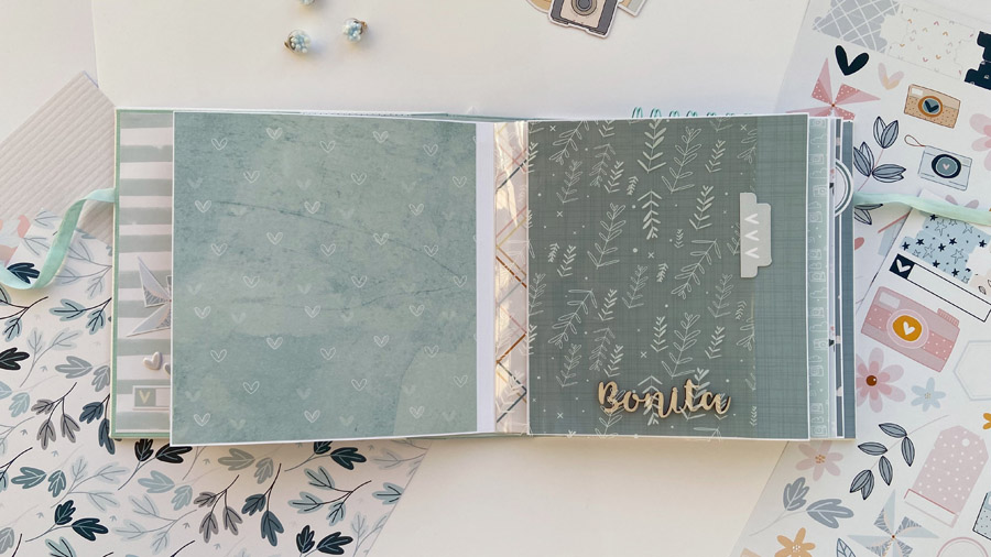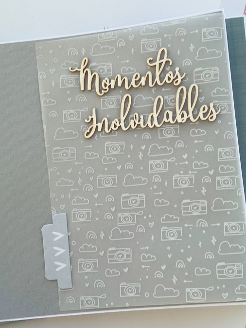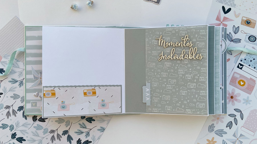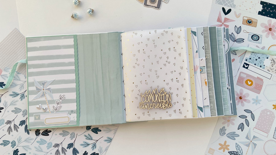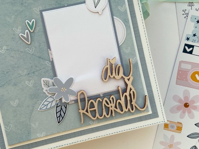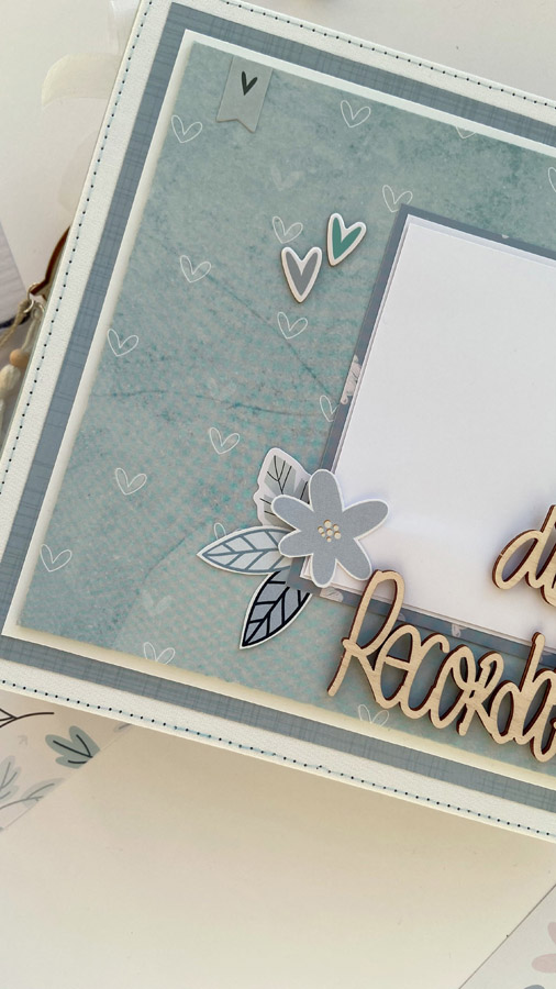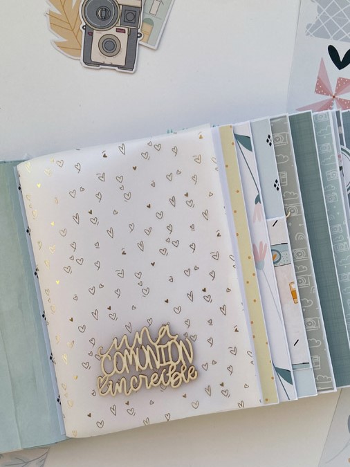 Es un álbum cuadrado con estructura de espina, con hojas desestructuradas de diferentes medidas. La portada forrada con papel tela blanco, y el lomo forrado con tela de terciopelo. La portada con un cartón sobrepuesto que le da un toque muy elegante… una foto y la palabra «Dia x Recordar» de Stampam en madera, unos diecuts de la colección y poco más… En el lomo un tassel colgado con un pez simbolo de la comunión y por dentro lleno de bolsillos y desplegables.