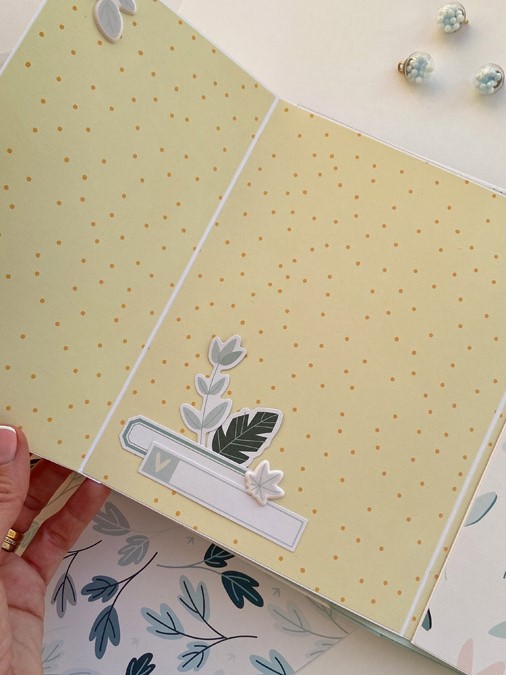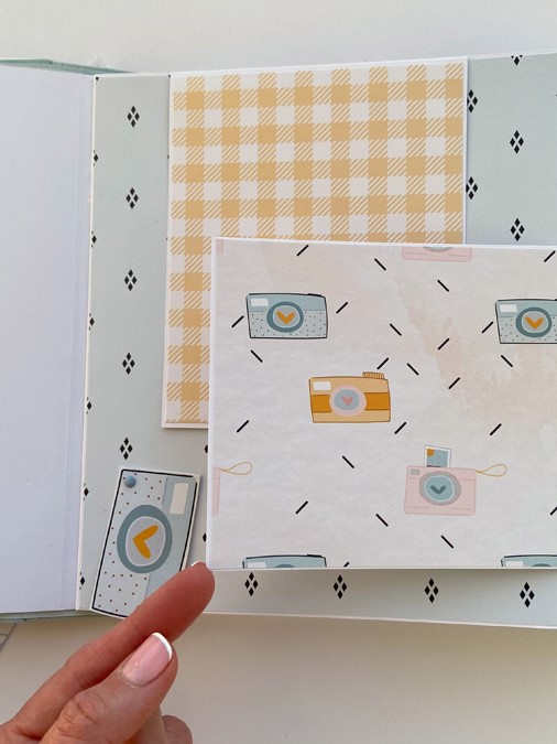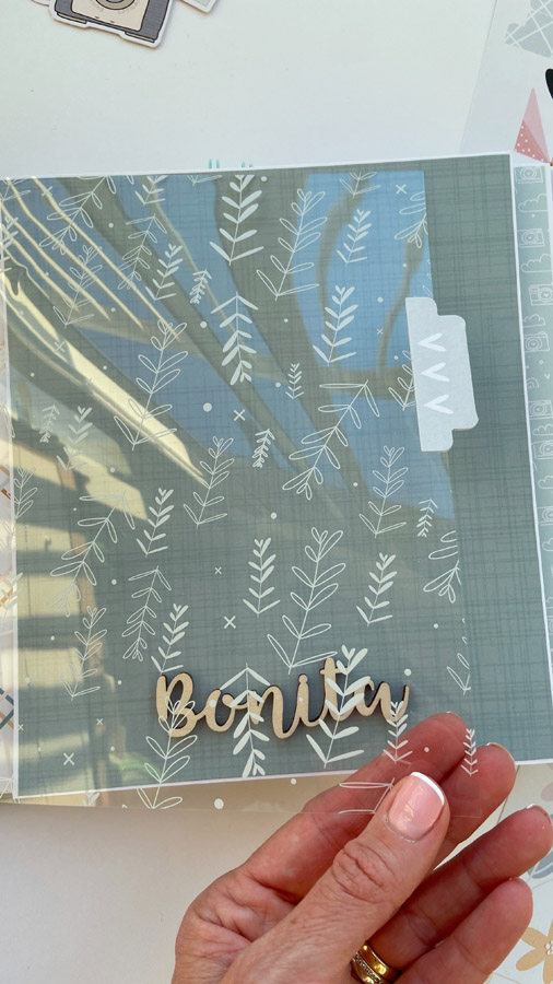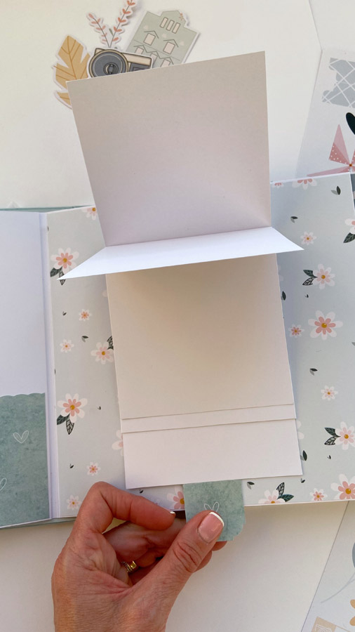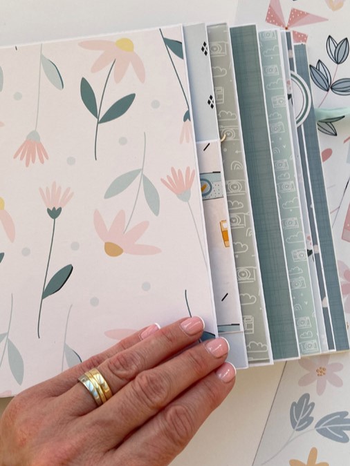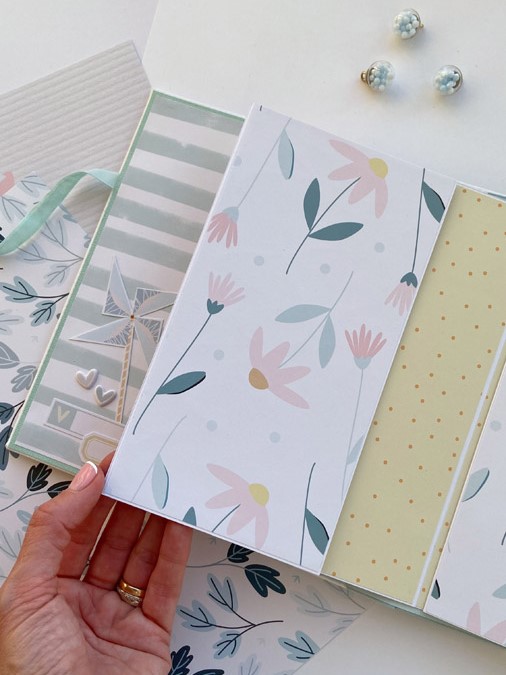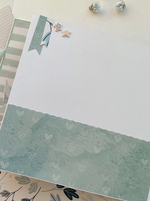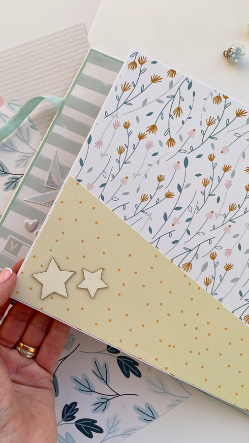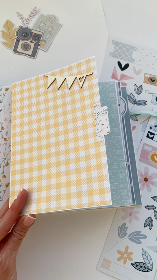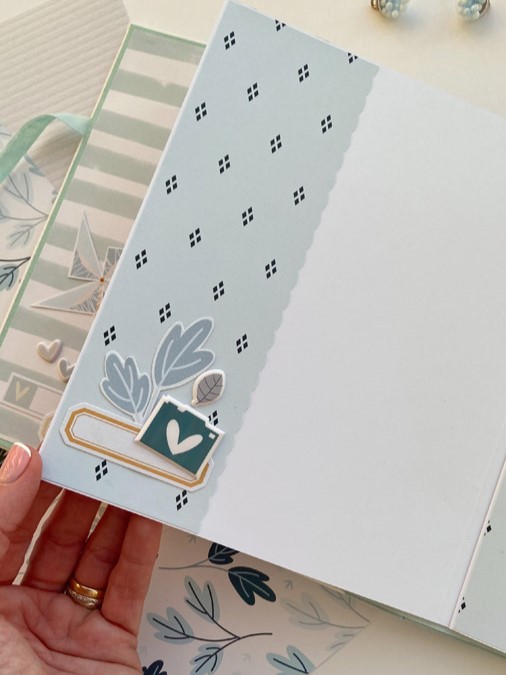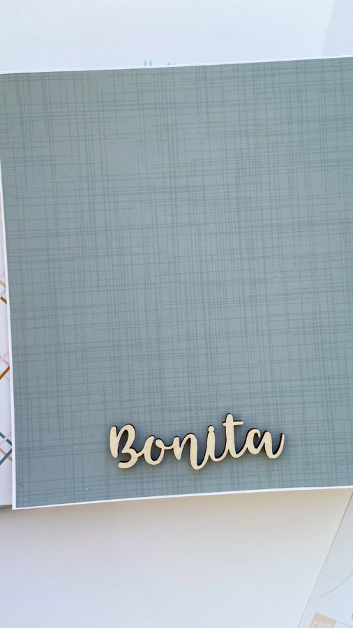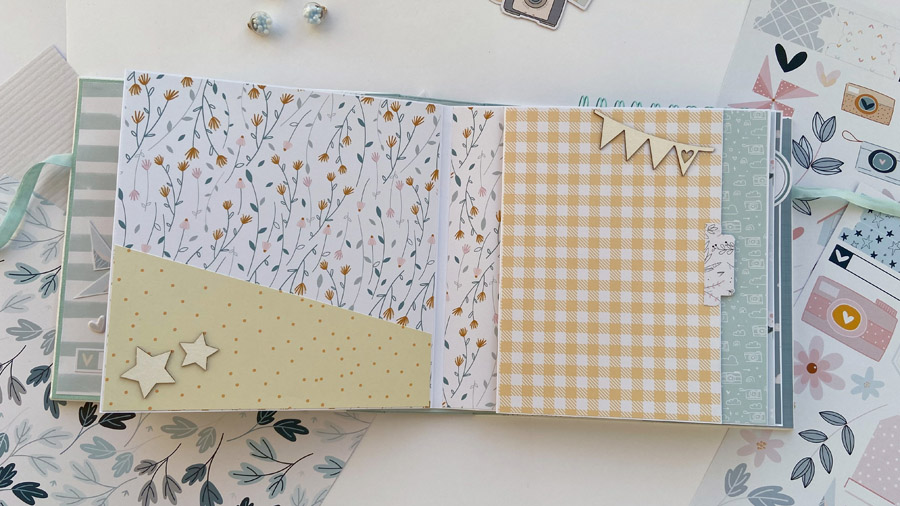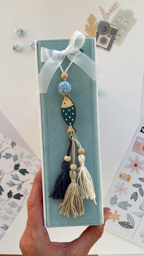 Es un álbum cuadrado con estructura de espina, con hojas desestructuradas de diferentes medidas. La portada forrada con papel tela blanco, y el lomo forrado con tela de terciopelo. La portada con un cartón sobrepuesto que le da un toque muy elegante… una foto y la palabra «Dia x Recordar» de Stampam en madera, unos diecuts de la colección y poco más… En el lomo un tassel colgado con un pez simbolo de la comunión y por dentro lleno de bolsillos y desplegables.