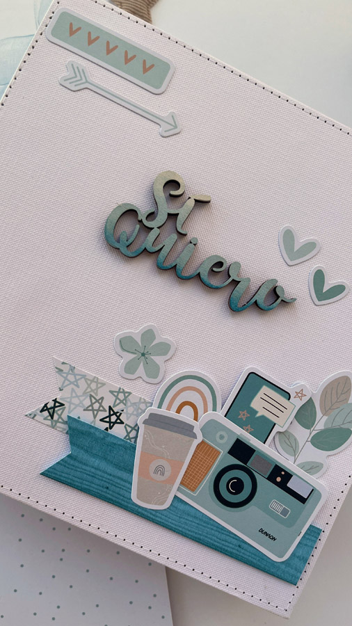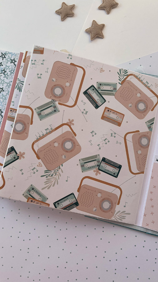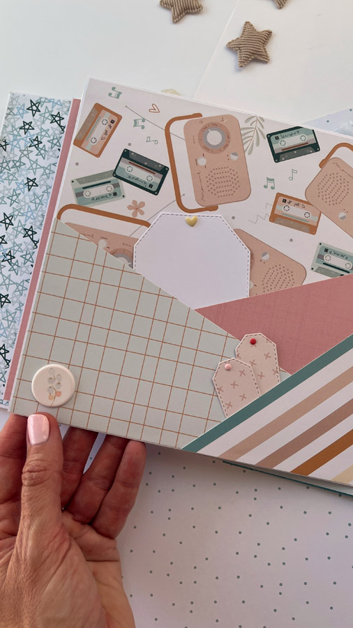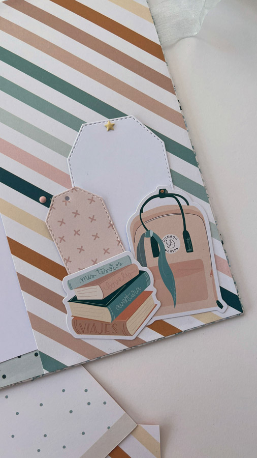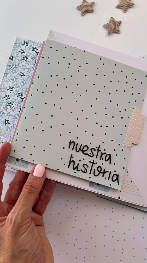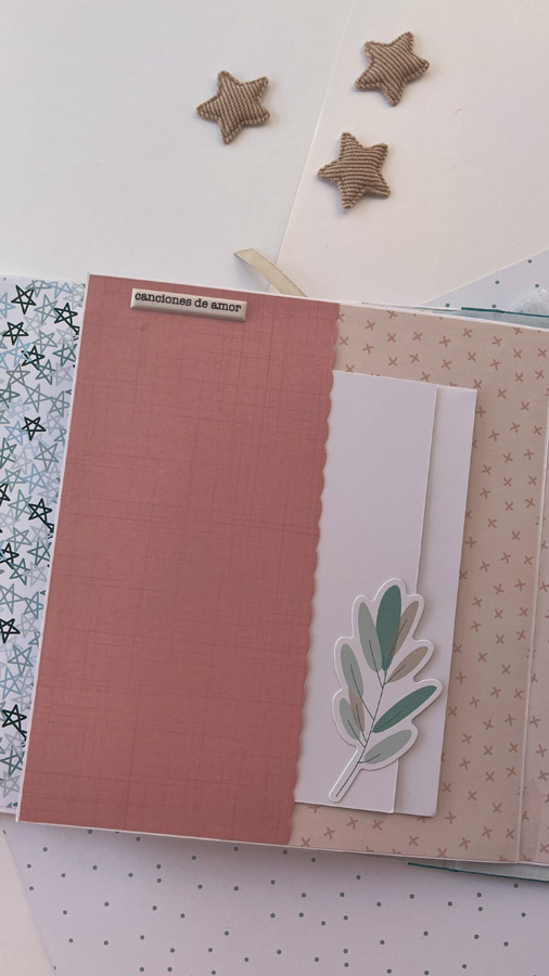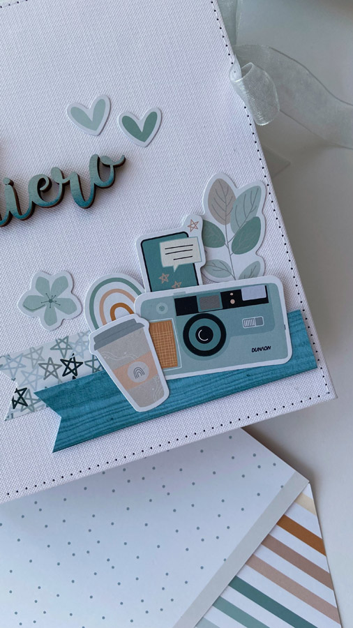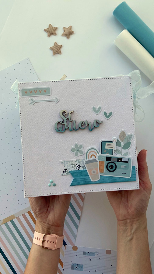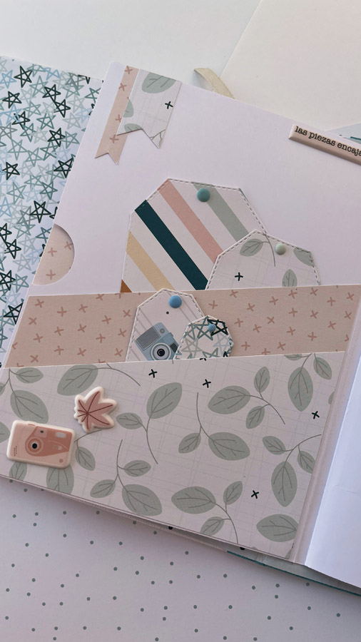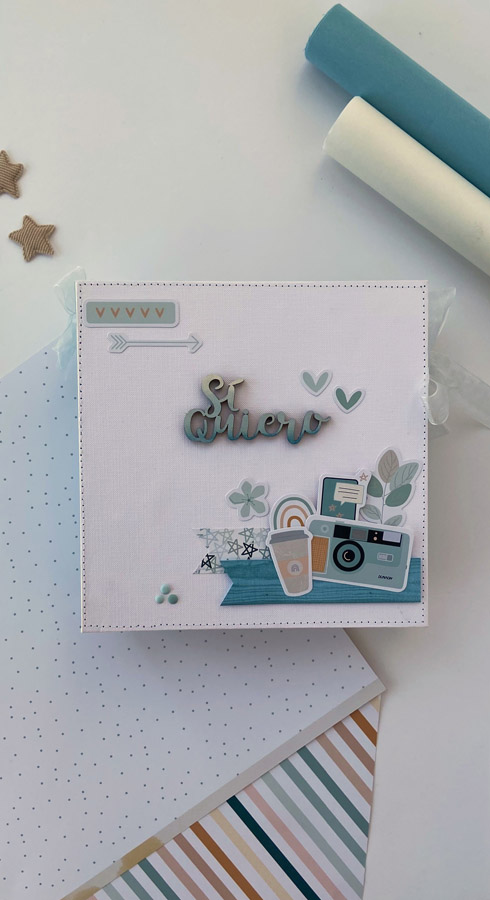 Un álbum maxi hecho con la colección Tempo de Dunaon, una cole muy elegante (como todas las que hace esta chica que son una monada!), con estructura de espina, con muchos desplegables y bolsillos para llenar de recuerdos de ese día tan especial.