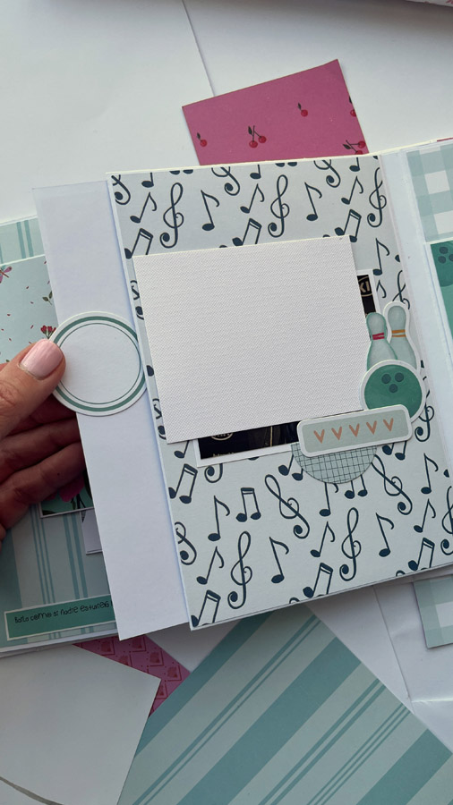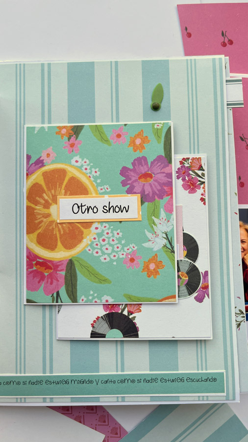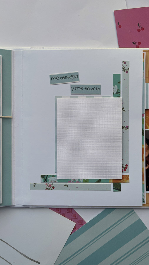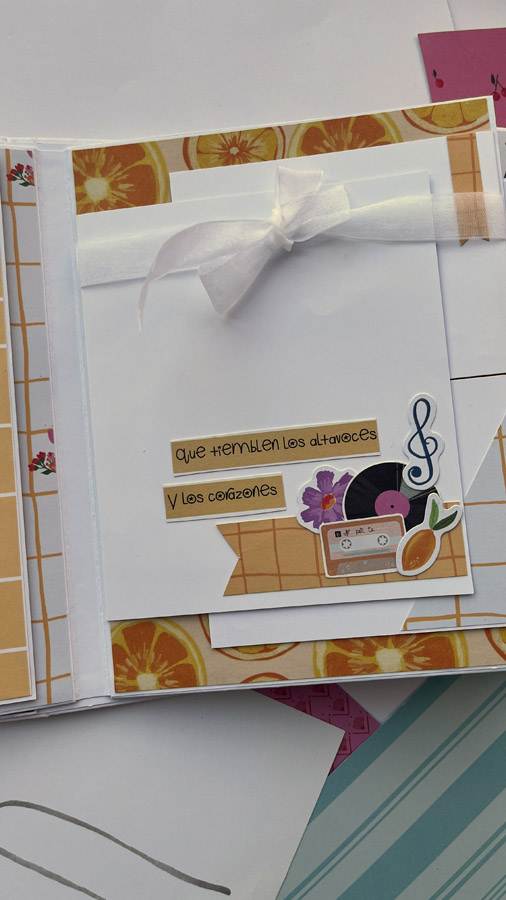 Es una estructura doble, tiene dos lomos. Y la portada lleva una solapa con acetato. (Inspiración en un álbum de Mamen Montero). Debajo del acetato unas tiras de hilo de colores con die cuts y adornos que pasan por los hilos como si estuvieran cosidos (inspiración de mi amiga A_Vuela pluma) y el interior con desplegables, bolsillos escondidos y muchos detallitos decorando cada página.