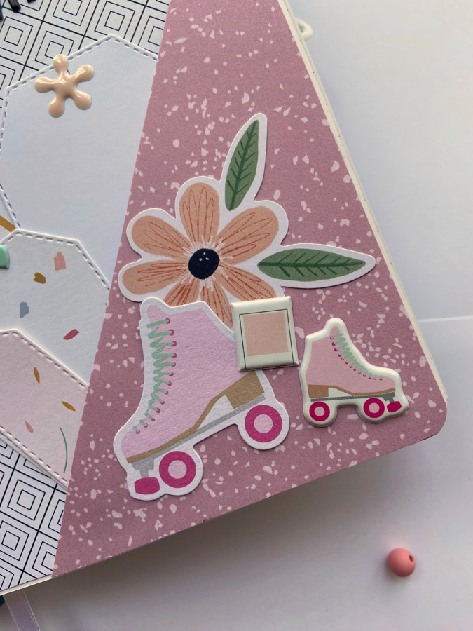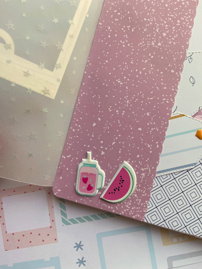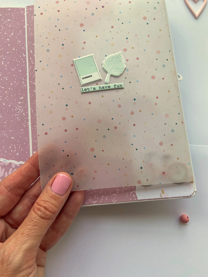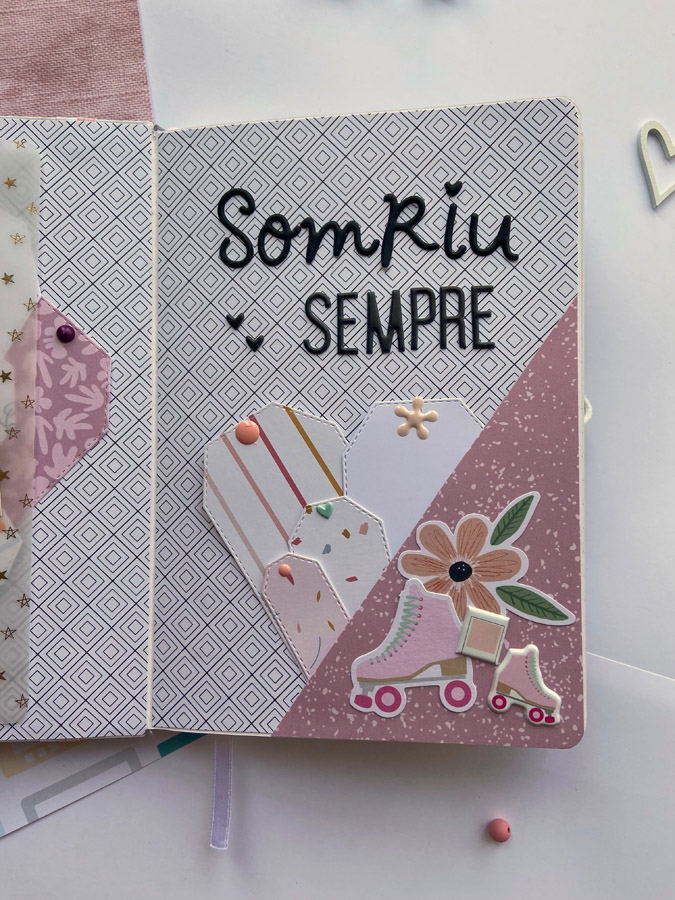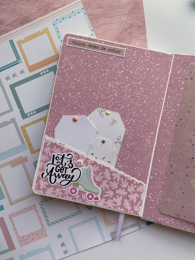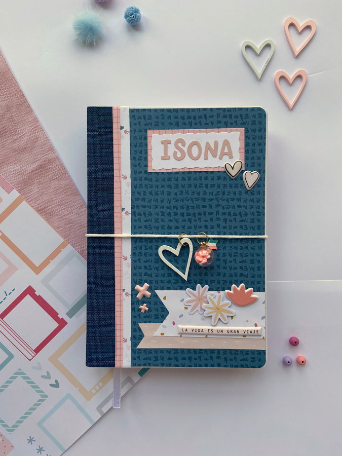 Es una libreta en tonos azules y rosas con un cierre de goma elástica. Va decorada con puffis, unas flores y un par de banderines. El nombre con letras troqueladas a modo de cartelito. El interior con velum y bolsillos con tags. Decorada con die cuts de varias colecciones: Sami Garra, Duna, The Mint Feather… Algunas frases que ya sabéis que no faltan en mis proyectos y poca cosa más… Un regalo sencillito pero muy resultón! A ver que os parece este vídeo y las fotos que os dejo por aquí: