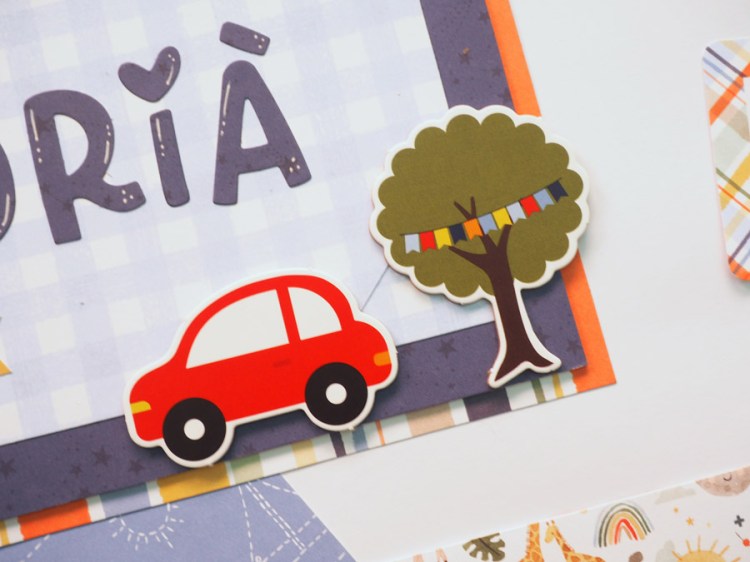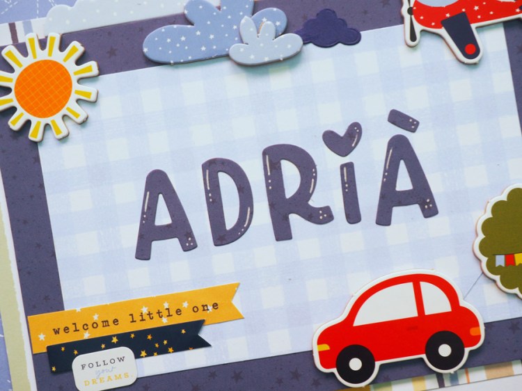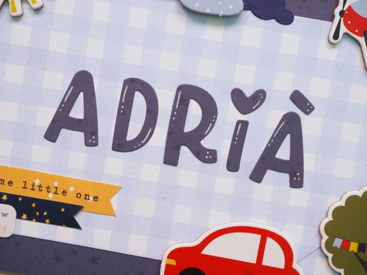 Para hacerlo he cortado un trozo de cartón contracolado y lo he forrado con varios papeles de la misma colección a modo de marco. Luego lo he decorado con varios diecuts y el nombre Adrià troquelado en tonos azules. Para colgarlo le he puesto un trozo de cuerda sujetado con unos eyelets al cartón antes de pegar la parte delantera para que no se vea por delante. Y poco más… espero que os sirva de inspiración! Feliz tarde.