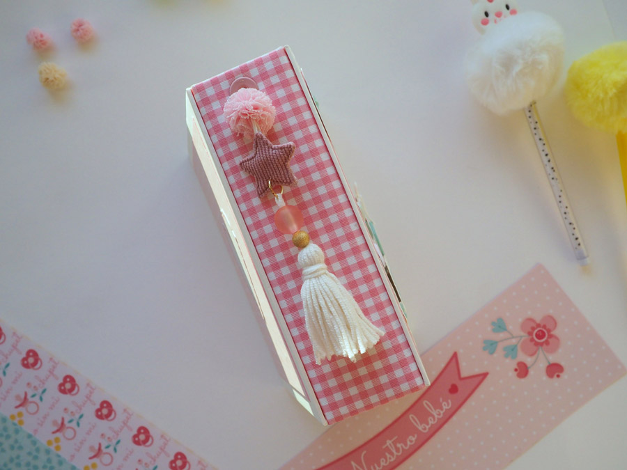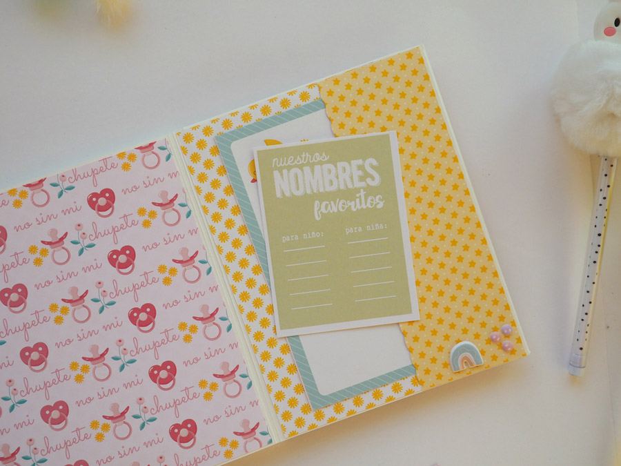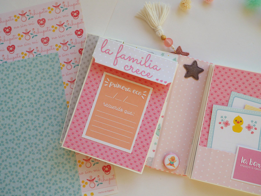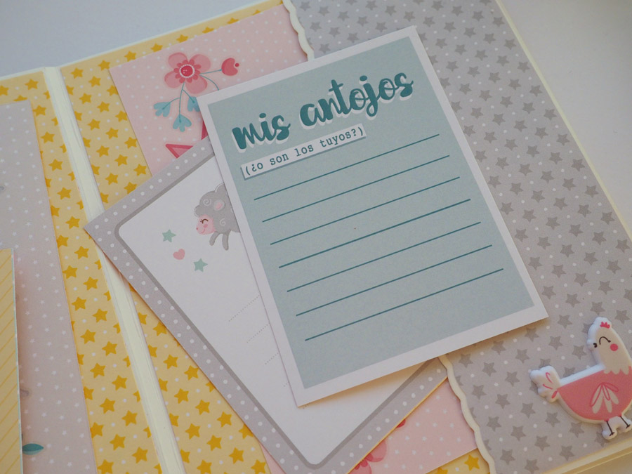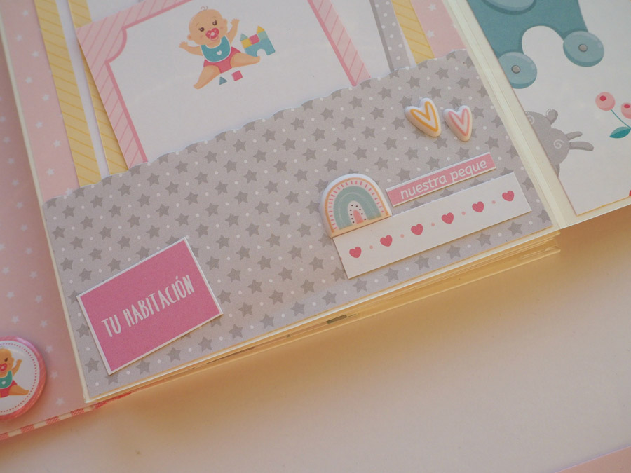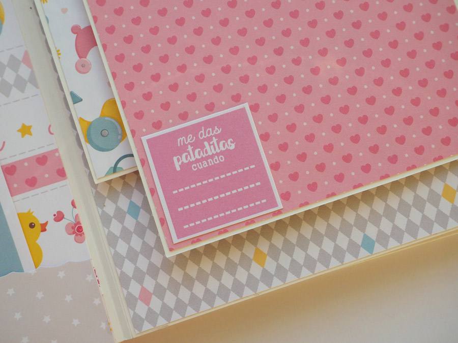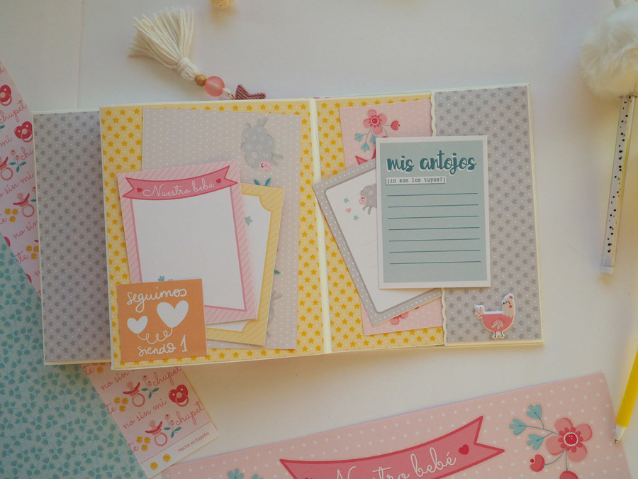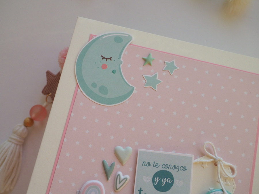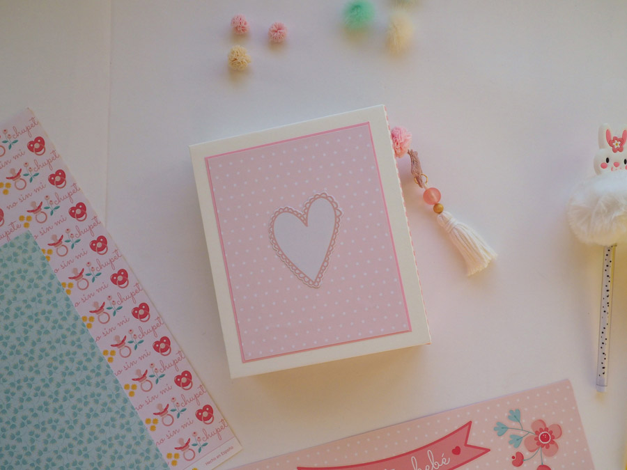 Es un mini vertical con el lomo forrado con tela vichy en rojo y con un tassel colgado a modo de decoración. La portada y contraportada forradas en blanco y decoradas con un papel de estrellitas en color rosa, el nombre y unos diecuts. También la frase «no te conozco y ya te quiero» a modo de título.