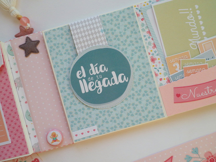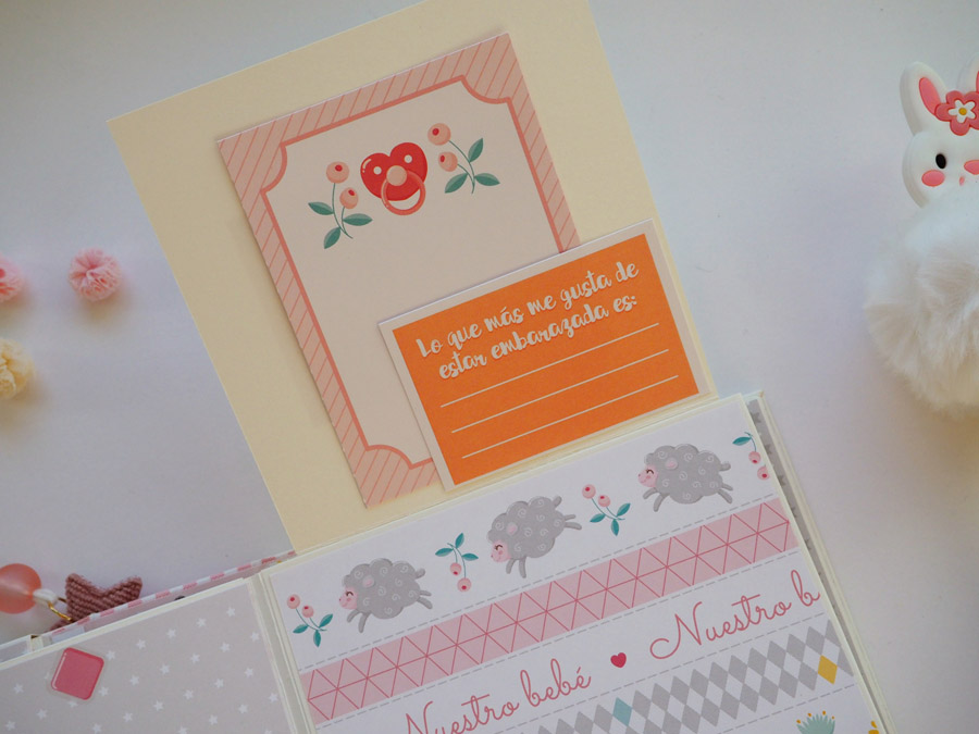 En el interior lleva dos partes, en la parte derecha tiene un desplegable y a la izquierda tiene un bolsillo con una cajita para guardar las ecografías o los cd, o fotografías. Lleva muchos detallitos y frases muy chulas con temático embarazo… mirad las fotos y contadme que os parece, os leo:
