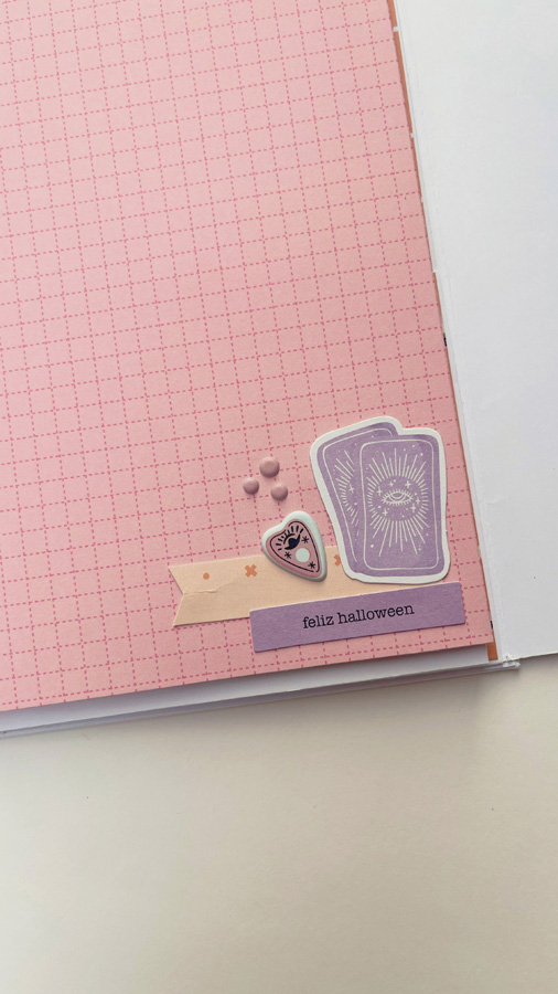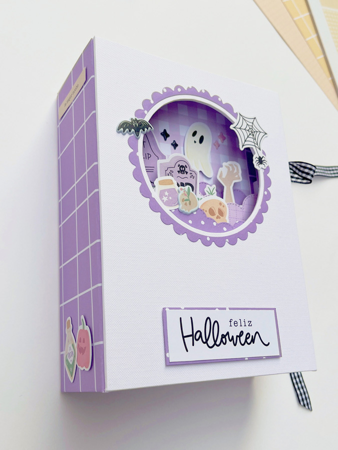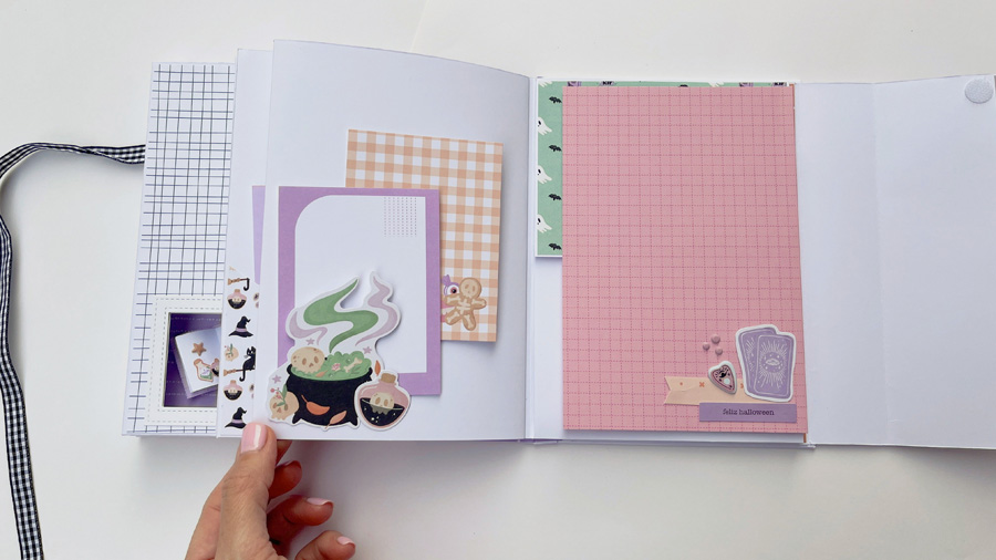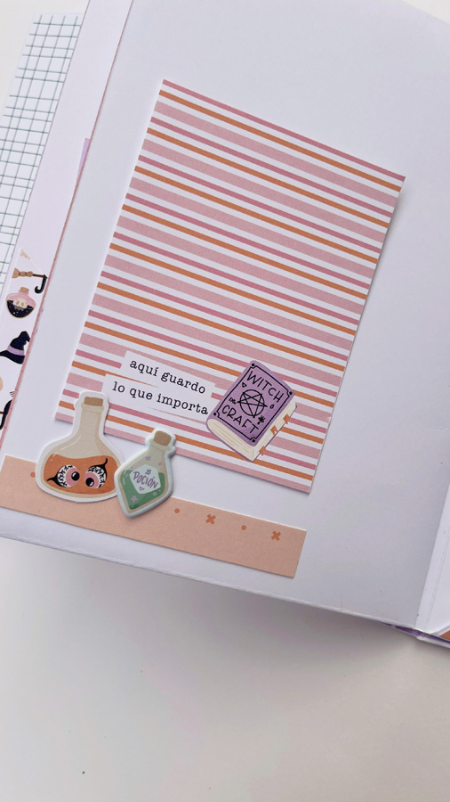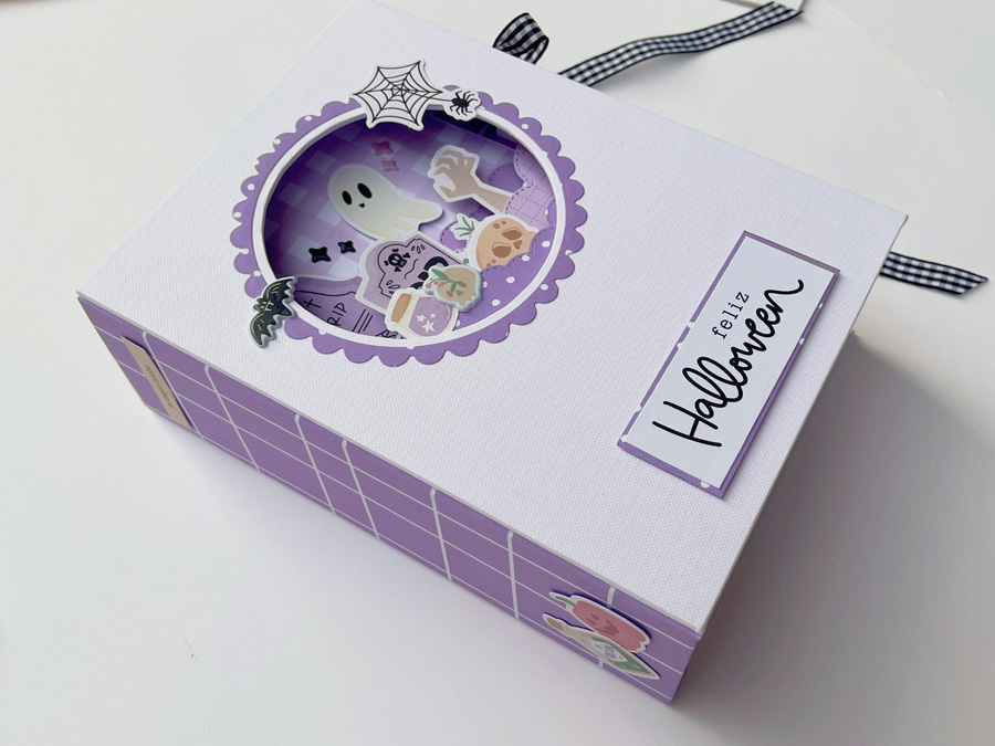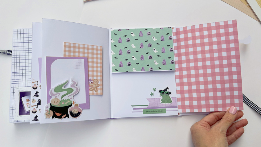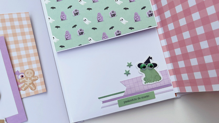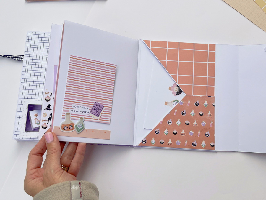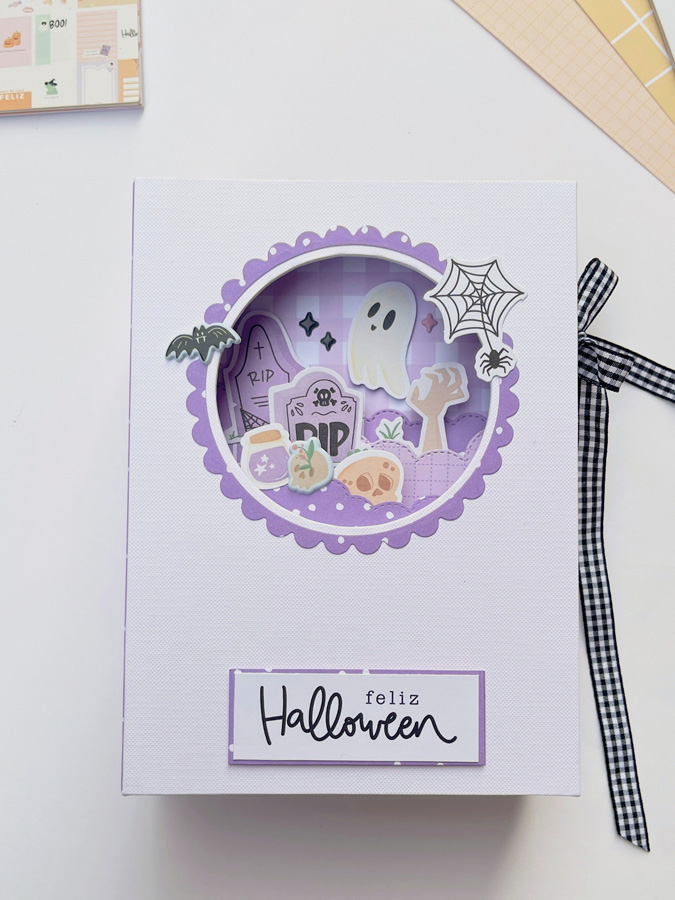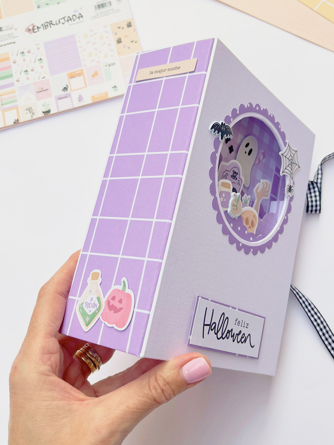 Además de la colección Embrujada, los die cuts y puffis he usado sus básicos que combinan perfectamente. La portada del álbum lleva una ventana redonda desde donde se ve un escenario con diferentes capas que he hecho con el troquel de básicos de My Sweet Valentine y he ido pegando los diferentes die cuts. Este escenario mide dos cm de ancho, así que he aprovechado el hueco de la parte de abajo para hacer por dentro