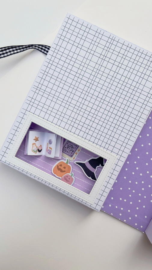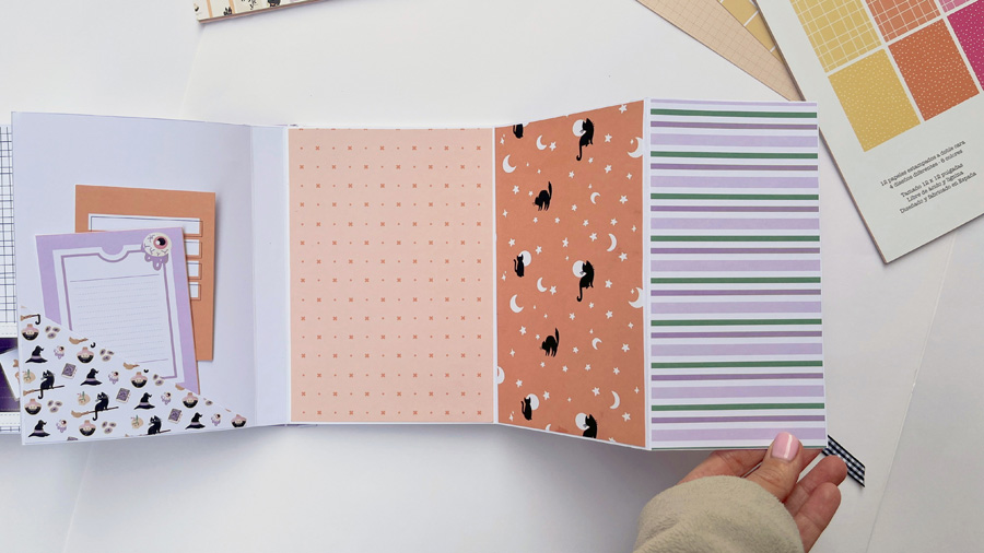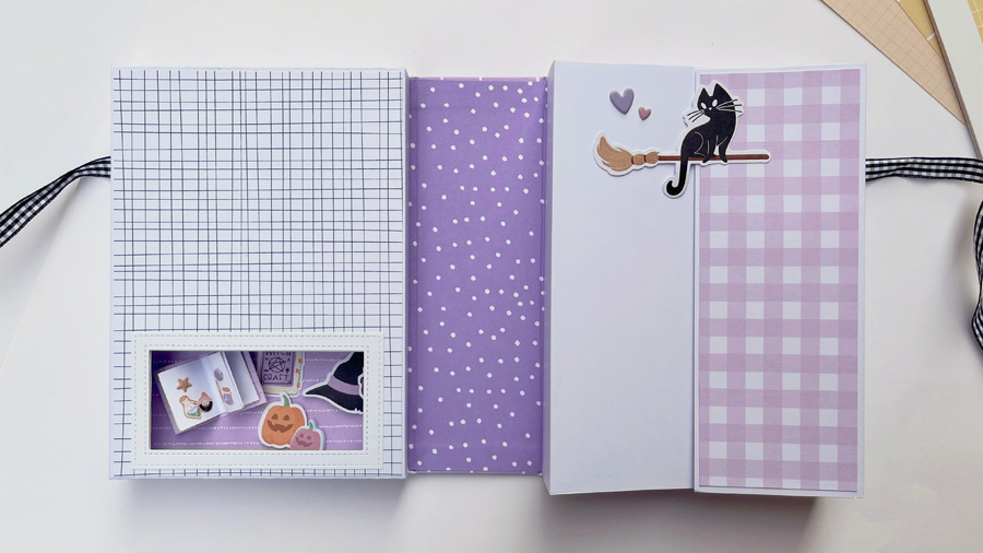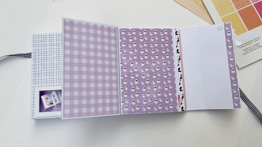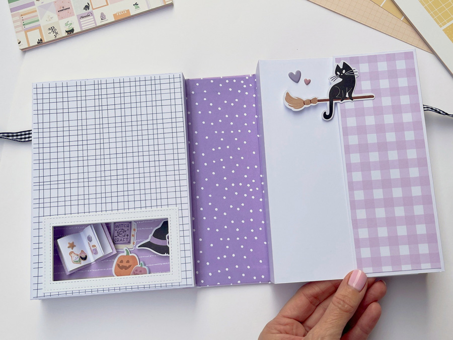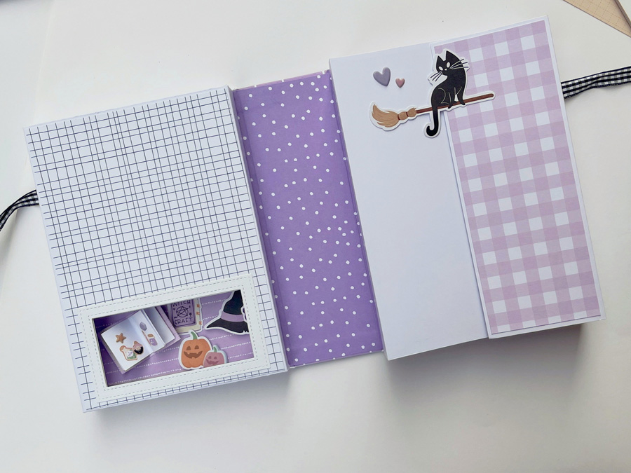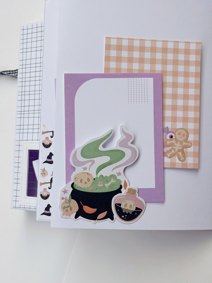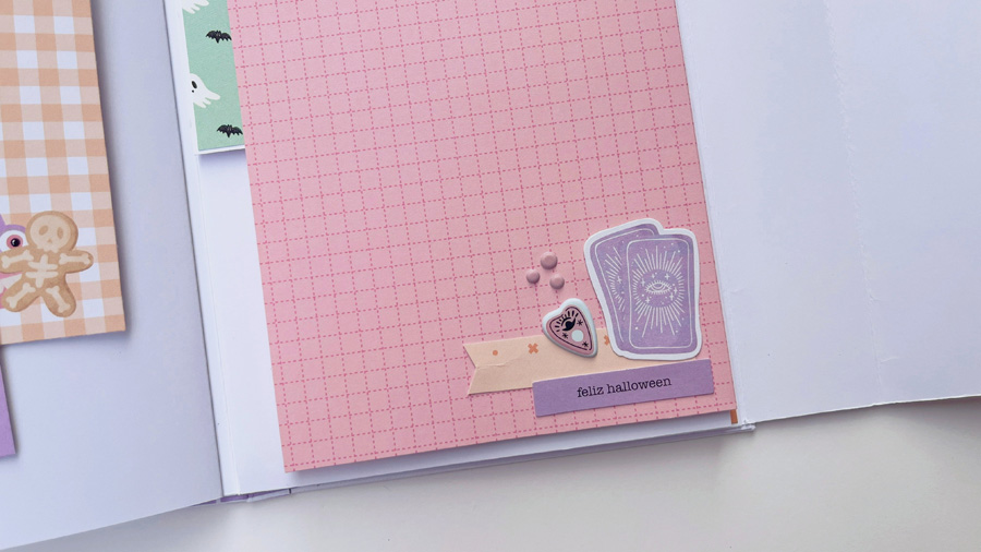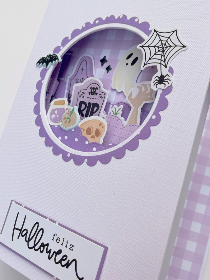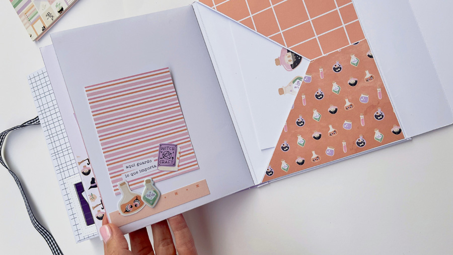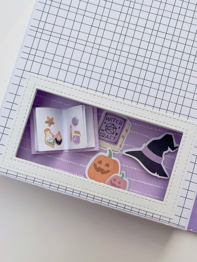 Además de la colección Embrujada, los die cuts y puffis he usado sus básicos que combinan perfectamente. La portada del álbum lleva una ventana redonda desde donde se ve un escenario con diferentes capas que he hecho con el troquel de básicos de My Sweet Valentine y he ido pegando los diferentes die cuts. Este escenario mide dos cm de ancho, así que he aprovechado el hueco de la parte de abajo para hacer por dentro