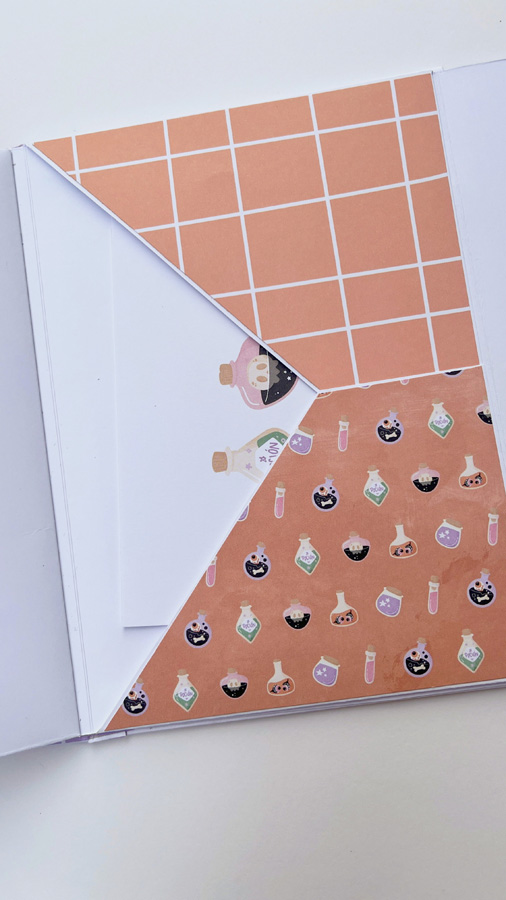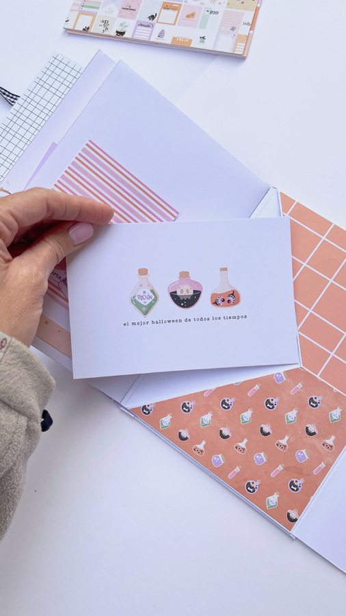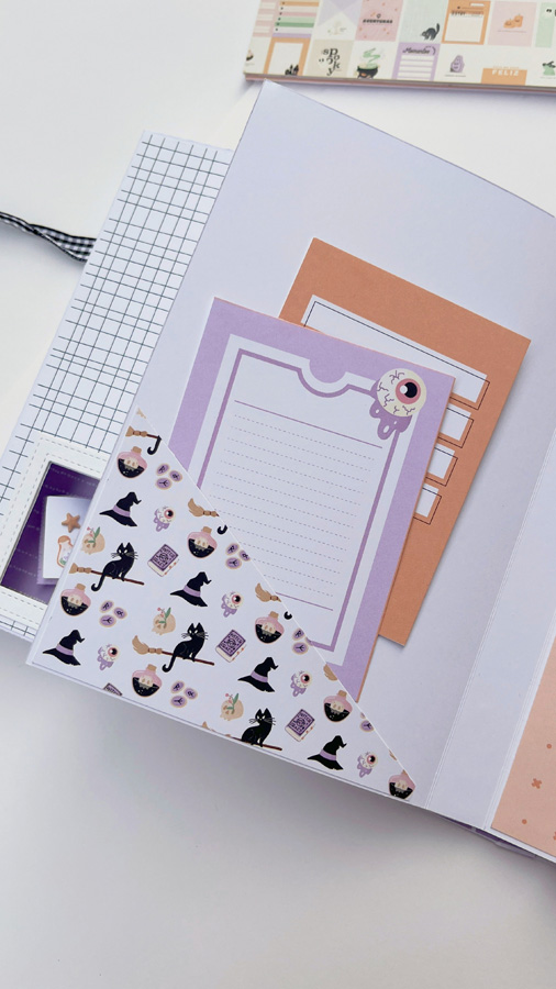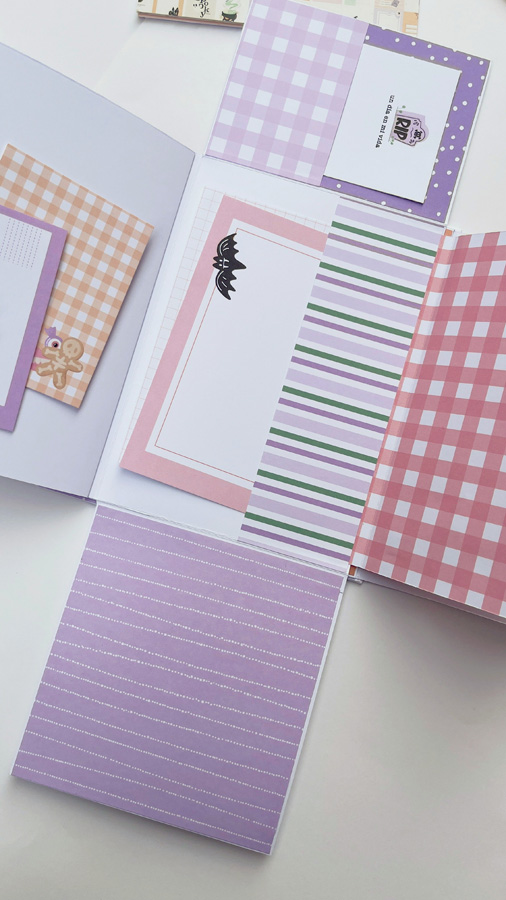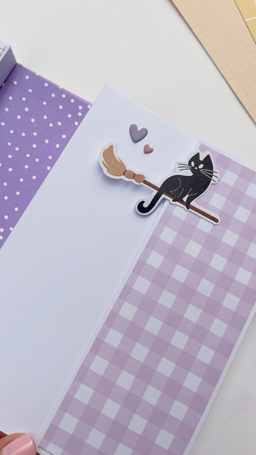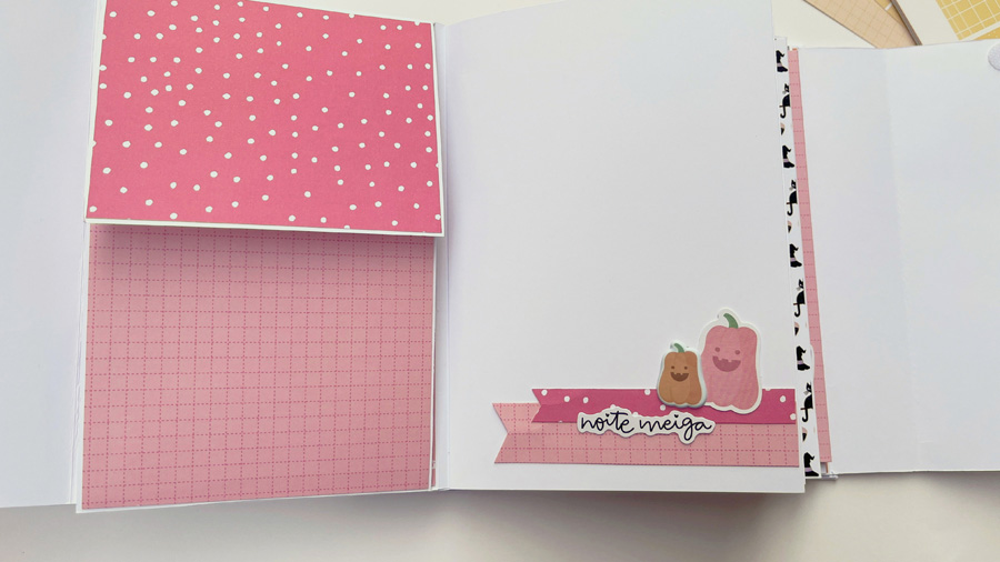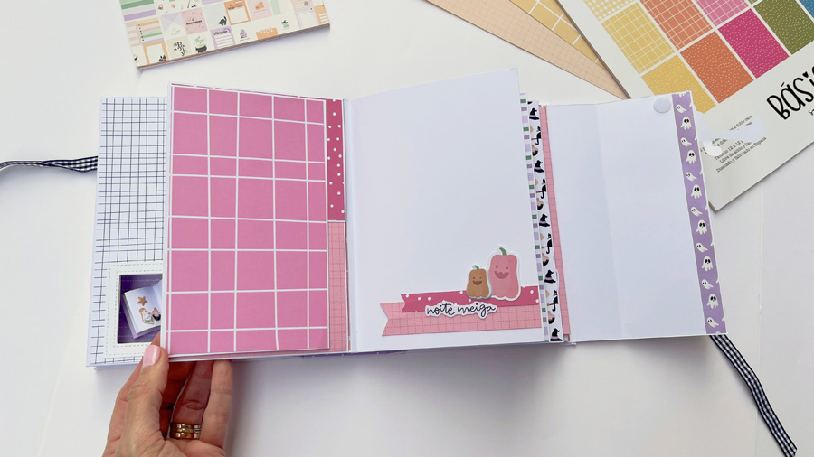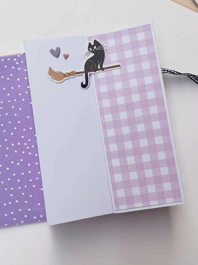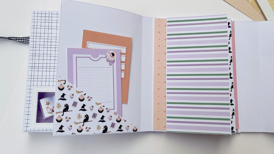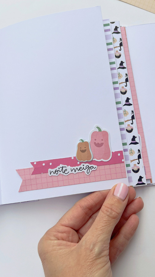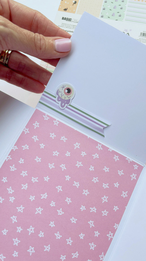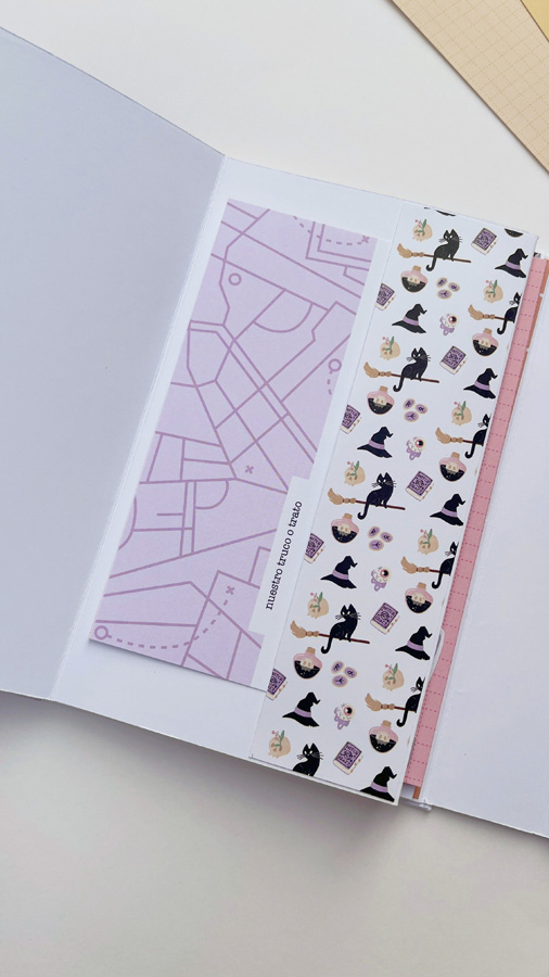 Además de la colección Embrujada, los die cuts y puffis he usado sus básicos que combinan perfectamente. La portada del álbum lleva una ventana redonda desde donde se ve un escenario con diferentes capas que he hecho con el troquel de básicos de My Sweet Valentine y he ido pegando los diferentes die cuts. Este escenario mide dos cm de ancho, así que he aprovechado el hueco de la parte de abajo para hacer por dentro