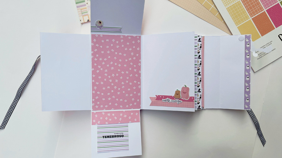 El álbum por fuera parece una caja pero en realidad es un mini álbum. Lleva muchos desplegables que van abriendo en diferentes direcciones, adornados con diferentes die cuts y tarjetas. Como veis tiene mucha capacidad, y es que tenemos muchas fotos de la cena tenebrosa de este año, así que necesitaba un mini con muuucho espacio. 🙂