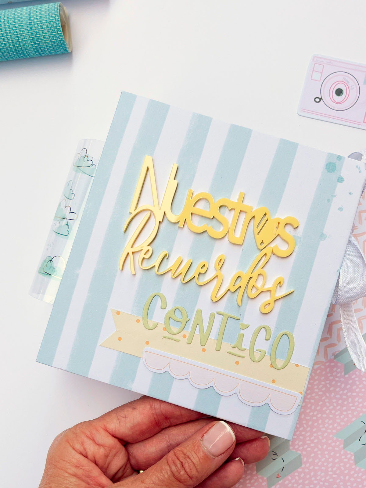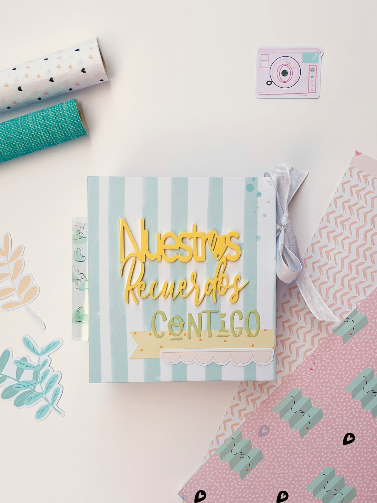 En la portada he puesto un metacrilato de Gigis’Lab en color amarillo que dice «Nuestros Recuerdos» y he troquelado la palabra «Contigo» con el troquel de Sami Garra que es una monada, para que esa frase «Nuestros recuerdos contigo» sea el título del álbum.