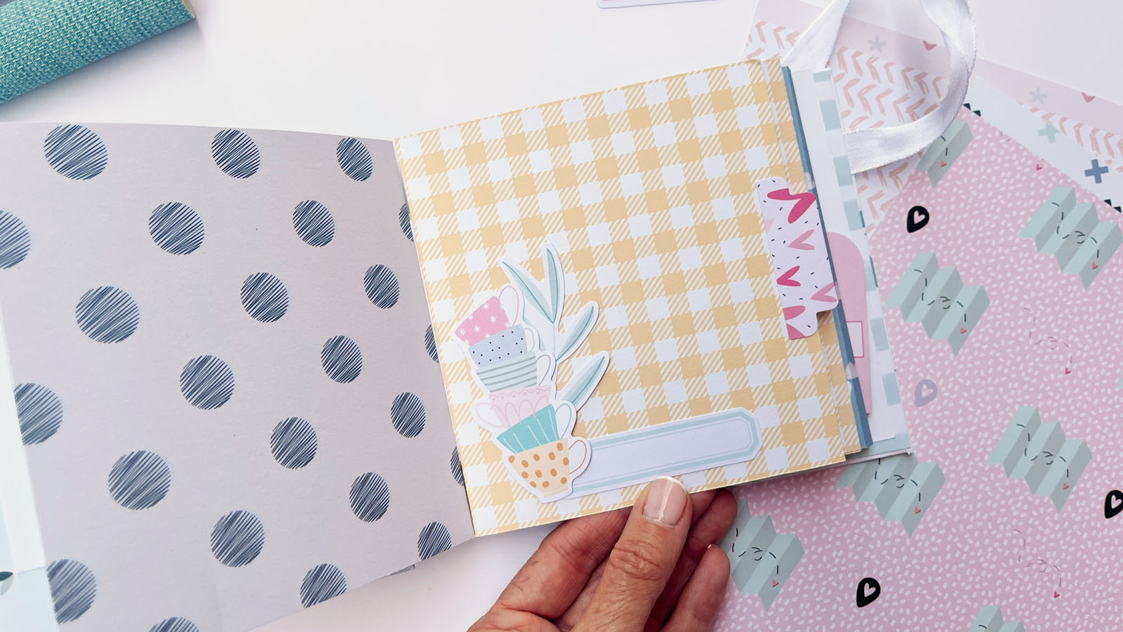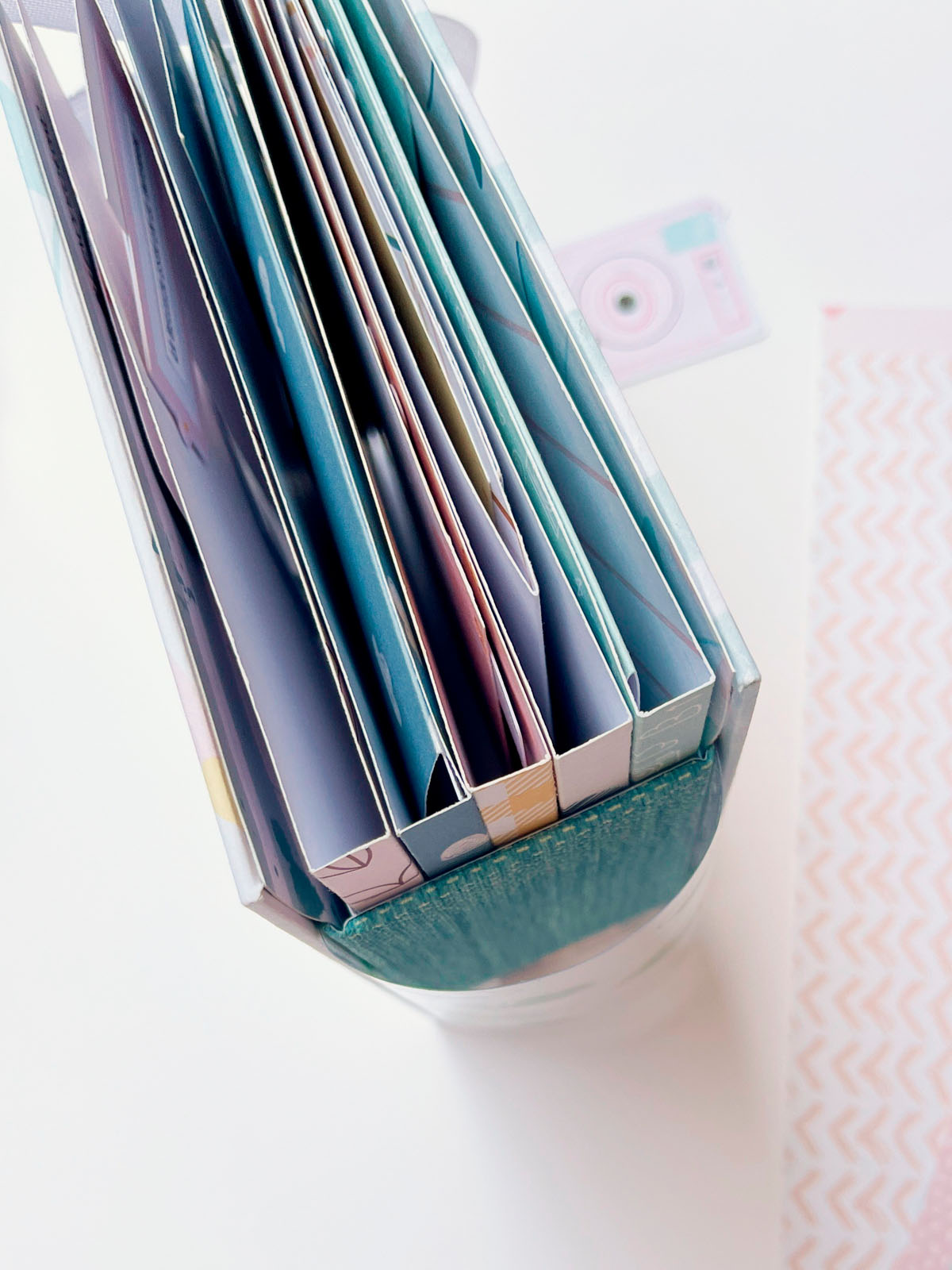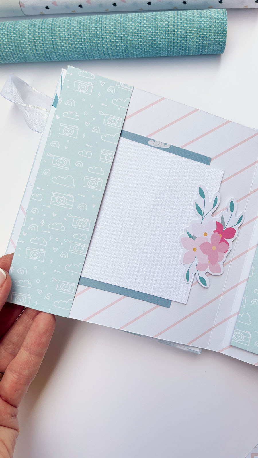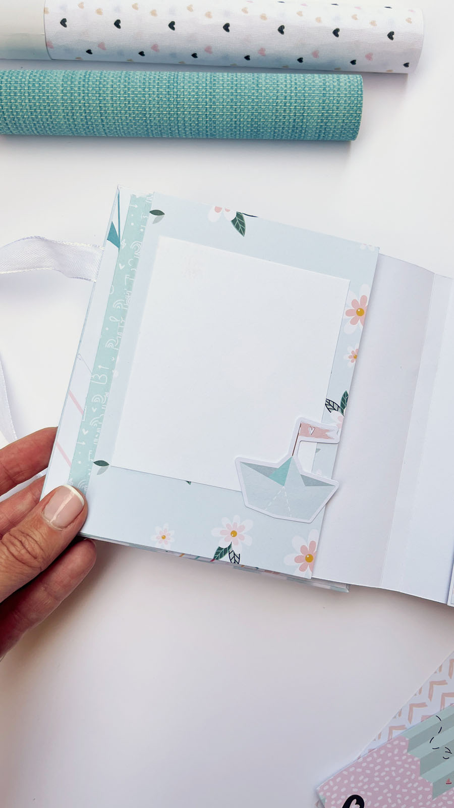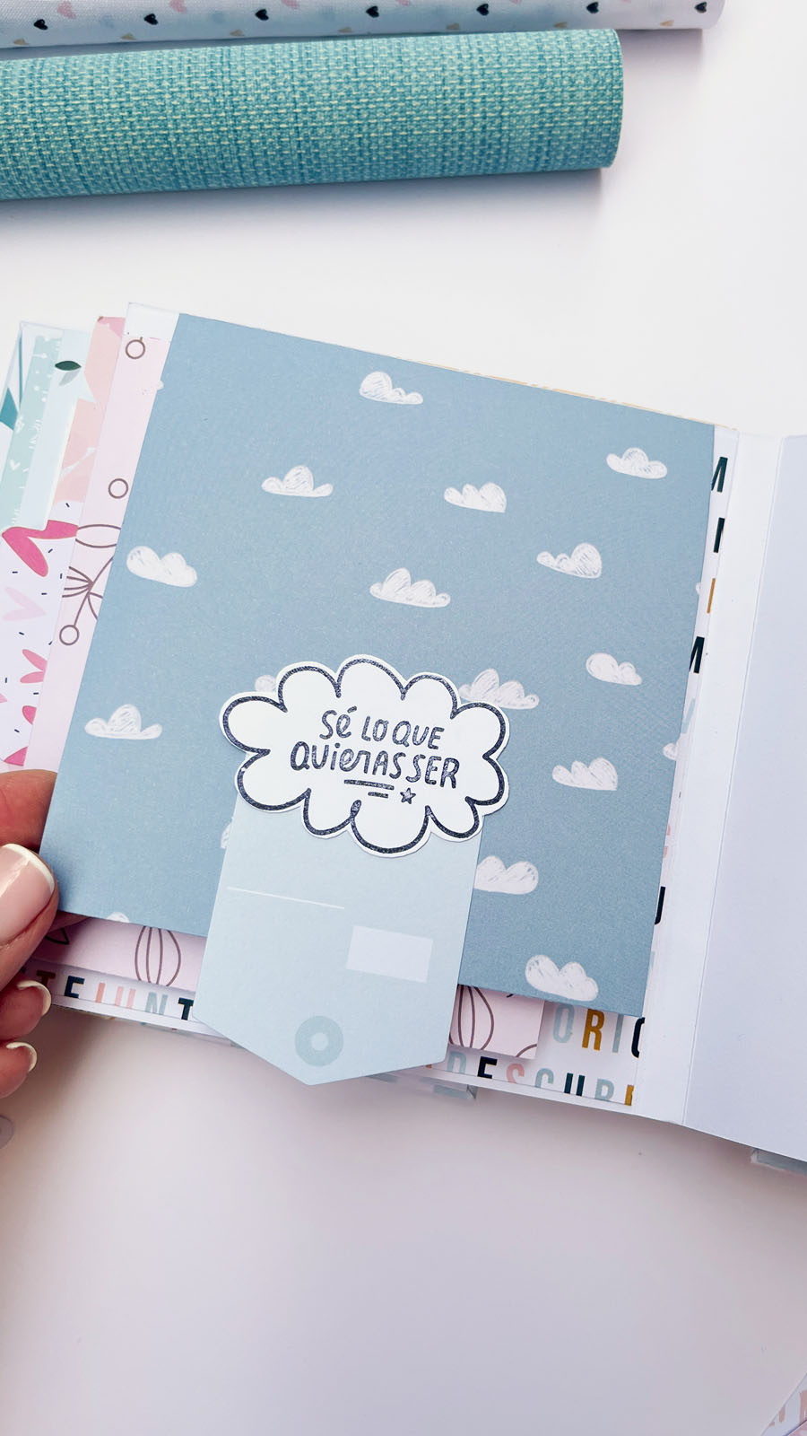 Este álbum tiene un lomo central visto que permite ver parte de la estructura hecha con carpetas de papel decorado. El lomo, además, lleva un acetato curvo sobrepuesto que le da un aire especial y diferente.