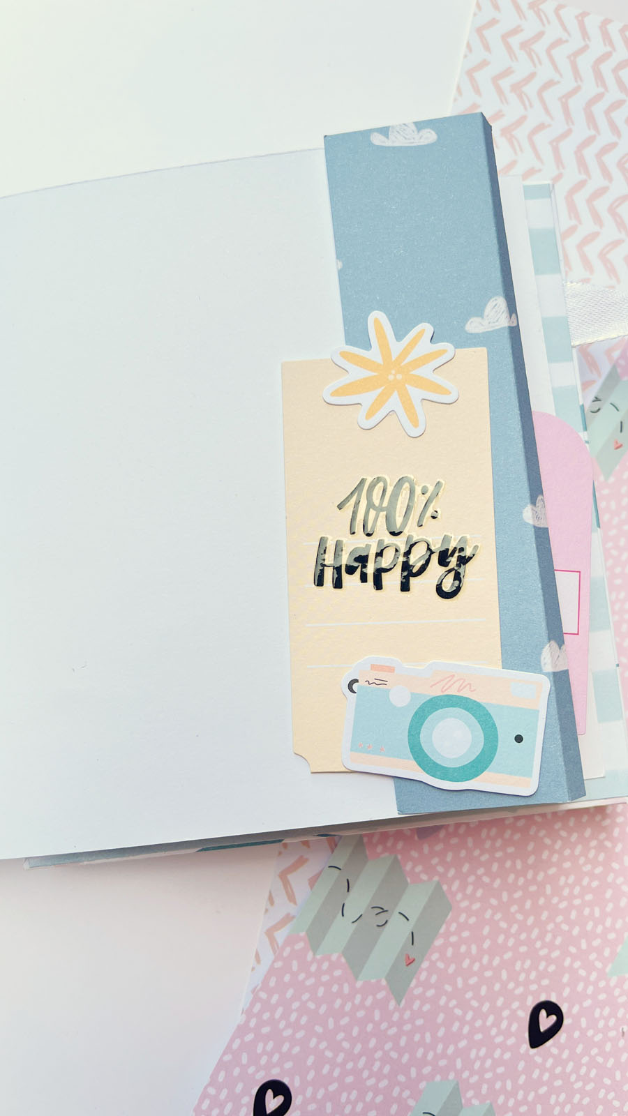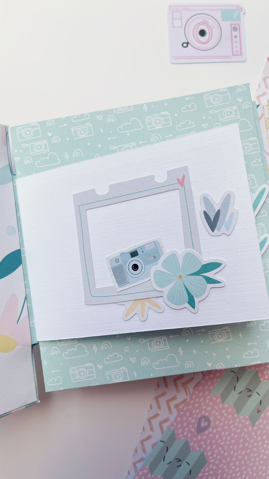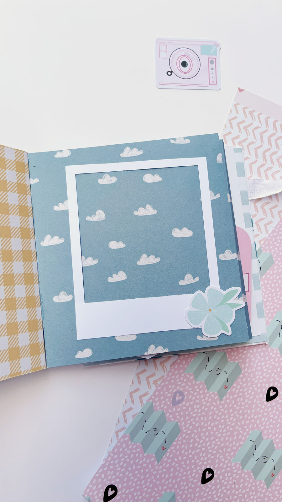 En el interior he añadido diferentes bolsillos y desplegables, perfectos para colocar fotos o pequeños recuerdos. También he utilizado algunos sellos de Lora Bailora de la colección Little M, que encajan perfectamente con el estilo alegre del álbum.