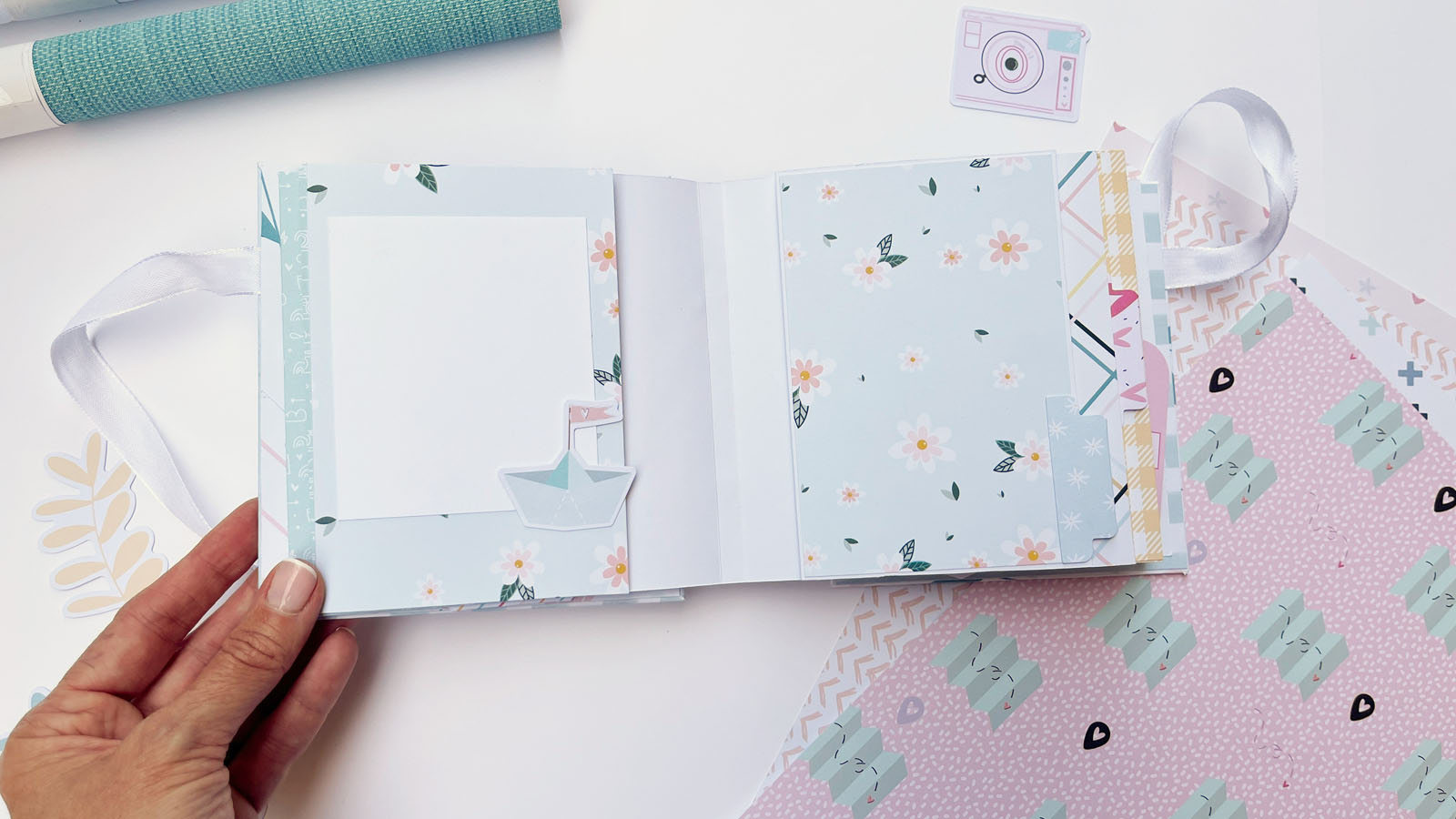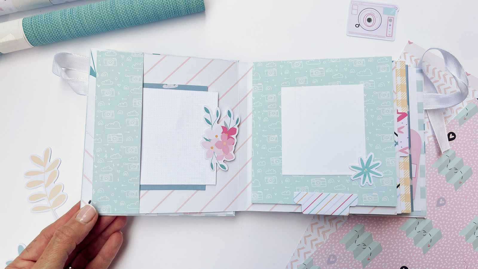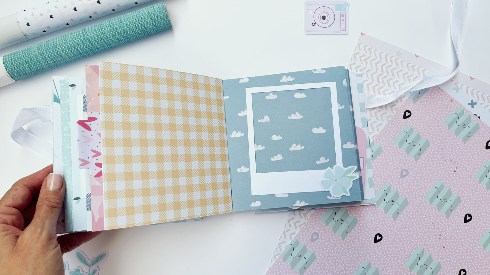 En el interior he añadido diferentes bolsillos y desplegables, perfectos para colocar fotos o pequeños recuerdos. También he utilizado algunos sellos de Lora Bailora de la colección Little M, que encajan perfectamente con el estilo alegre del álbum.