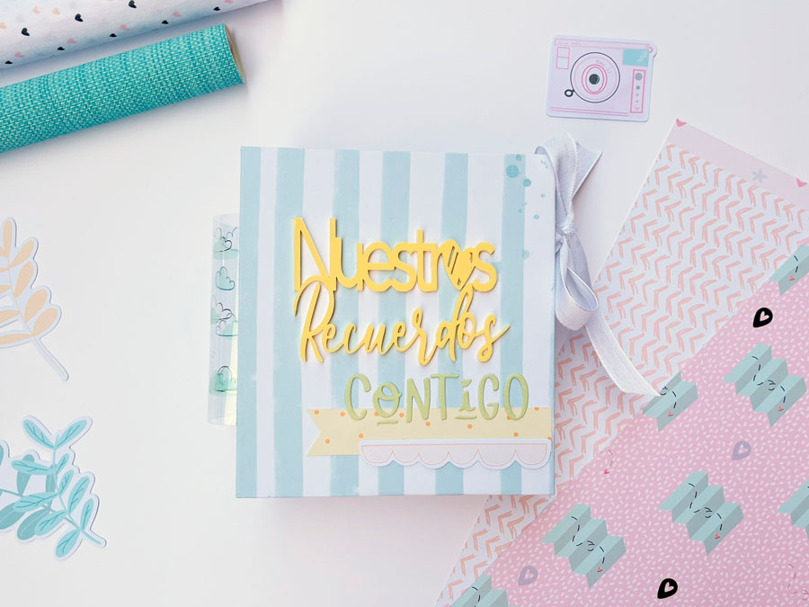 En la portada he puesto un metacrilato de Gigis’Lab en color amarillo que dice «Nuestros Recuerdos» y he troquelado la palabra «Contigo» con el troquel de Sami Garra que es una monada, para que esa frase «Nuestros recuerdos contigo» sea el título del álbum.