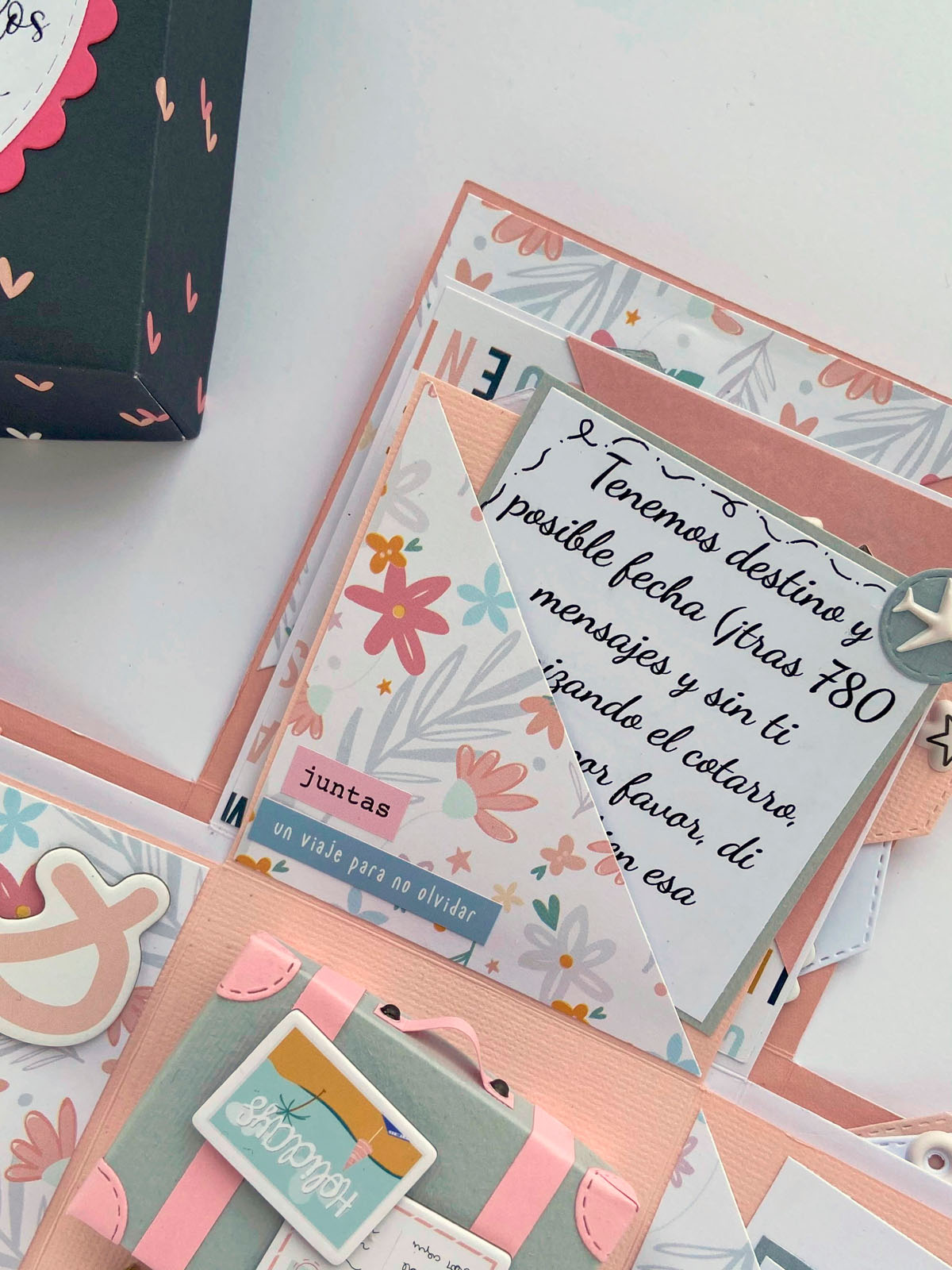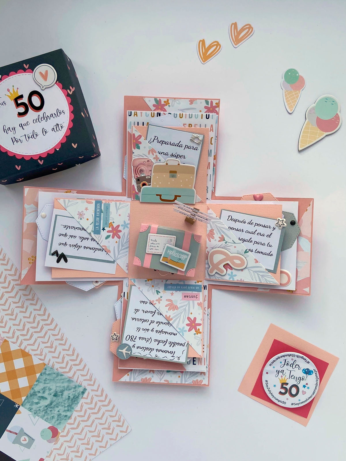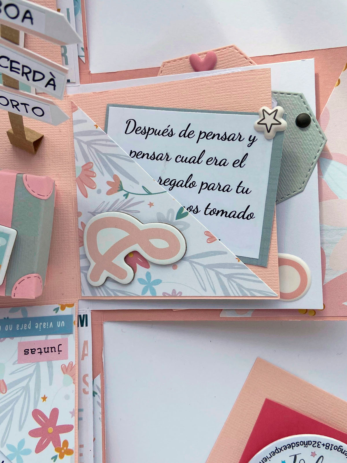 Por fuera era una caja bastante sencilla, hecha con papeles de la colección Plántate de Dunaon y con diecuts y frases. La tapa lleva un mensaje que decía: «Tus 50 hay que celebrarlos por todo lo alto», acompañado de algunos detalles decorativos muy sencillos. Al abrirla, aparece el interior con todos los laterales decorados y varios bolsillos donde he colocado tarjetas y mensajes. En cada bolsillo hay pequeñas frases y pistas que van desvelando poco a poco el regalo. La idea era que, a medida que se leen los mensajes se entienda que el cumpleaños venía con una experiencia que íbamos a vivir juntas (¡y eso era lo mejor de todo!).