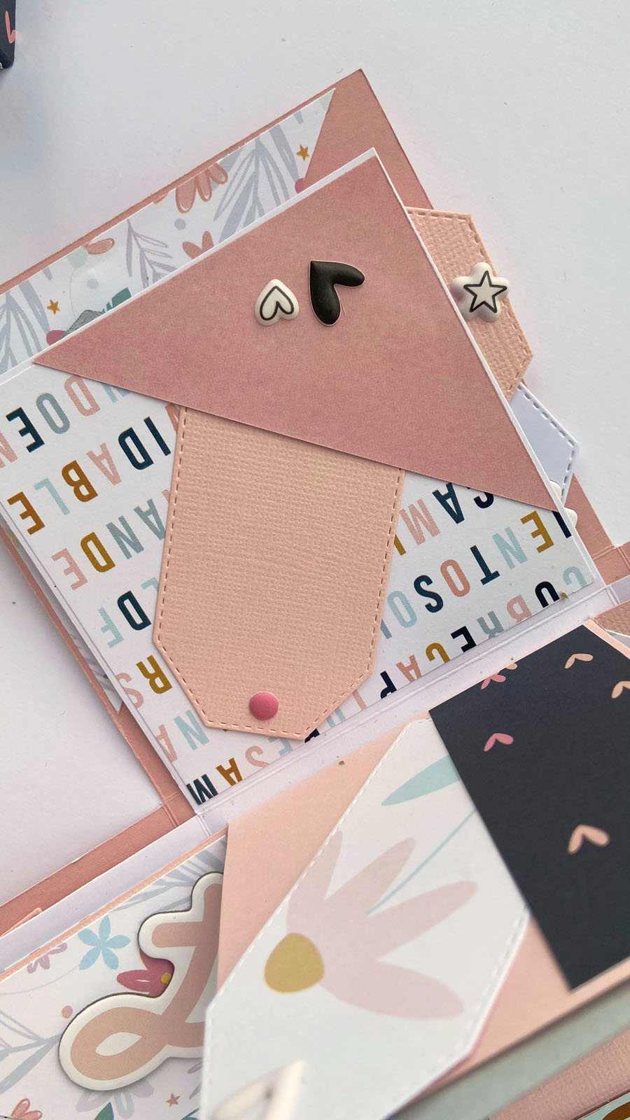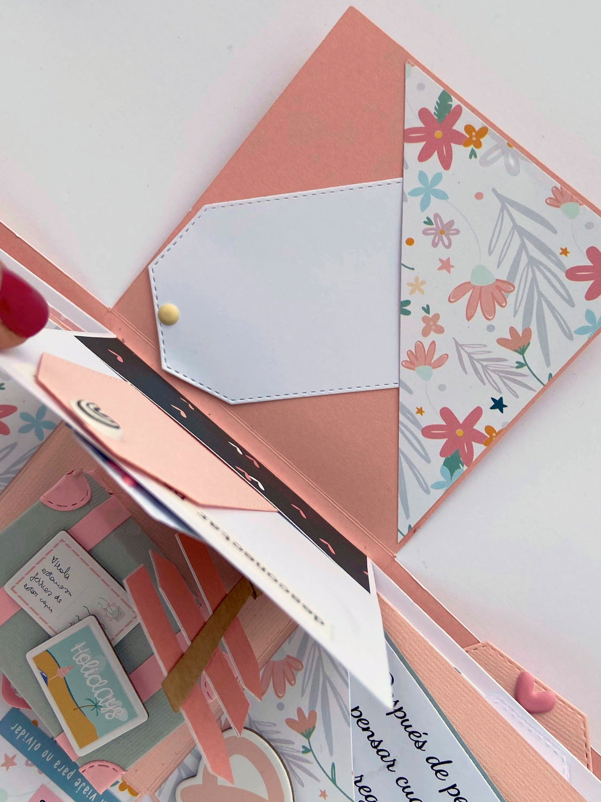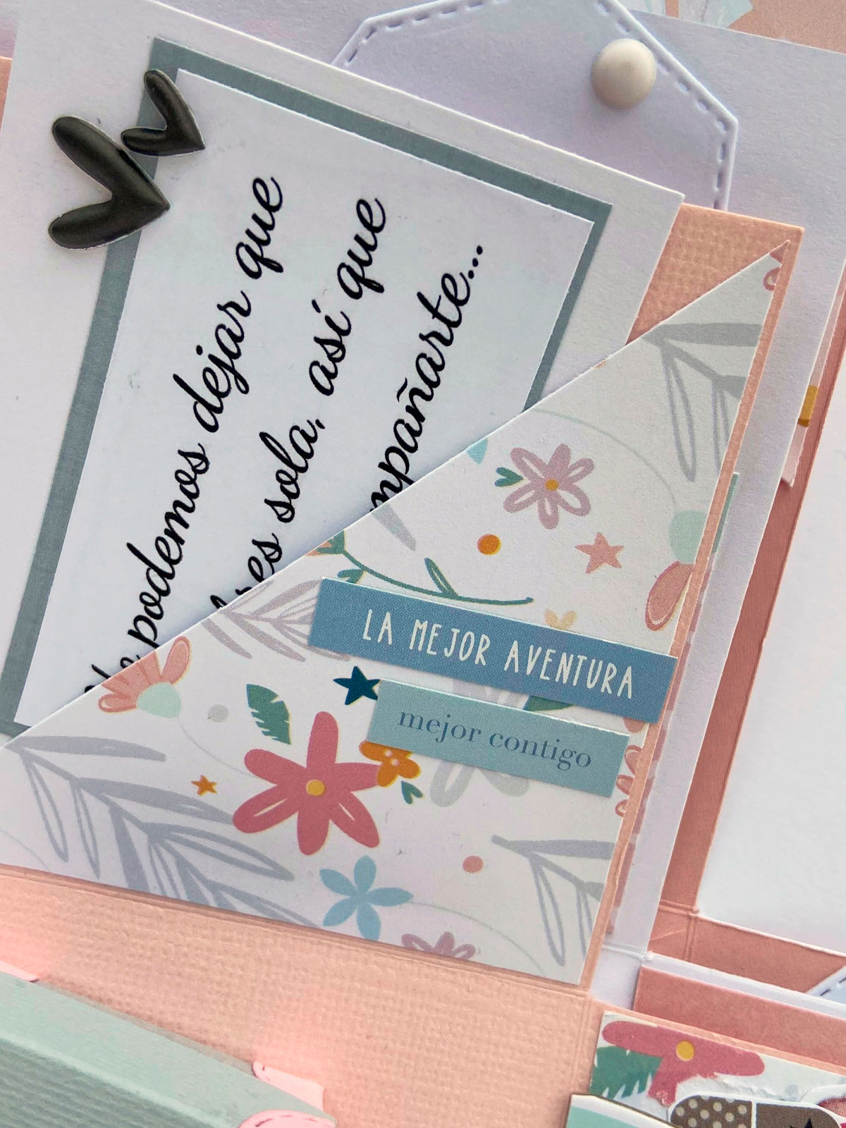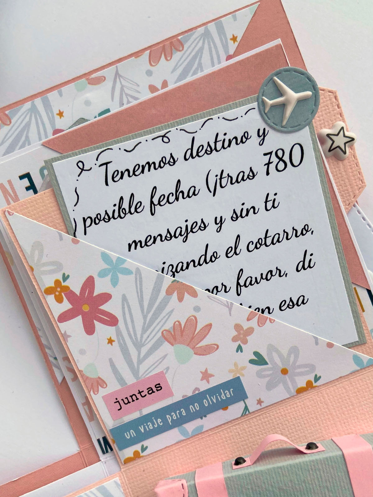 Por fuera era una caja bastante sencilla, hecha con papeles de la colección Plántate de Dunaon y con diecuts y frases. La tapa lleva un mensaje que decía: «Tus 50 hay que celebrarlos por todo lo alto», acompañado de algunos detalles decorativos muy sencillos. Al abrirla, aparece el interior con todos los laterales decorados y varios bolsillos donde he colocado tarjetas y mensajes. En cada bolsillo hay pequeñas frases y pistas que van desvelando poco a poco el regalo. La idea era que, a medida que se leen los mensajes se entienda que el cumpleaños venía con una experiencia que íbamos a vivir juntas (¡y eso era lo mejor de todo!).