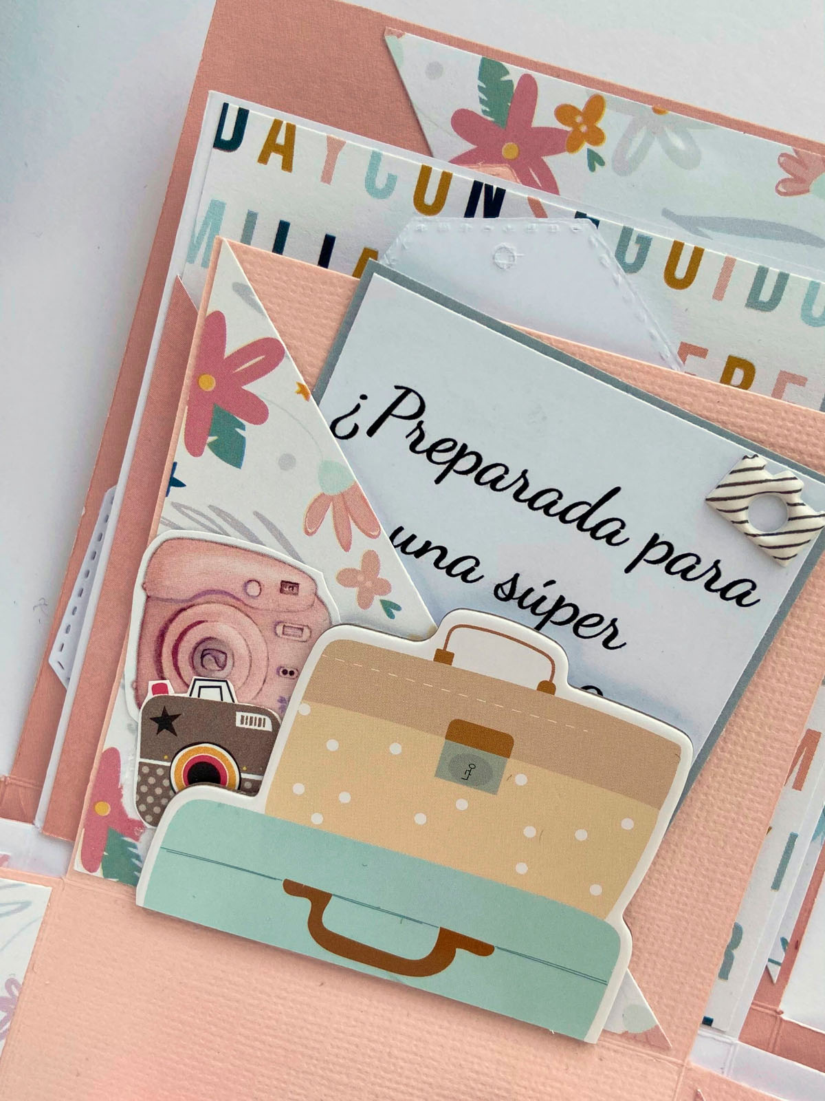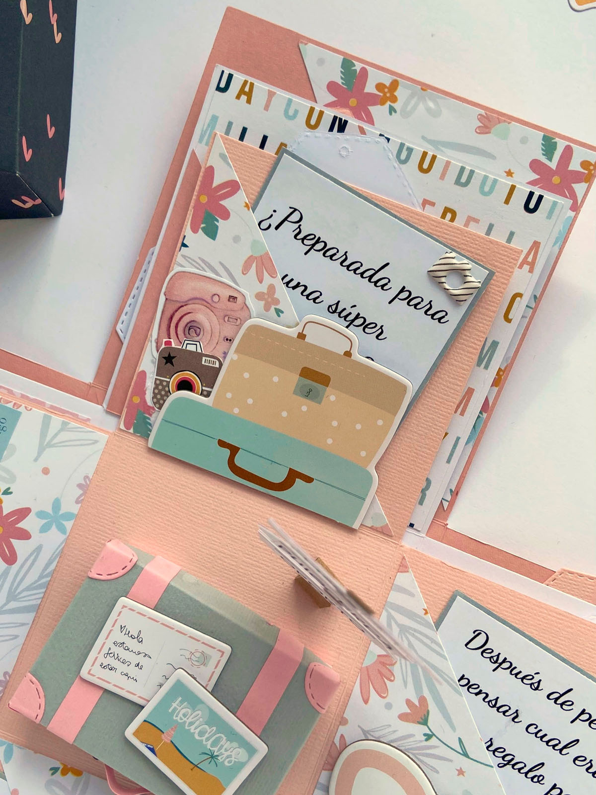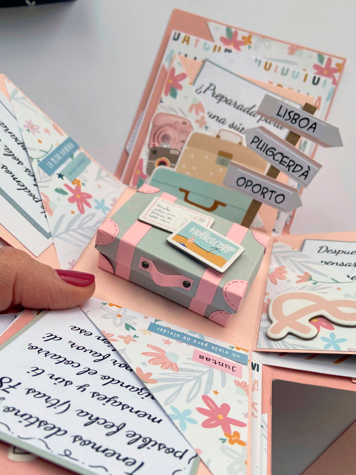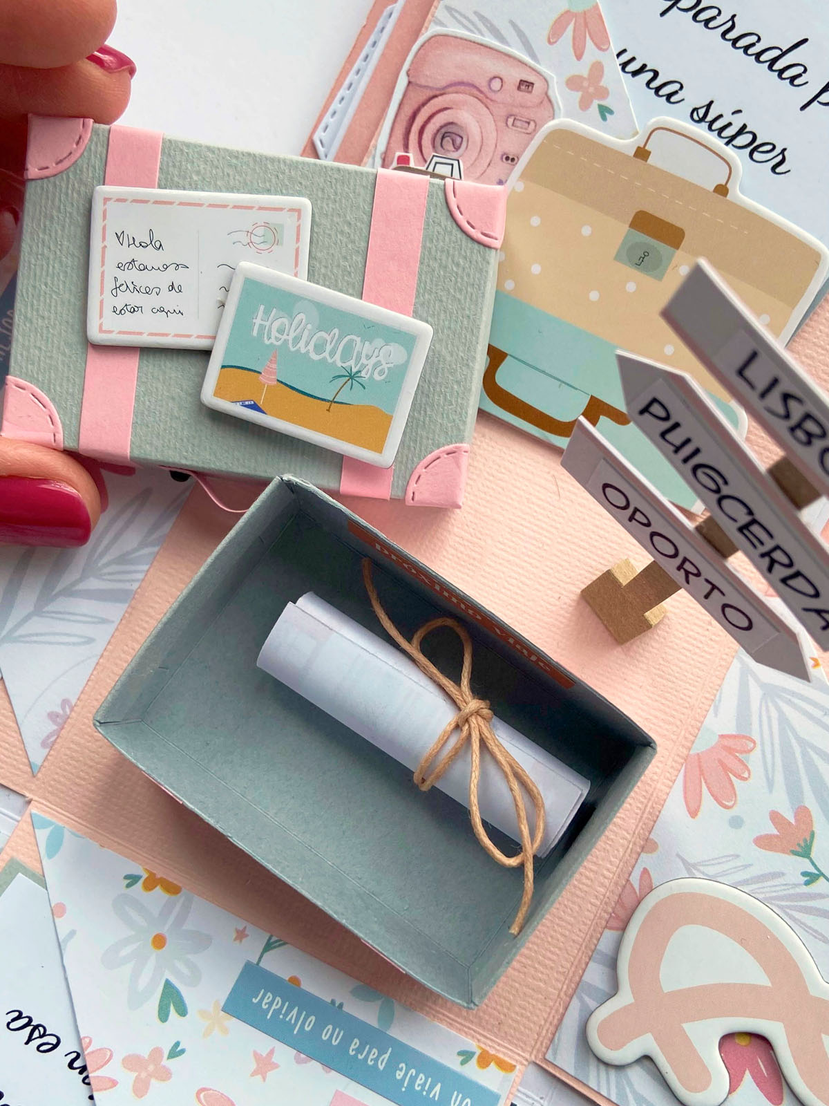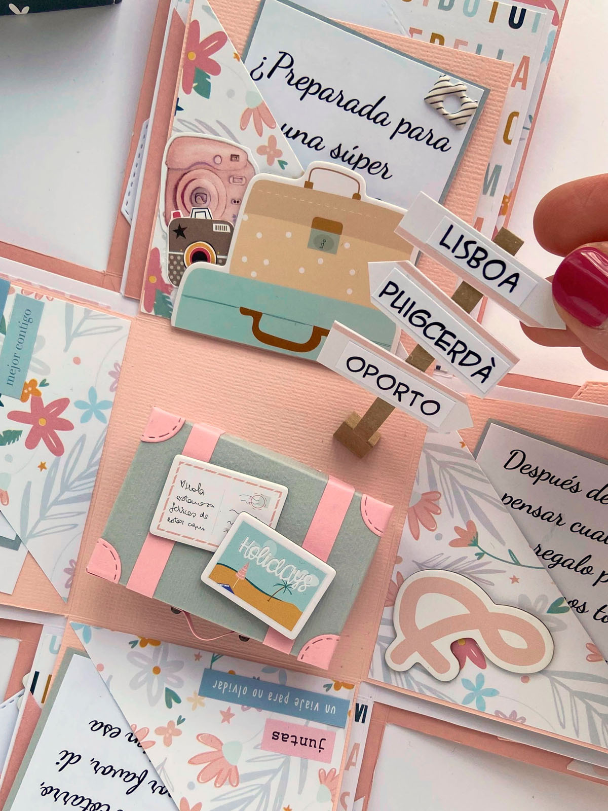 Alrededor de la caja diferentes solapas con distintos bolsillos, con tarjetas donde hay mensajes relacionados tanto con el regalo como con nuestra amistad. Y así, al ir abriendo cada parte, se van descubriendo todos los detalles poco a poco hasta llegar al billete escondido dentro de la maleta.