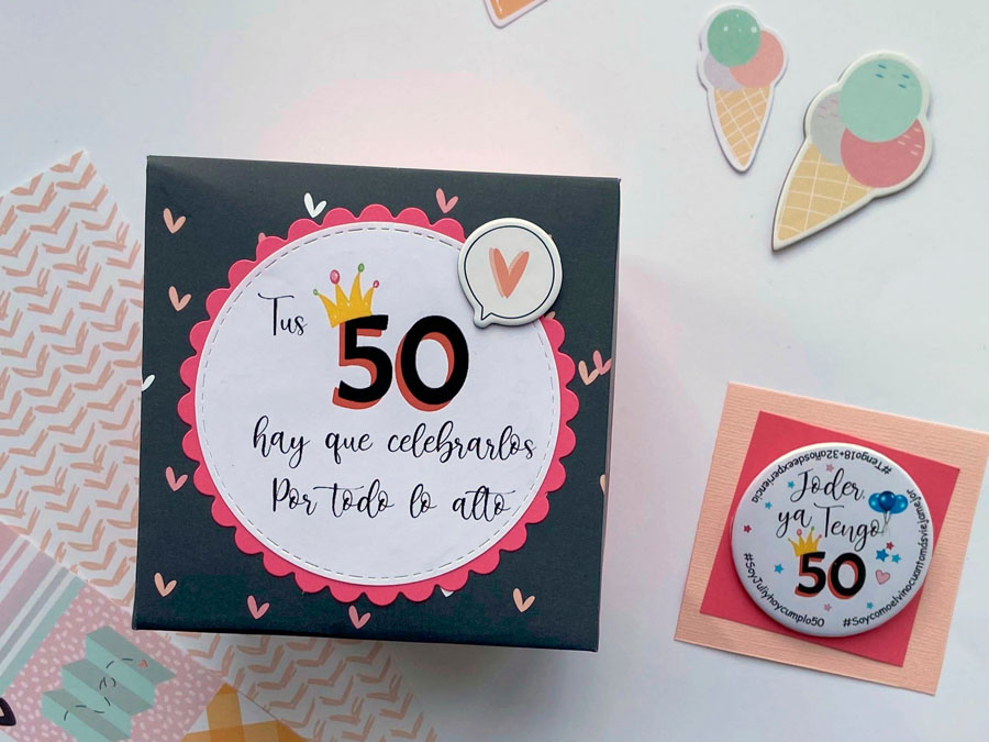 Para acompañar la caja, hice una chapa a juego personalizada con la frase: «Joder ya tengo 50», con algunas frases y # alrededor. Ya veis que es un proyecto muy sencillo pero que va genial para esconder otro regalo… además, queda muy especial cuando su interior cuenta una historia o guarda otra sorpresa, no os parece?