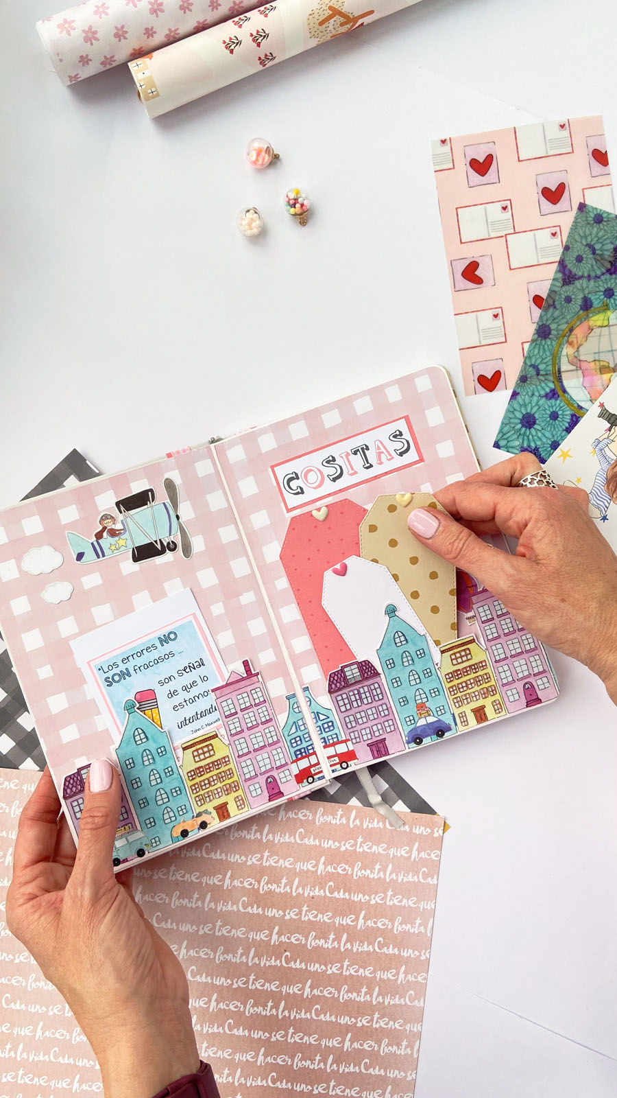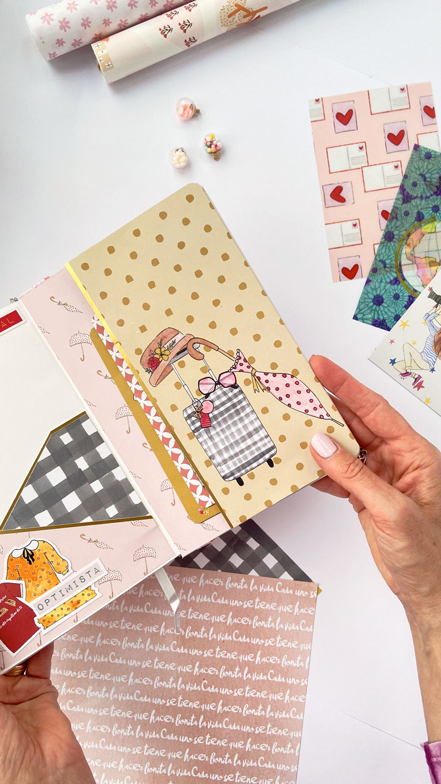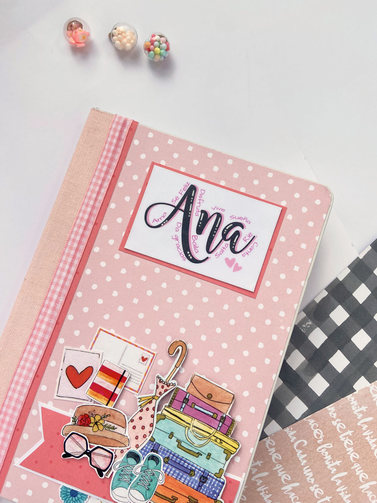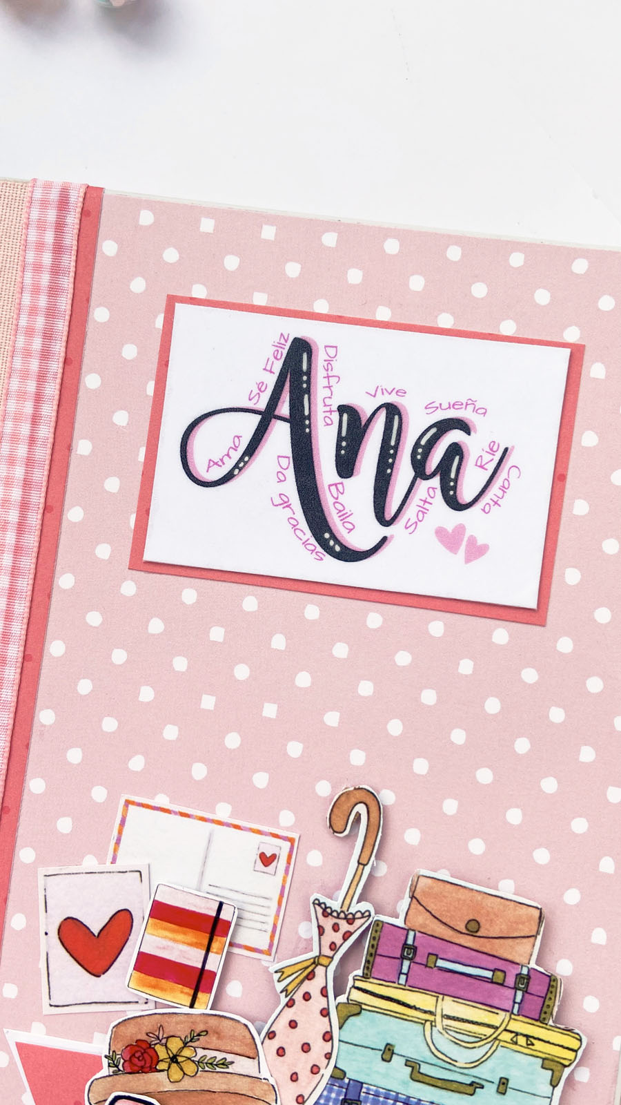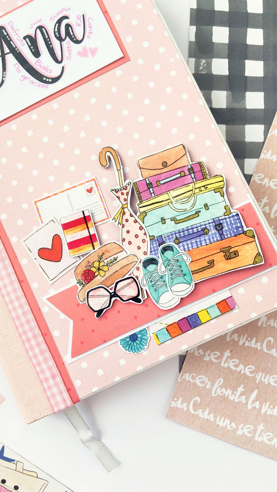 Bueno a lo que vamos! La libreta es en tonos rosas combinados con detalles en dorado, que le dan ese toque diferente. En la portada he usado tela de encuadernar para el lomo, y papel decorado rosa con lunares blancos. Unas tiras en vertical decorando y además tapando la unión del lomo con el papel y muchos diecuts a diferentes alturas. El resultado es ese aire de viaje, de sueños, de cosas bonitas… El nombre lo he diseñado en photoshop, añadiendo alrededor palabras bonitas como Disfruta, Sonríe, Da gracias… y cosas así. Y creo que el resultado es muy cuki. Por dentro he ido añadiendo bolsillitos, tarjetitas con frases positivas y detalles para que pueda guardar sus cositas, recuerdos o lo que ella quiera.