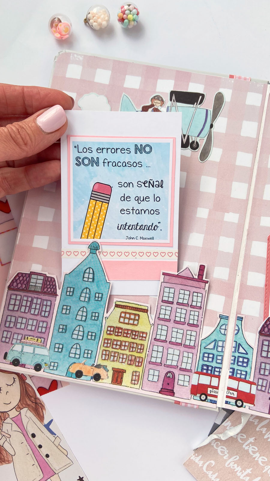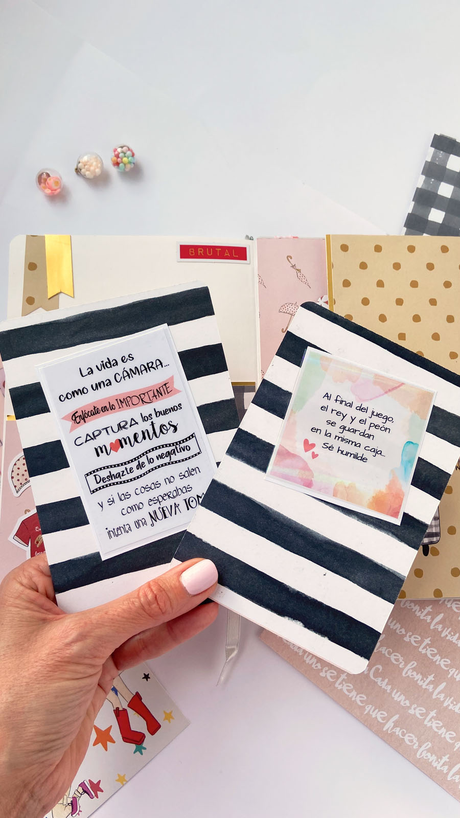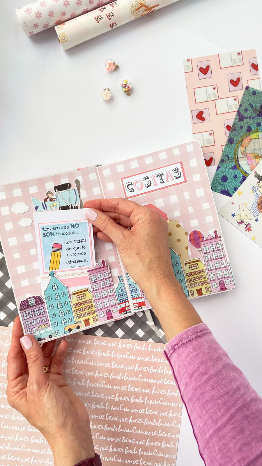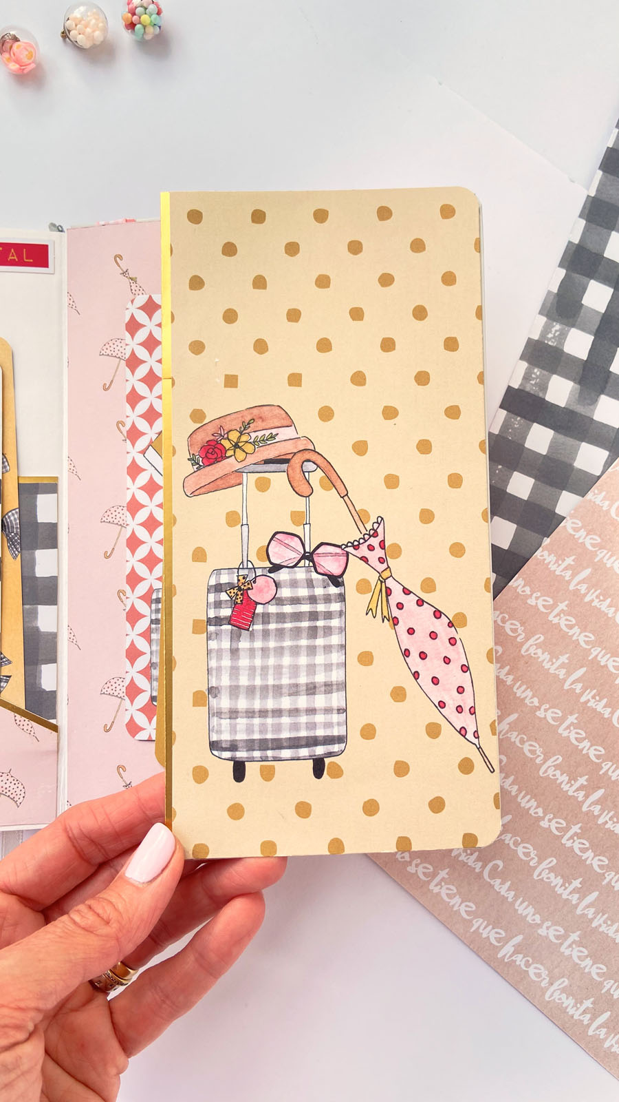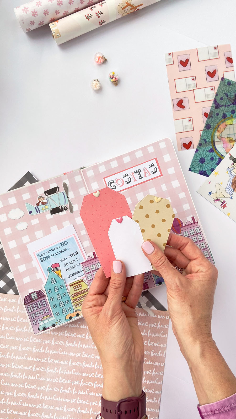 Bueno a lo que vamos! La libreta es en tonos rosas combinados con detalles en dorado, que le dan ese toque diferente. En la portada he usado tela de encuadernar para el lomo, y papel decorado rosa con lunares blancos. Unas tiras en vertical decorando y además tapando la unión del lomo con el papel y muchos diecuts a diferentes alturas. El resultado es ese aire de viaje, de sueños, de cosas bonitas… El nombre lo he diseñado en photoshop, añadiendo alrededor palabras bonitas como Disfruta, Sonríe, Da gracias… y cosas así. Y creo que el resultado es muy cuki. Por dentro he ido añadiendo bolsillitos, tarjetitas con frases positivas y detalles para que pueda guardar sus cositas, recuerdos o lo que ella quiera.