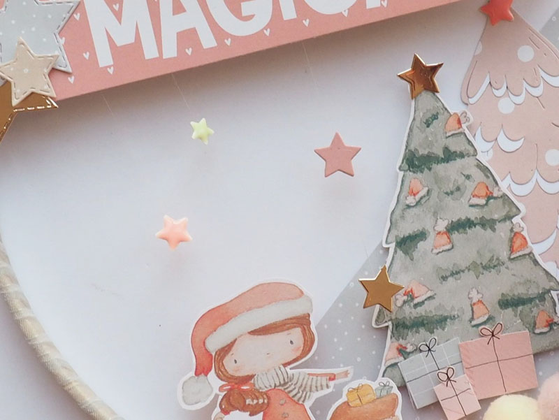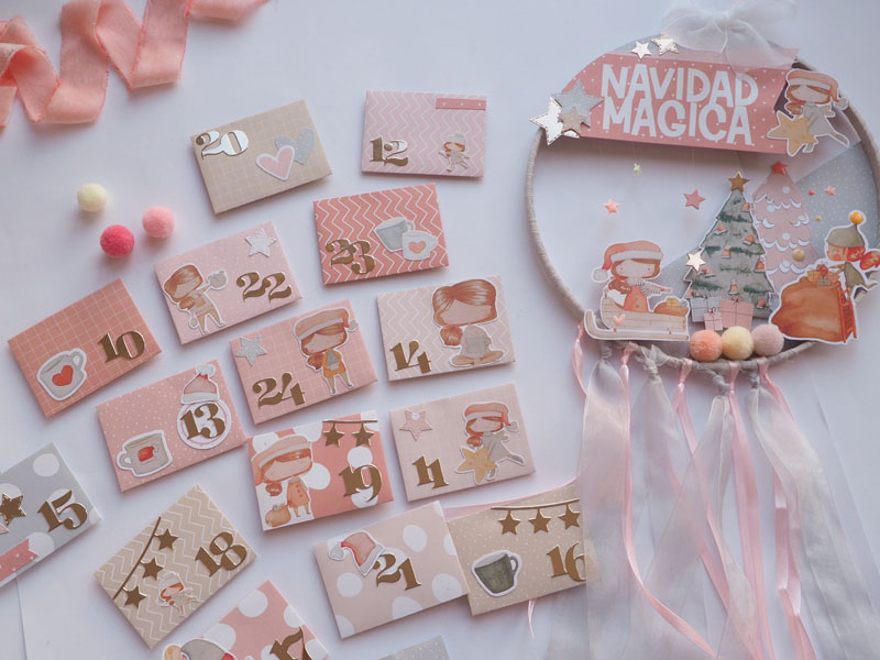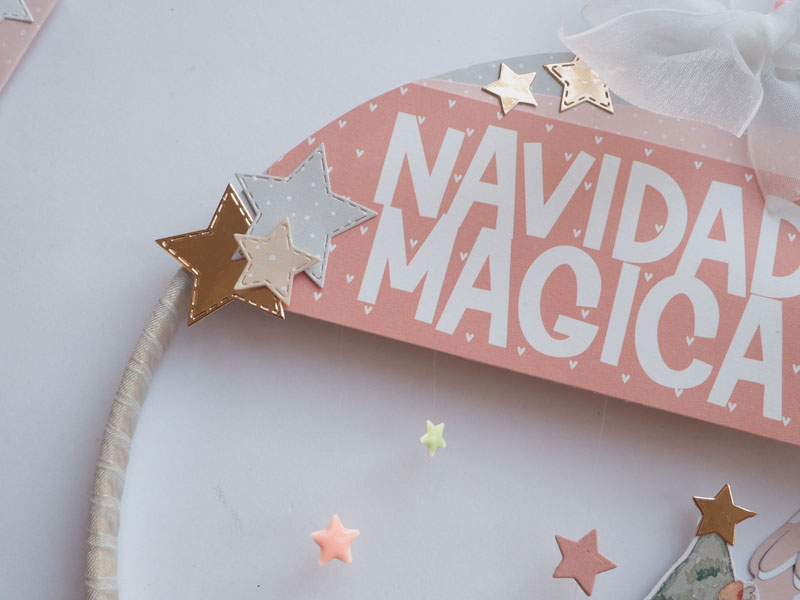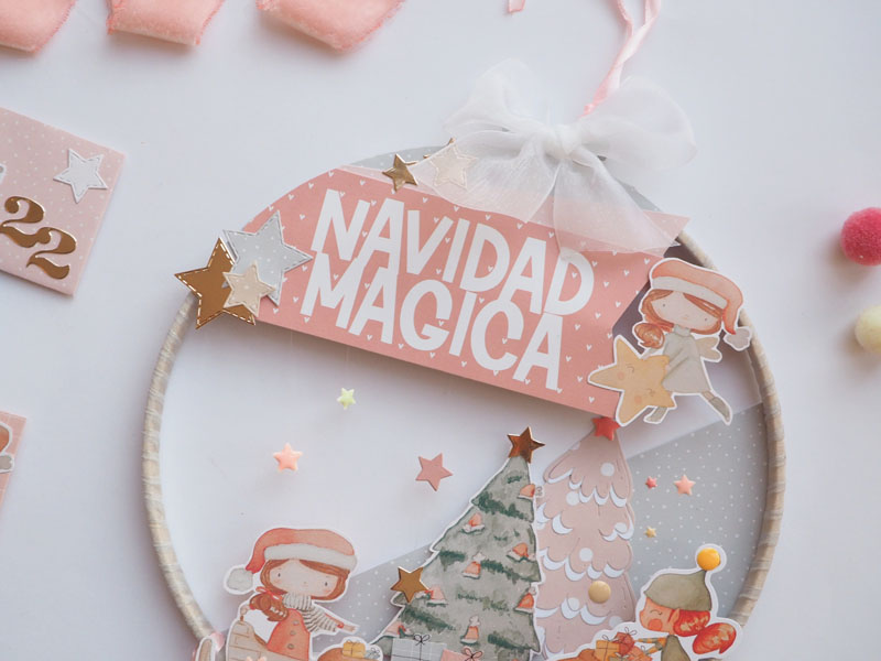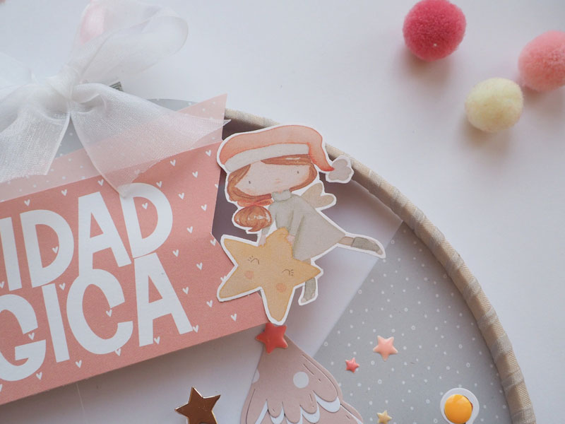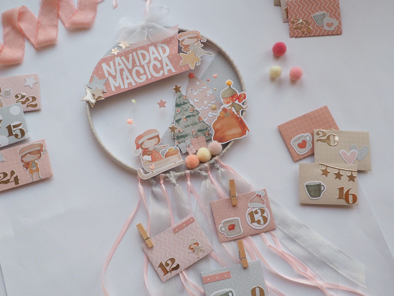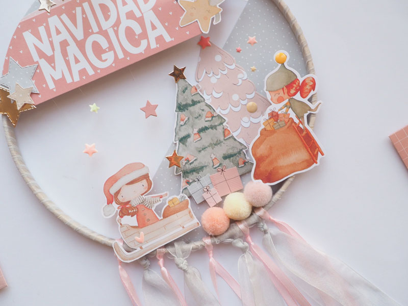 Es un bastidor atrapasueños, decorado con la colección Mazapán de Alua Cid. Con papel decorado, die cuts, estrellas troqueladas y un árbol rosa y blanco hecho con el troquel de Lora Bailora. También lleva unos pompones y unas estrellas atadas con hilo de pescar para que se vean como flotando. Por abajo unos lazos de organza que sirven para sujetar los 24 sobrecitos…