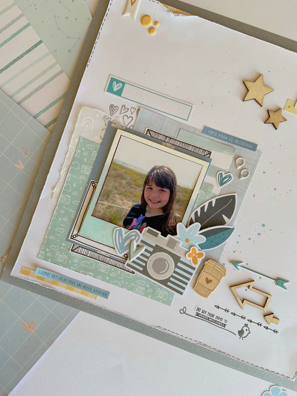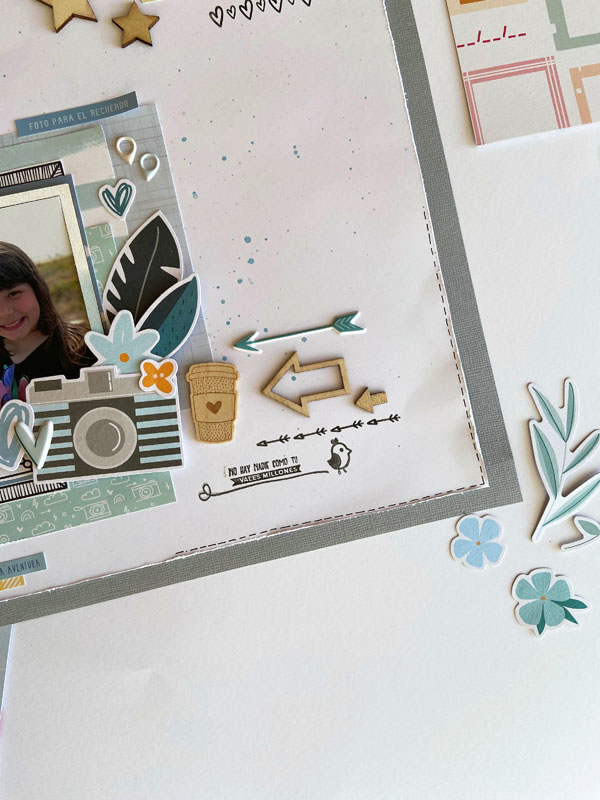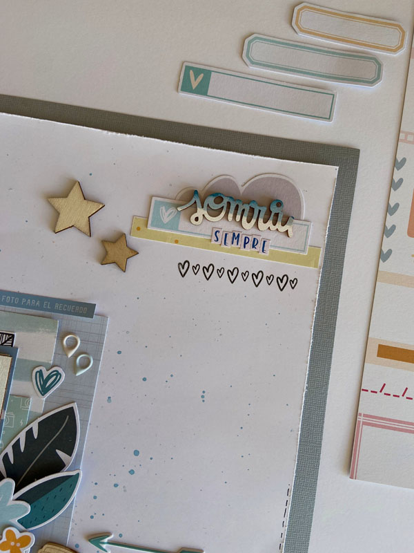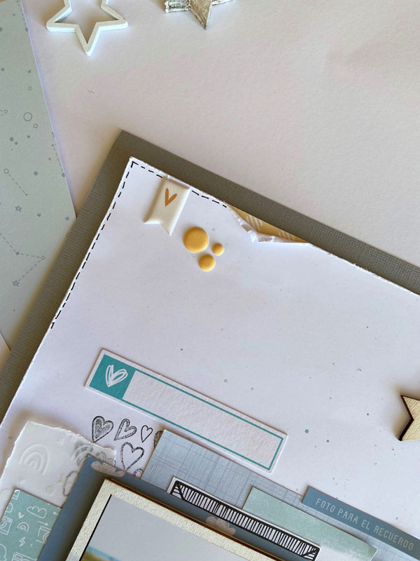 Como veréis la caja va pintada con una base de pintura chalk paint rosa fucsia y otra capa de color blanco encima. Luego decorada con papeles y diecuts de varias colecciones… el papel de la tapa es un papel de la colección «Eres Arte» de The Mint Feather. Y luego los diecuts y recortables son de la colección Cornie de Mandarina and lima, una colección muy dulce de bebé… Por dentro también forrada y con una frase en interior de la tapa que dice: Vuela tan alto como te lleven tus sueños…